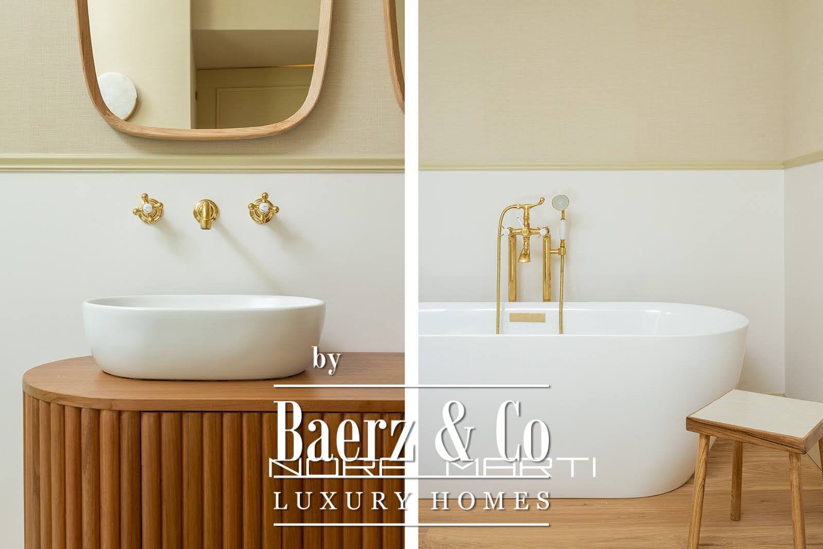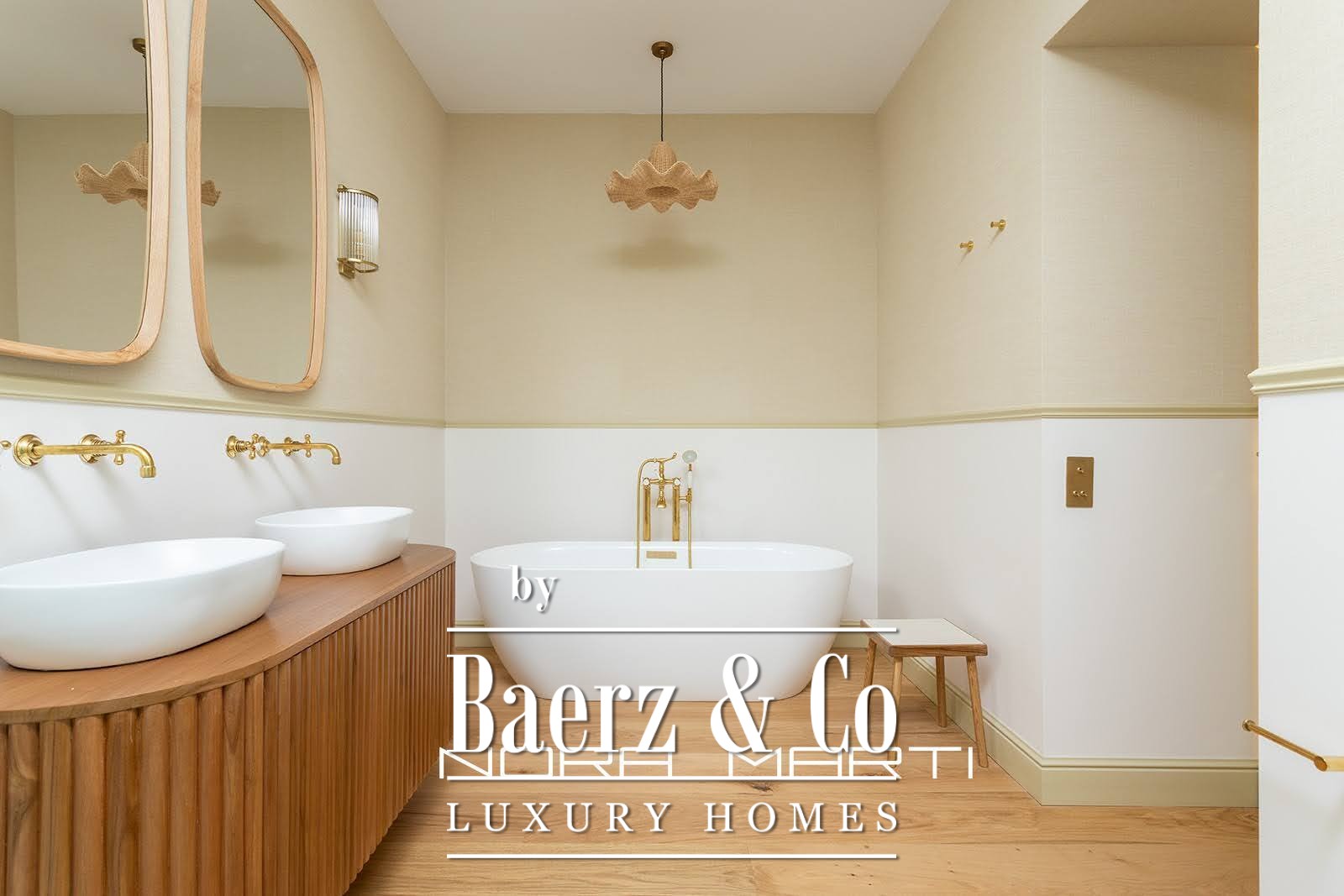The interior design incorporates natural elements to create a warm and modern feel while maintaining an air of elegance. All three exterior bedrooms feature large double beds, built-in wardrobes, and en-suite bathrooms. The aged brass bathroom fixtures are from a local Catalan company known for its design and quality. Natural oak flooring covers the entire apartment; the wider-than-usual planks suggest a more modern approach to traditional, high-quality flooring. Underfloor heating throughout offers understated luxury, as does the dual-zone climate control system, adjustable in each room. The light fixtures, sourced from both Catalonia and England, feature decorative and functional pieces, including vintage and antique elements. The apartment's inviting green terrace adds another dimension, a space for entertaining, relaxing, and enjoying the feeling of spaciousness in the heart of Barcelona.