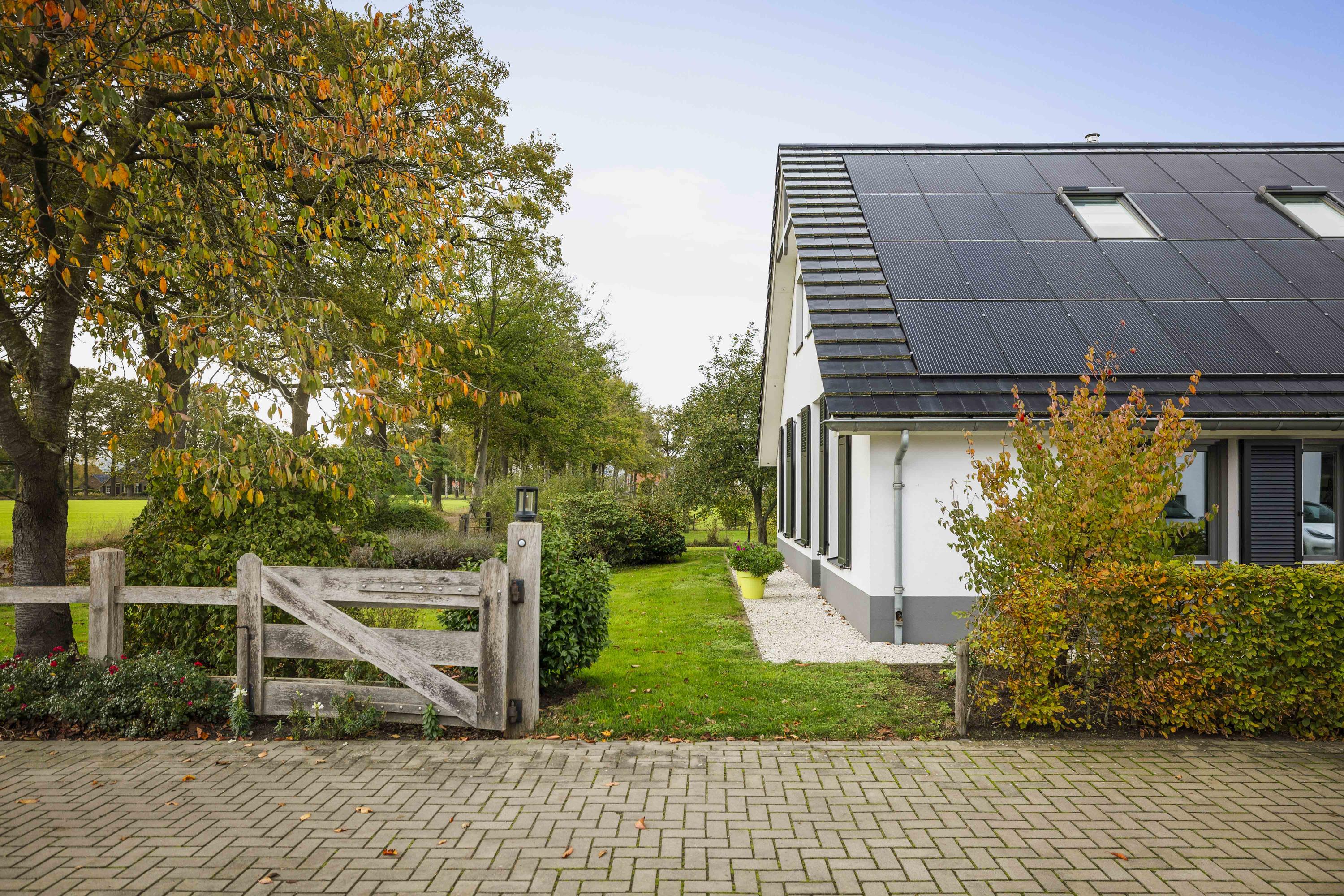 This magnificent farmhouse took on its current form in 2016, when the farm, which was built in 1924, was completely renovated. The emphasis was on sustainability: the exterior was fully insulated with polystyrene blocks, the house was fitted with new HR+++ glass all around, a water-water heat pump was installed (which exchanges and extracts heat at a depth of 75 metres), the interior floor was fitted with a robust cast floor – ideal in combination with underfloor heating – and a total of 110 (no, this is not a typo) solar panels were installed on the roofs. Under the bonnet, this house is all state-of-the-art technical ingenuity. Even the colour palette – the exterior is whitewashed with grey woodwork and beaded edging – contributes to the energy-efficient character of the house, because while the white facades reflect sunlight, the grey absorbs heat. Not only does this house have zero energy consumption, it also generates a considerable amount of energy! A home battery is therefore an excellent addition here.