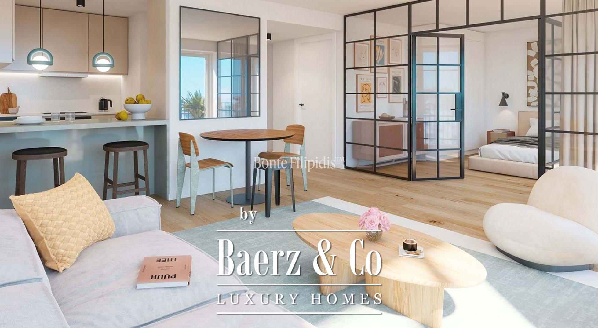 A rooftop pool crowns the terrace, offering an exclusive vantage point over the waterfront. Four bedrooms, including two suites, are situated on the upper floor, each bathed in natural light and benefitting from balcony access. The primary suite, with a generous layout, opens directly onto outdoor space, ensuring privacy and a feeling of retreat.