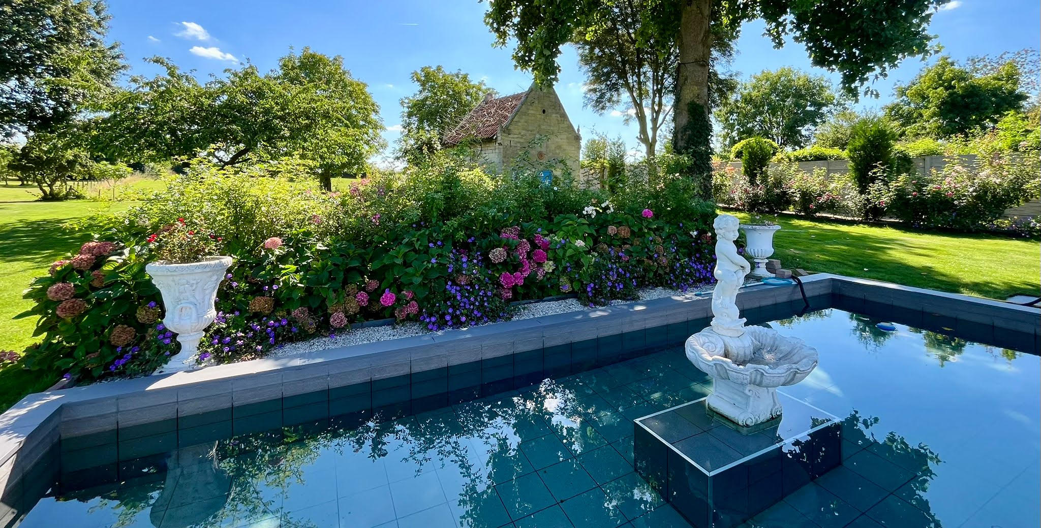 Tall historic entrance gates lead into a striking, fully paved courtyard composed in a single refined material palette. Château gravel, a large French fountain and sight lines toward the rare marlstone windmill lend the space a quiet, timeless grandeur. The courtyard serves as the serene centre of the estate – a place where light, order, peace and quite converge.