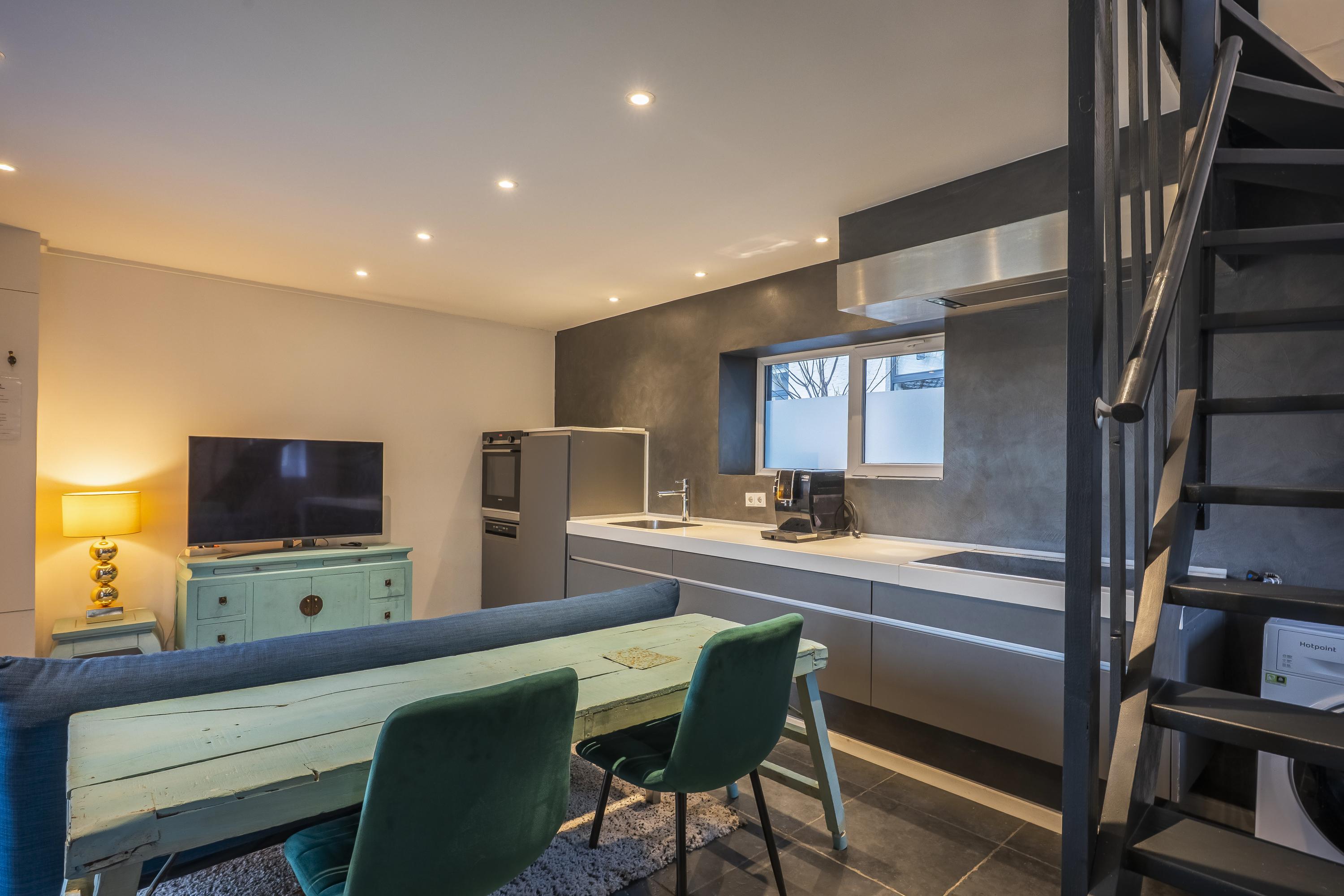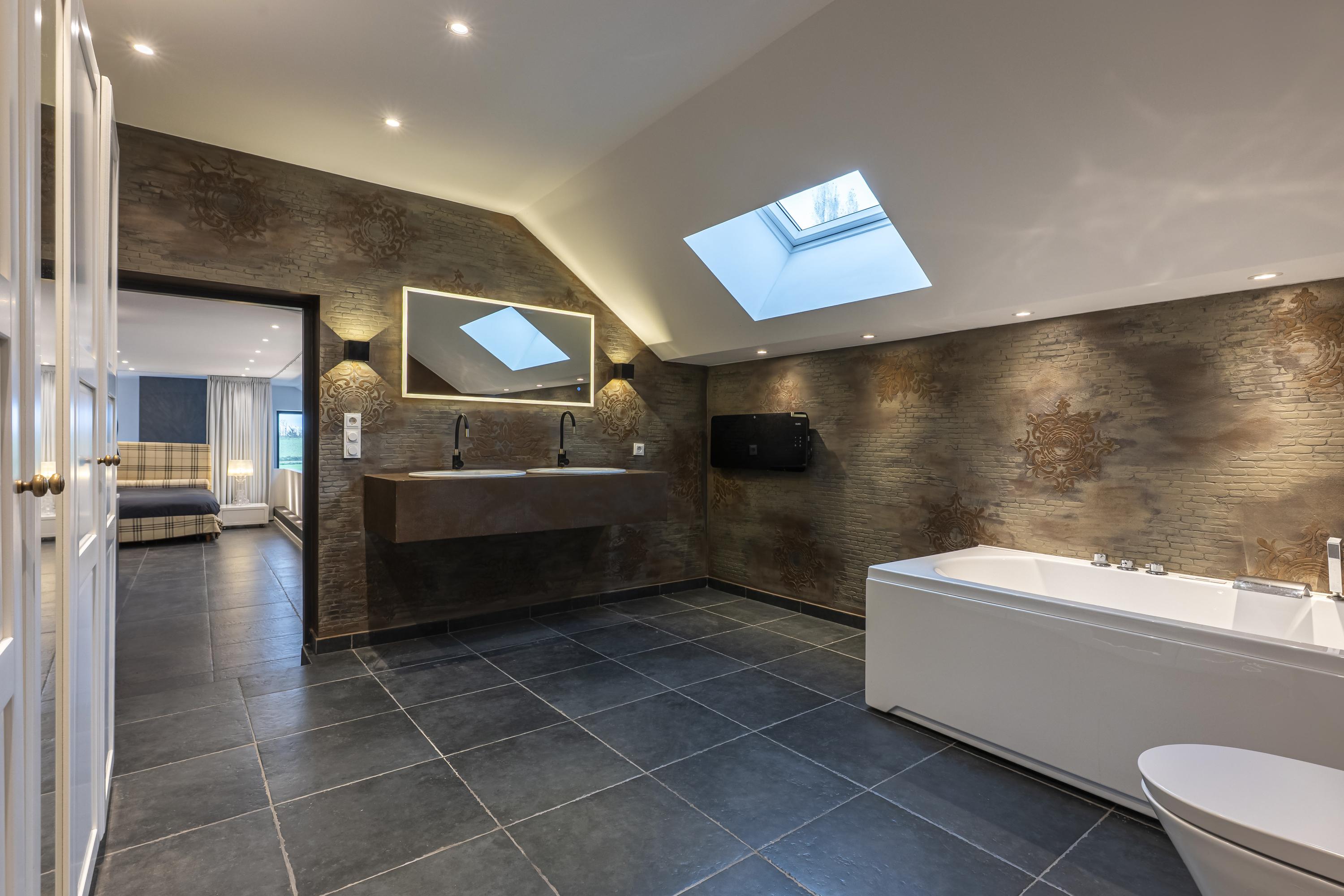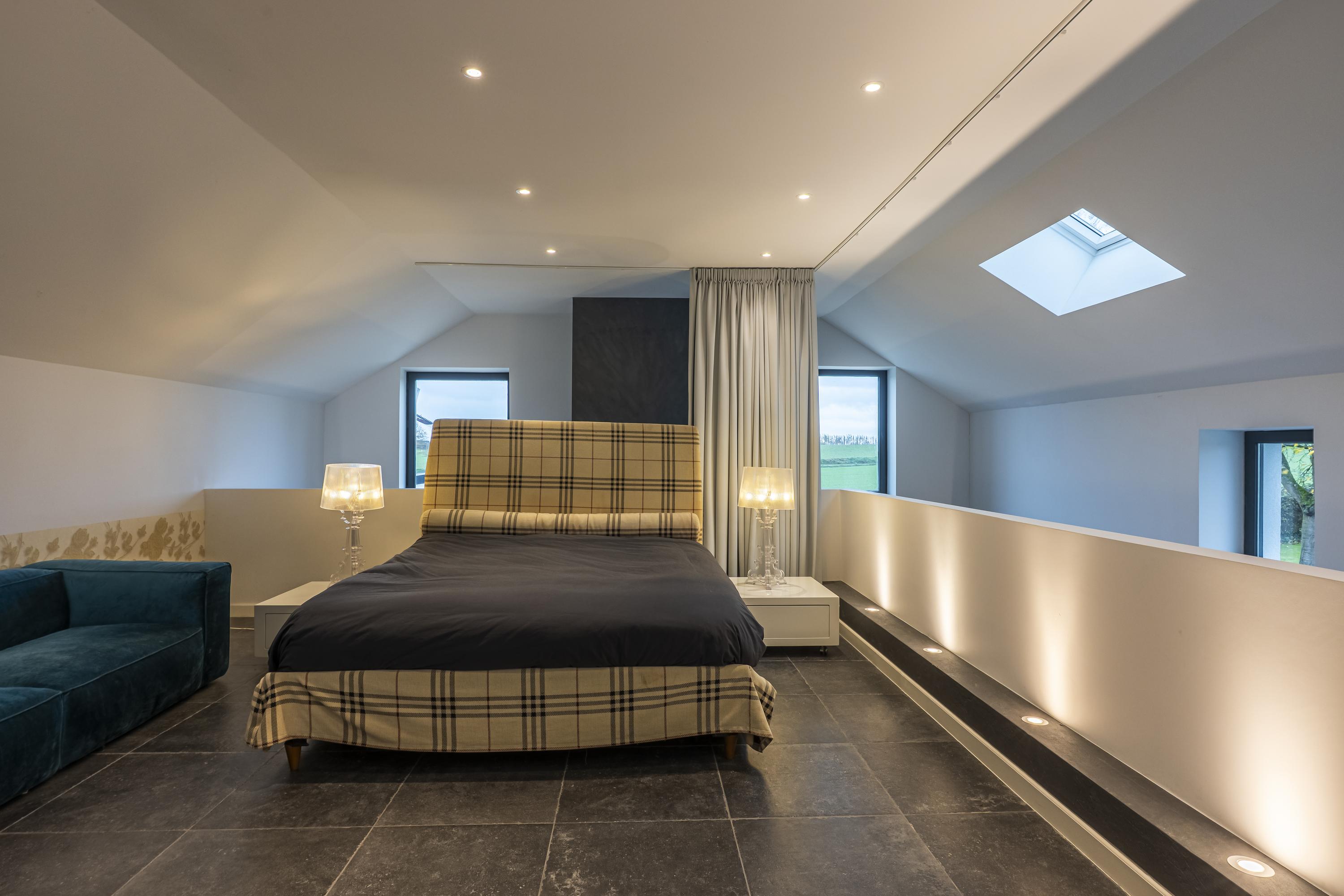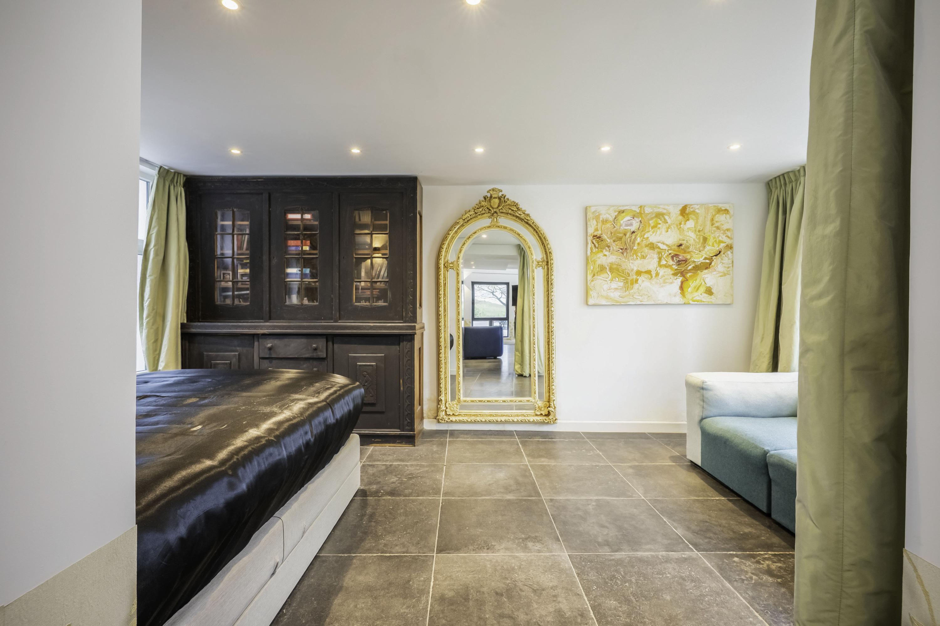 The main residence is conceived around light, proportion and a strict architectural consistency. The spacious living kitchen, fitted with Gaggenau appliances, forms the heart of the home. The adjoining living area exudes understated luxury with generous windows, a modern wood stove, and direct access to both the courtyard and the garden terraces. Large anthracite tiles extend seamlessly outdoors, creating a unified interior–exterior composition. A study (or additional bedroom) on the ground floor and the elegant Golden Bathroom complete the ground level.