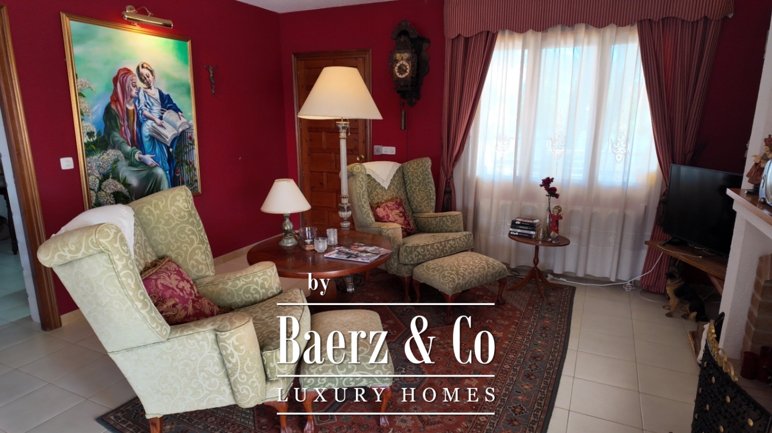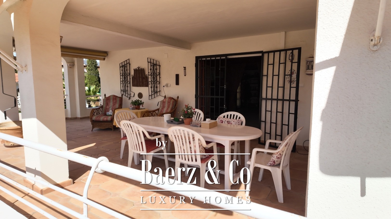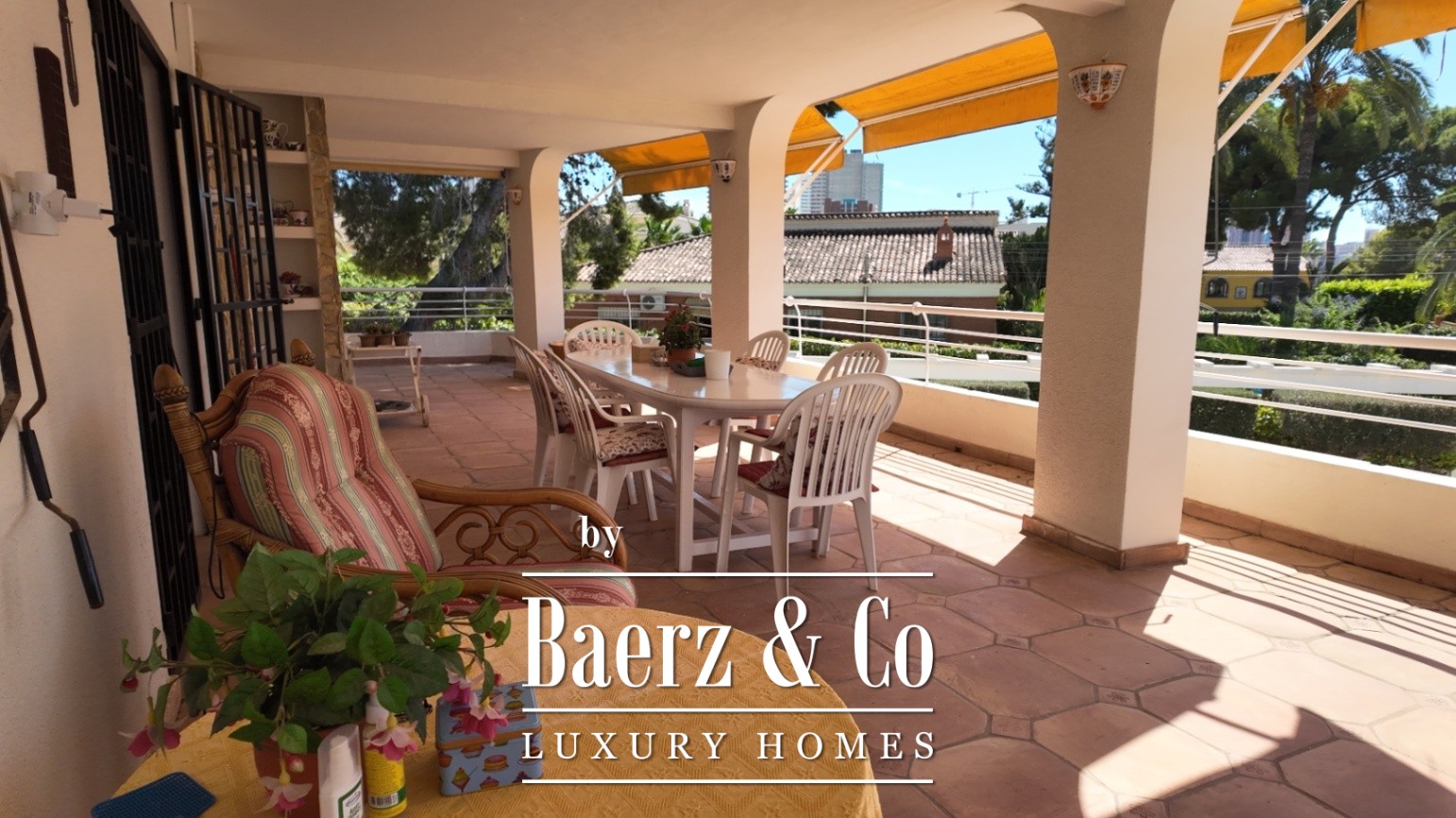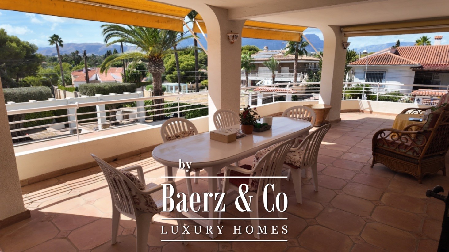 Villa Benidorm in Rocas Blancas presents a distinctive blend of tranquility and proximity, set discreetly in a gated enclave between Albir and Benidorm. This villa offers 423 m² of considered living space, with four bedrooms and three bathrooms arranged to balance spaciousness and privacy. The property includes a dedicated guest apartment on the ground floor with its own entrance, kitchen, living or bedroom space, and a bathroom—a thoughtful design for extended stays or family visits.