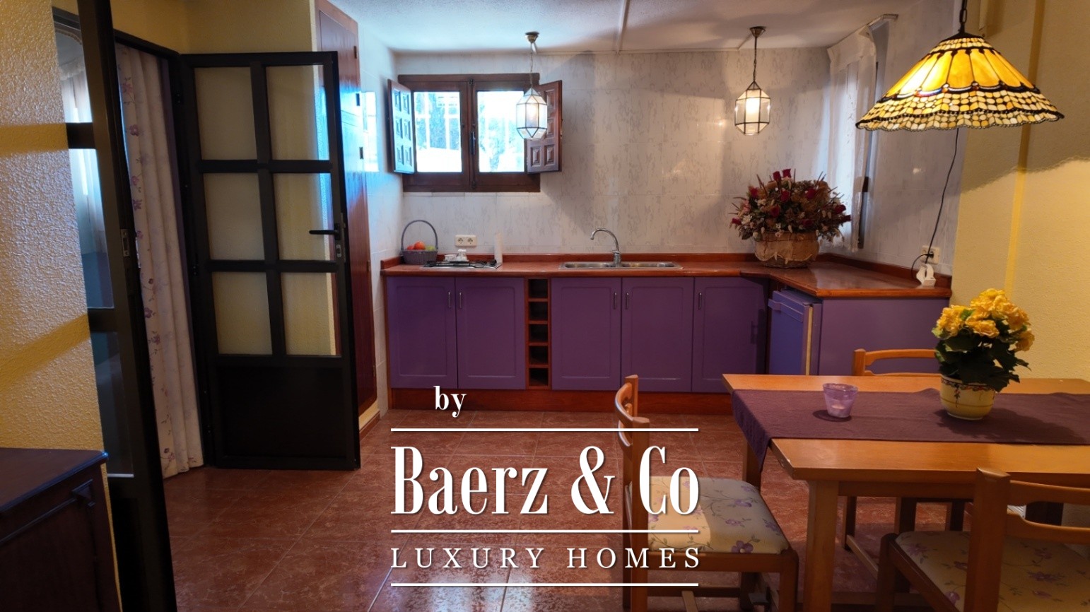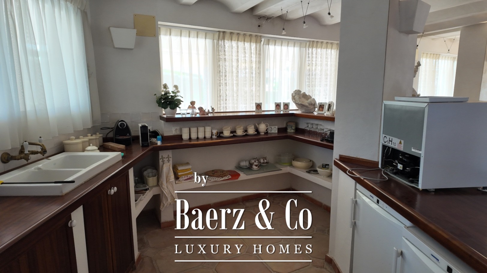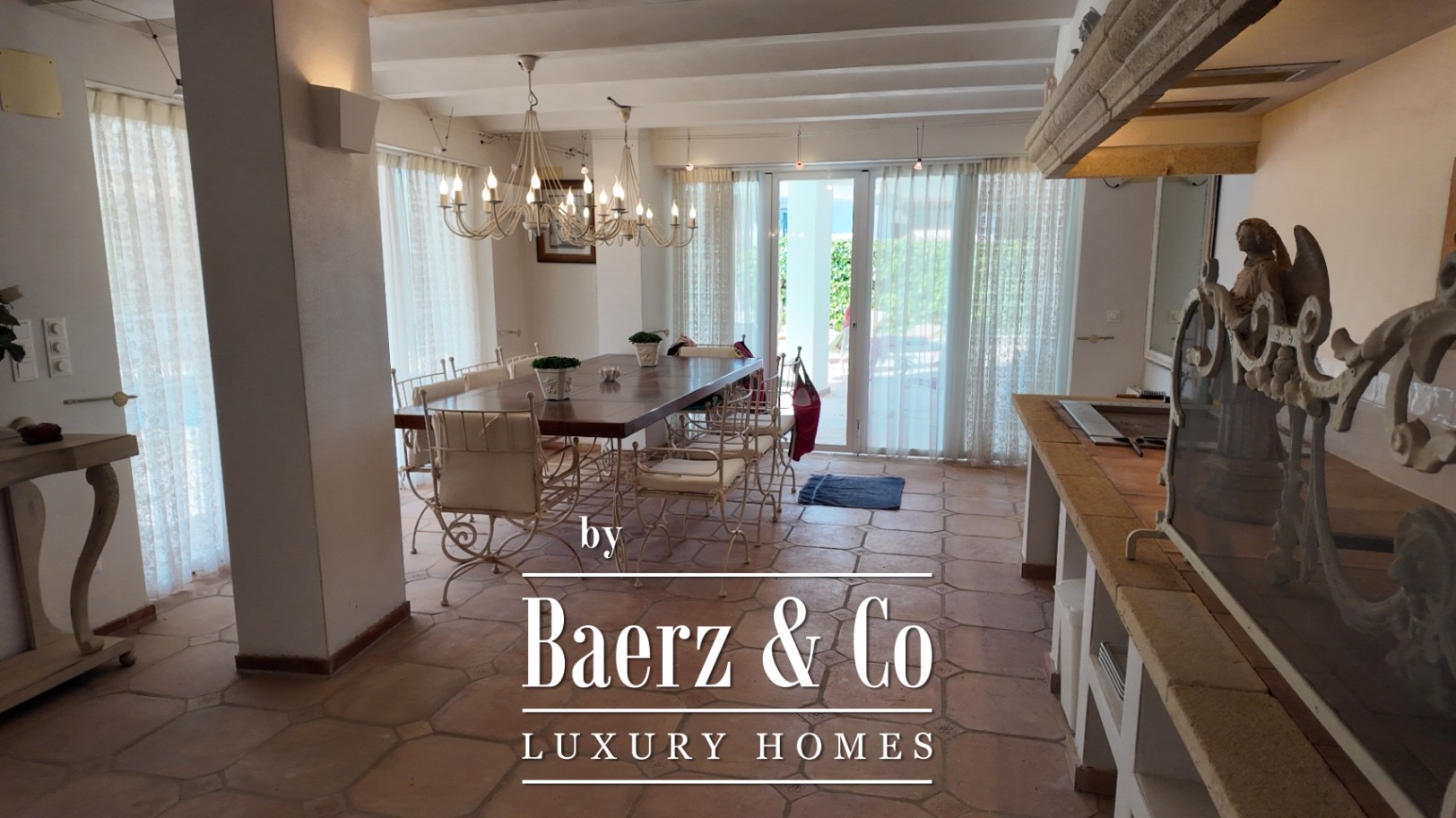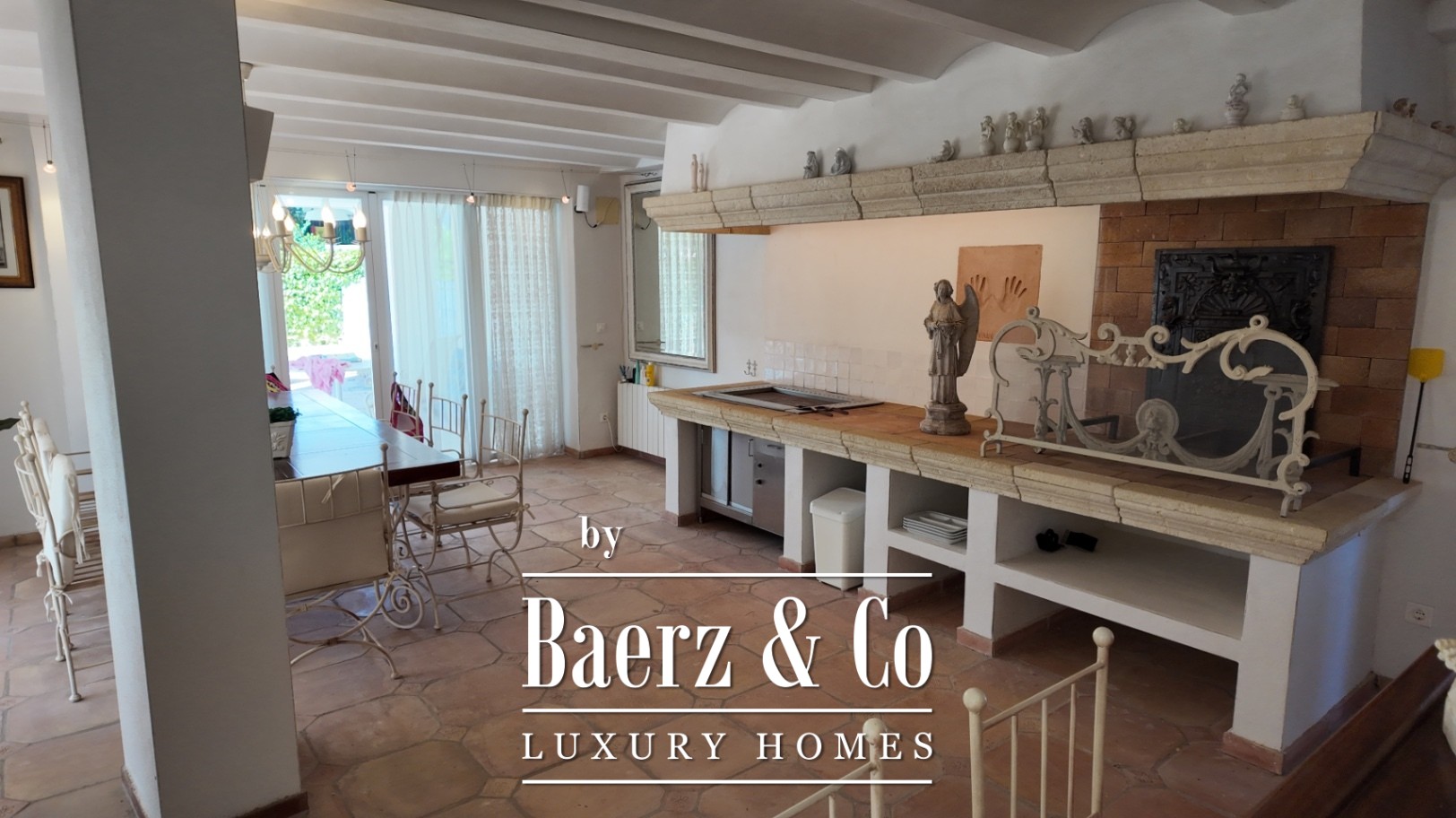 The main house features a luminous living room linking seamlessly to a terrace that frames open mountain and pool views, while the adjacent kitchen ensures everyday function with a sense of calm continuity. Outdoors, the plot spans 1,034 m², hosting a large pool, a terrace for gathering, and a summer kitchen suited for both quiet evenings and convivial gatherings.