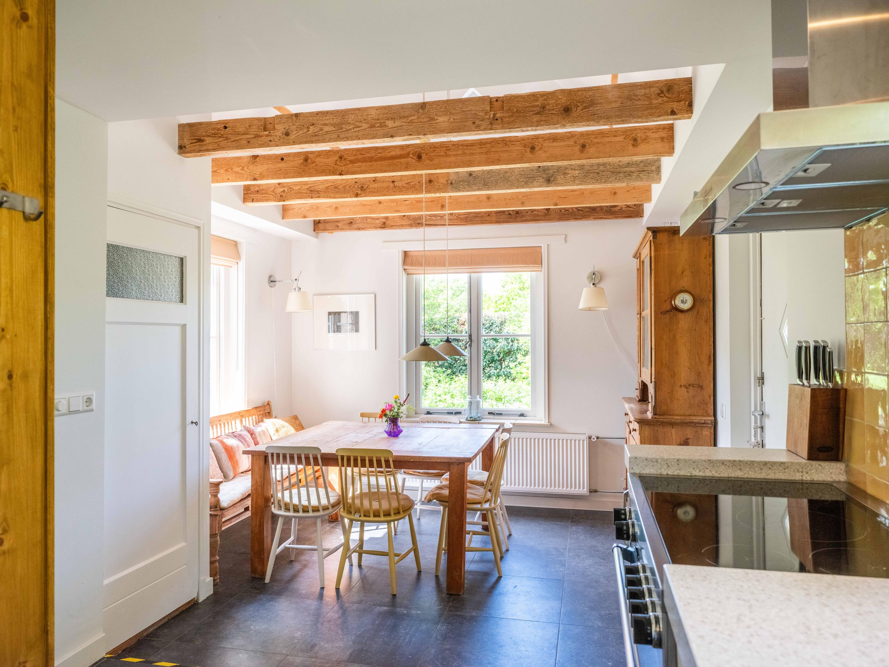 The kitchen is a lovely place for the whole family, equipped with all conveniences: a Quooker, dishwasher, extractor hood, large oven with induction hob and a separate fridge-freezer. The kitchen also provides access to the meter cupboard.