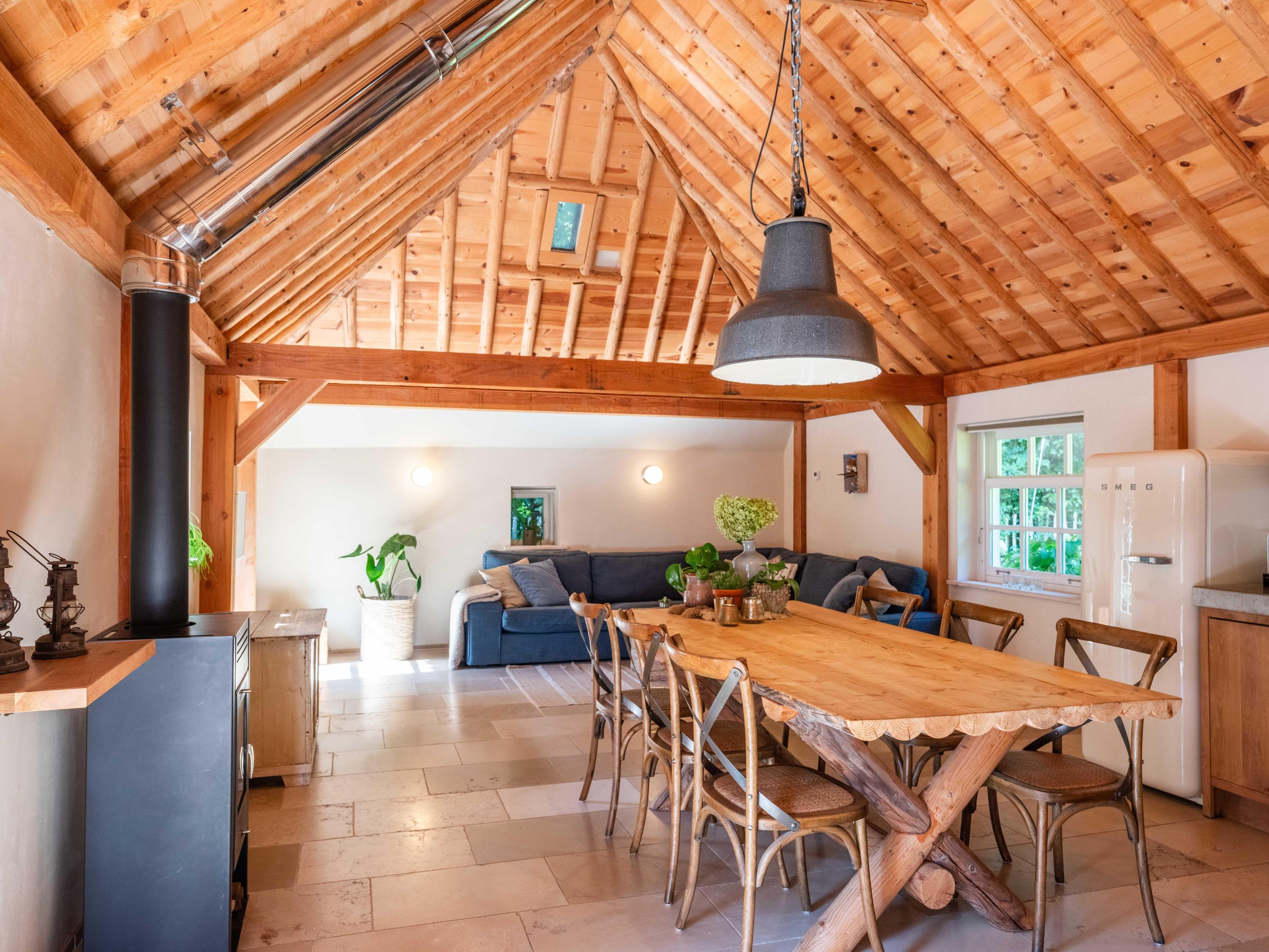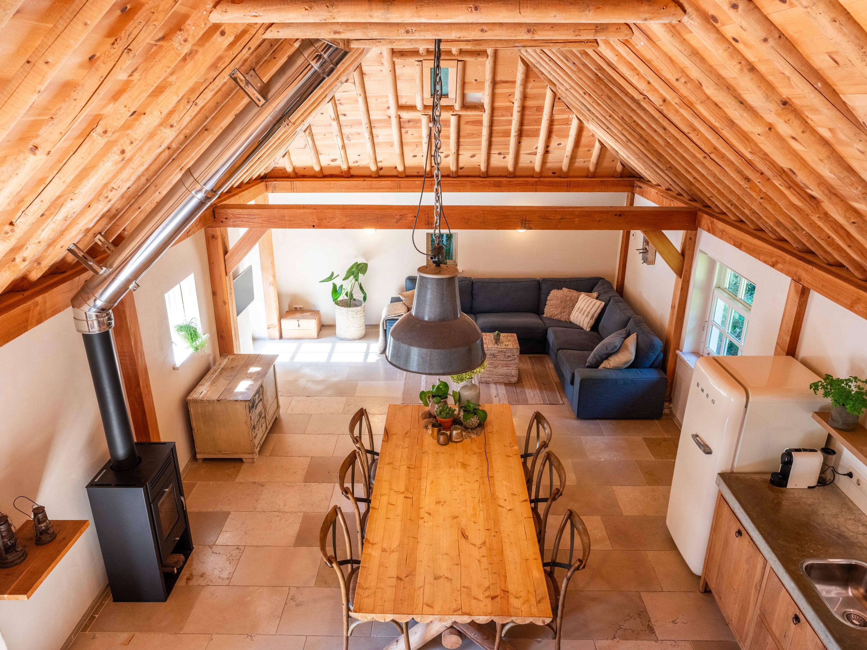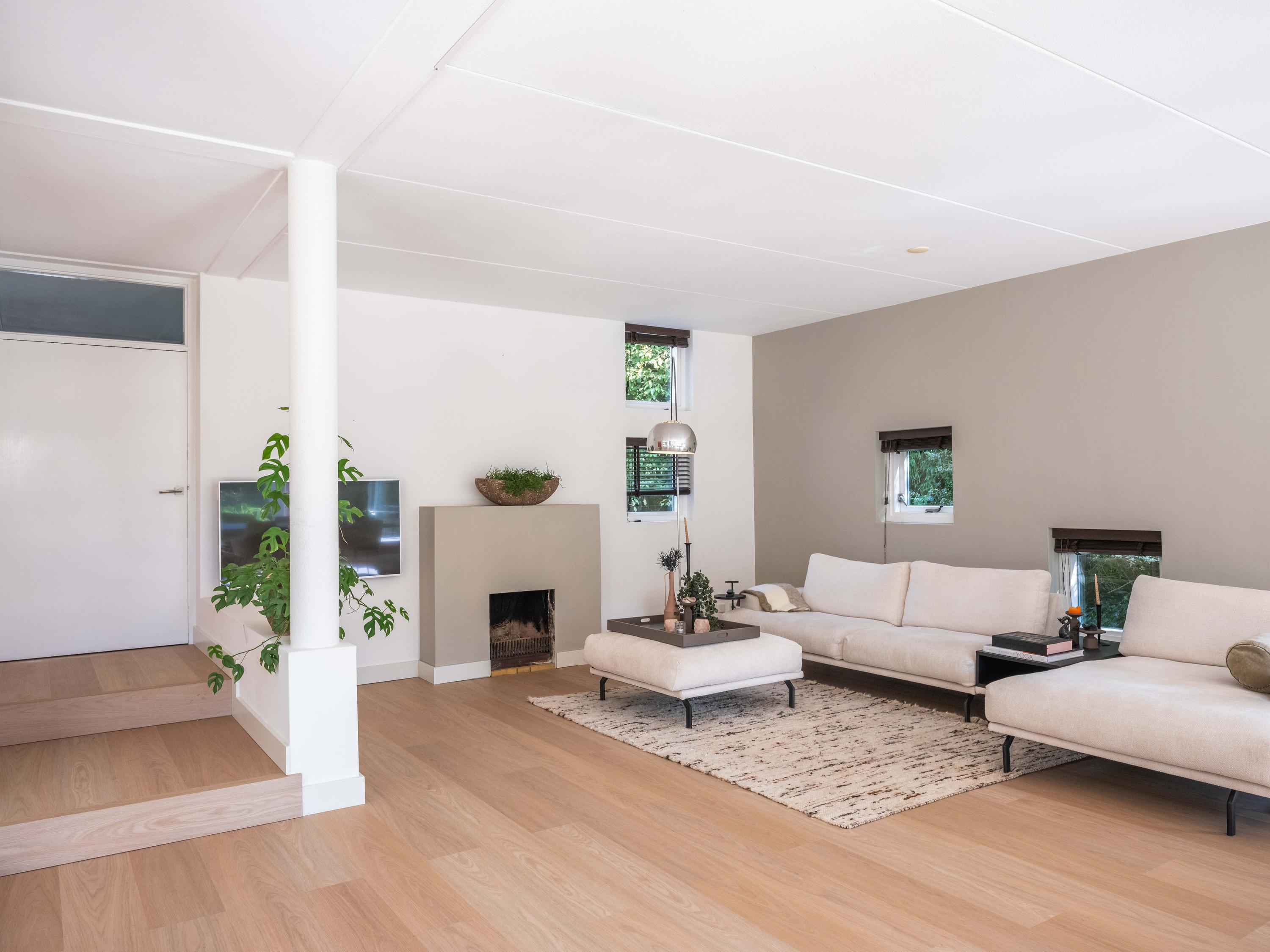 We start in the spacious living room, which is very bright and overlooks the lawn towards the meadow behind. A fireplace provides a cozy atmosphere and warmth in the afternoons and evenings.