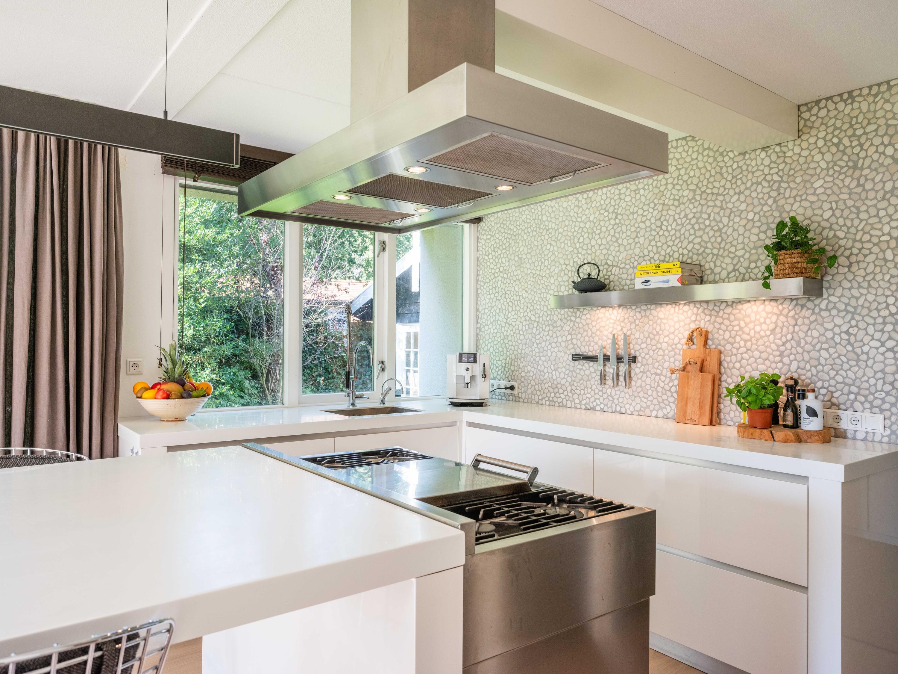 The modern open kitchen has an island where you can sit together. From here again a beautiful view of the greenery.French doors and a covered heated terrace bring the outside in.The kitchen is equipped with various appliances including a quooker, refrigerator, freezer, steam oven, wine cooler, warming drawer and dishwasher. Cooking is available on the large stove with 4 gas burners, a teppanyaki plate, deep fryer and double oven.