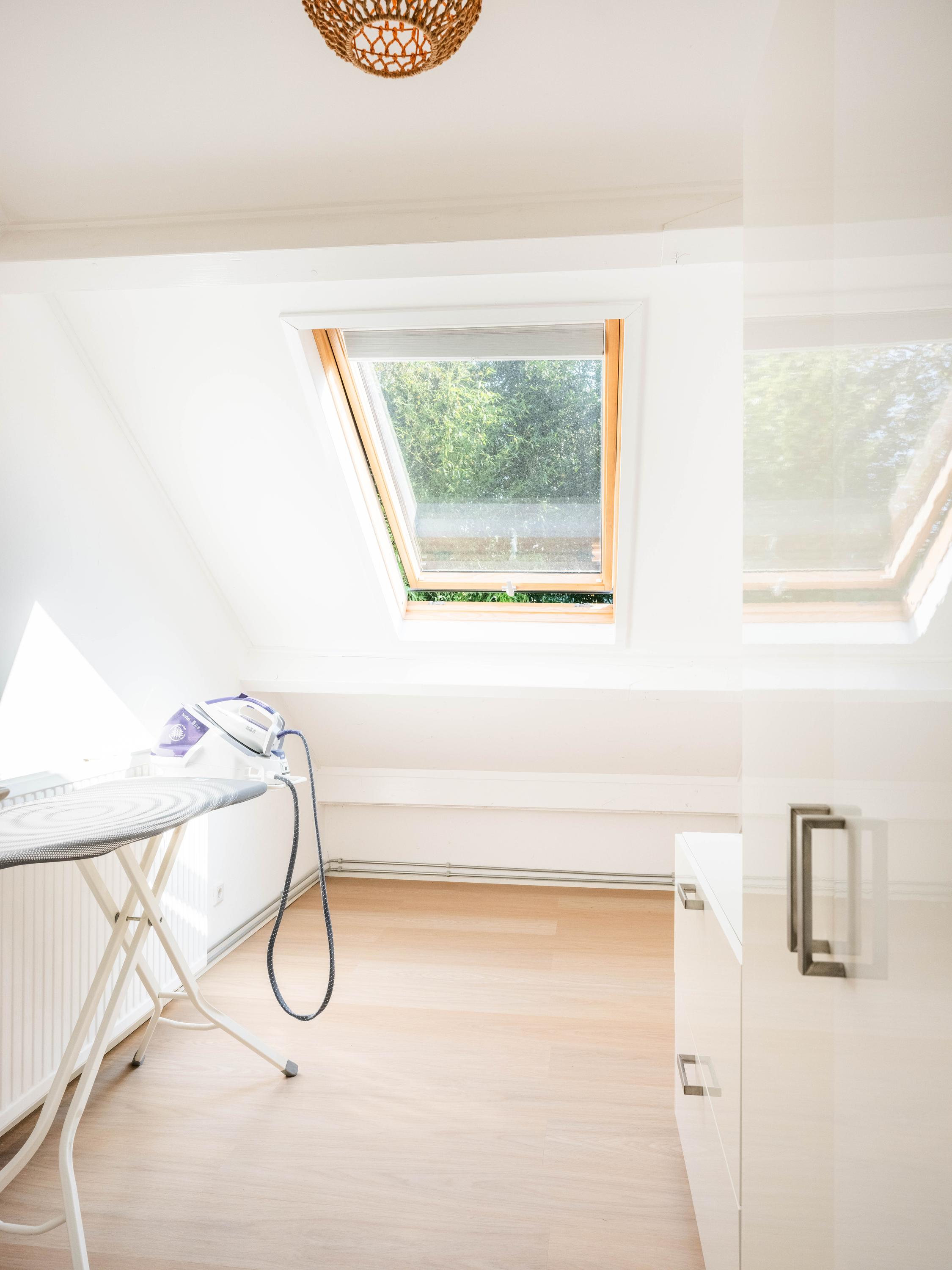 Upstairs on the landing are five rooms. Four rooms can certainly be called generous, the fifth is a smaller room, this is used as a laundry/ironing room but would also be an ideal baby room.