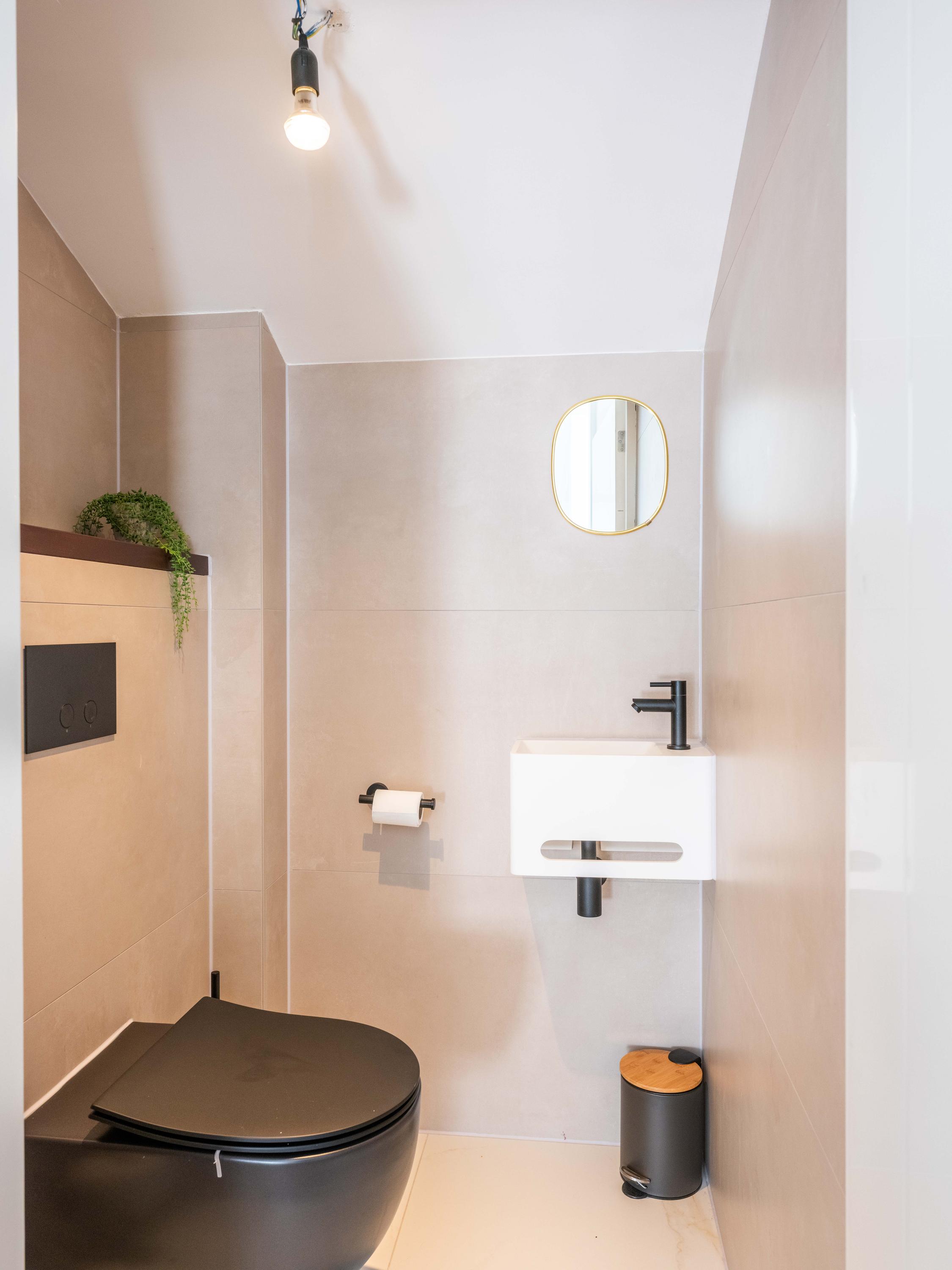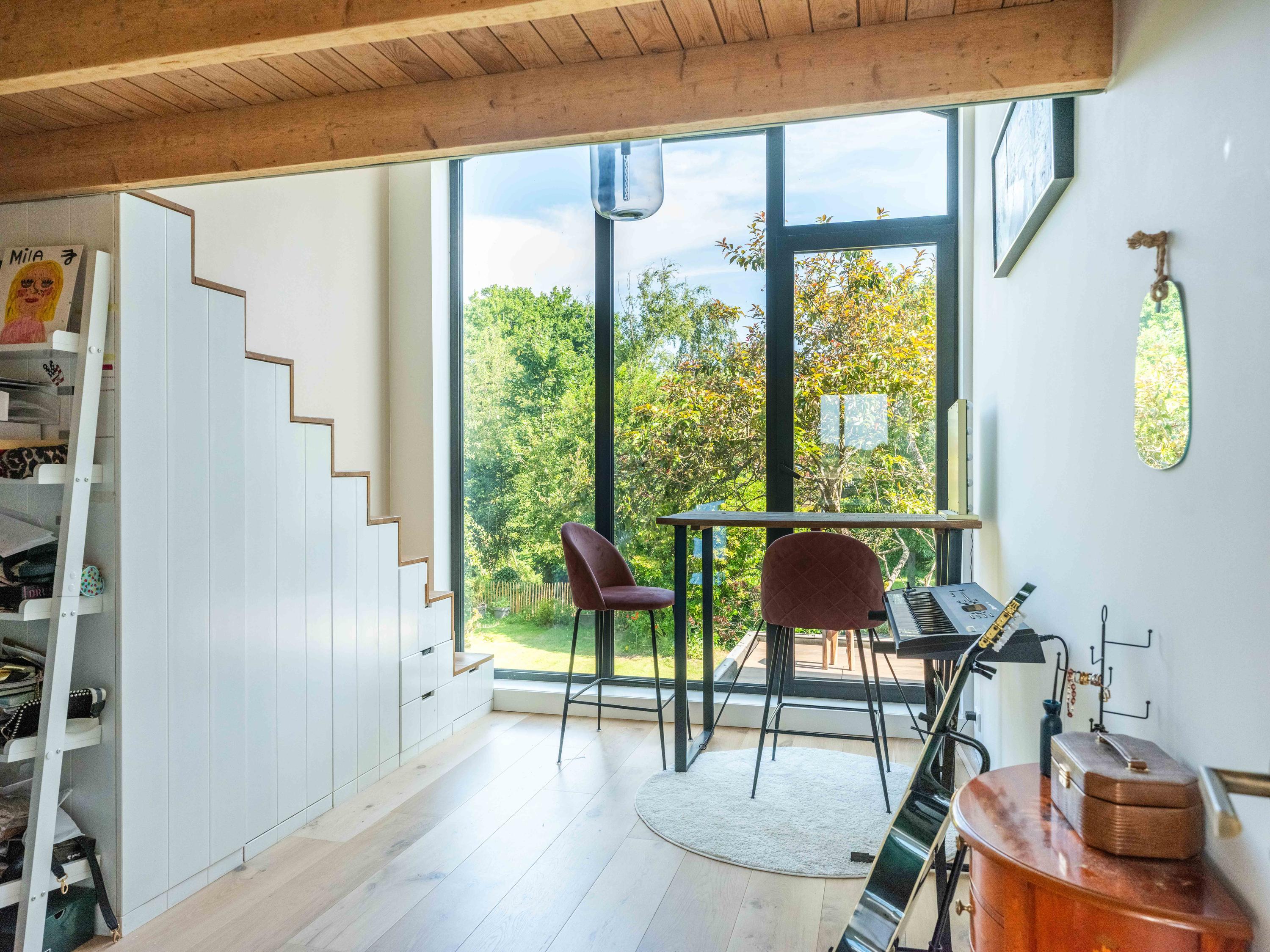 The custom-made kitchen in rich walnut is a dream for any cooking enthusiast. Fully equipped with high-end appliances, including a luxury wine climate cabinet, it also features an architectural highlight: a walnut wall with a hidden door, revealing a spacious utility room behind it. The front-facing living room offers a cozy reading or play corner with panoramic views of the polder, while the rear-facing dining area is bright and airy with large skylights, custom cabinets, and French doors opening onto the garden.