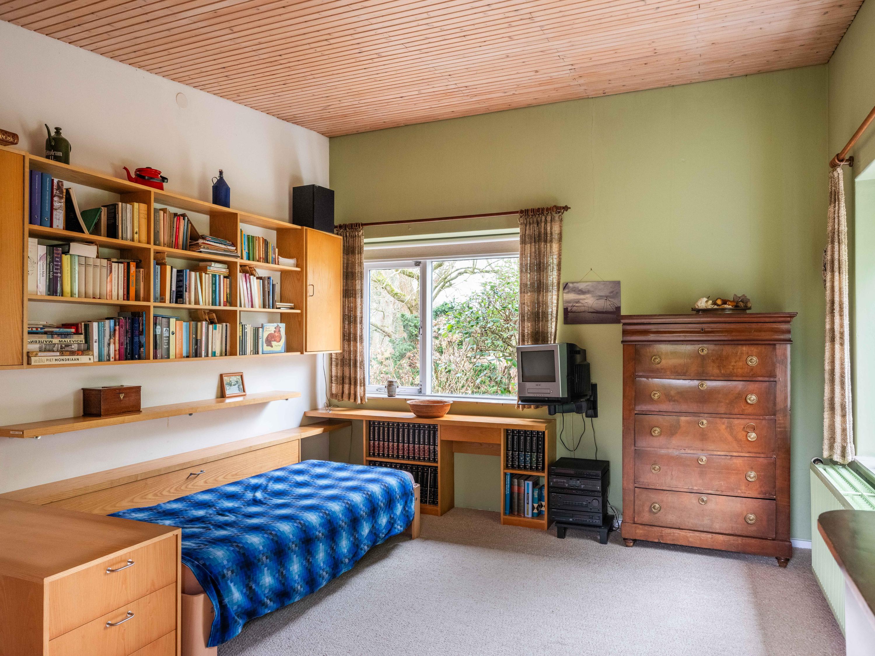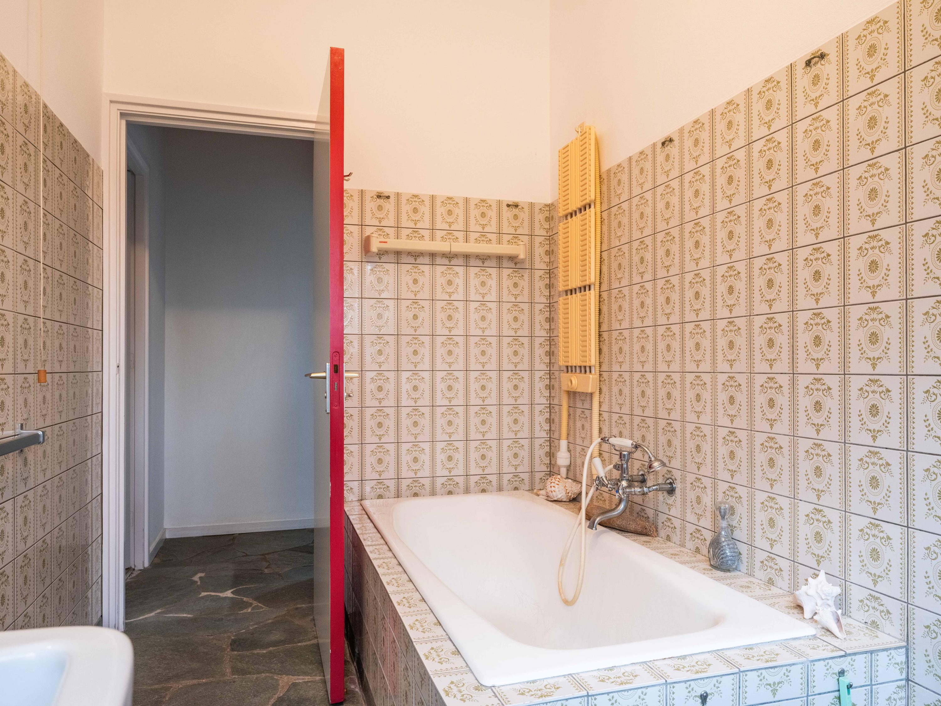 The entrance is at the rear and you are welcomed into a spacious hallway with cloakroom. The property features a bright living room with cosy fireplace, a generous bedroom with garden door and a second bedroom/study. There are two complete bathrooms, one with bath and bidet. The closed kitchen with adjoining functional utility room, including space for the central heating boiler, is also still in its original state and is ready for your personal touch. A mezzanine with study offers the perfect place to work from home or use as a practice room, this room has its own entrance.