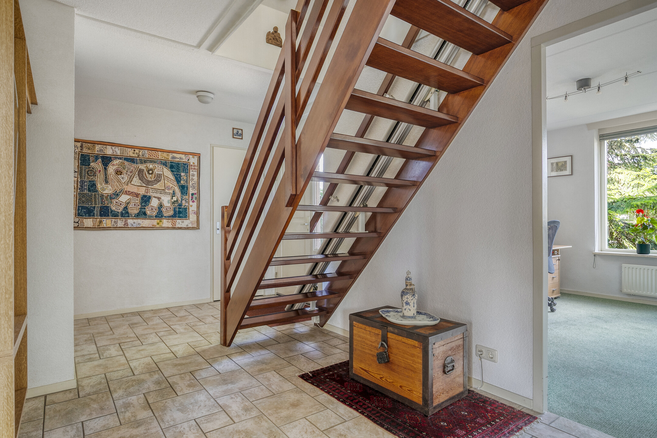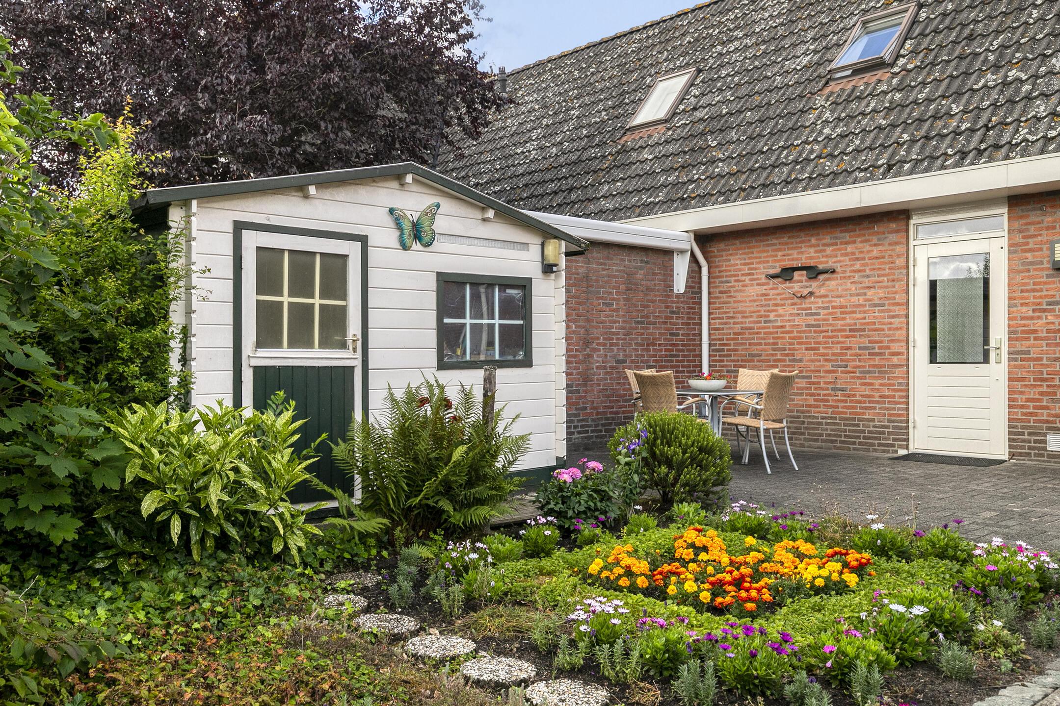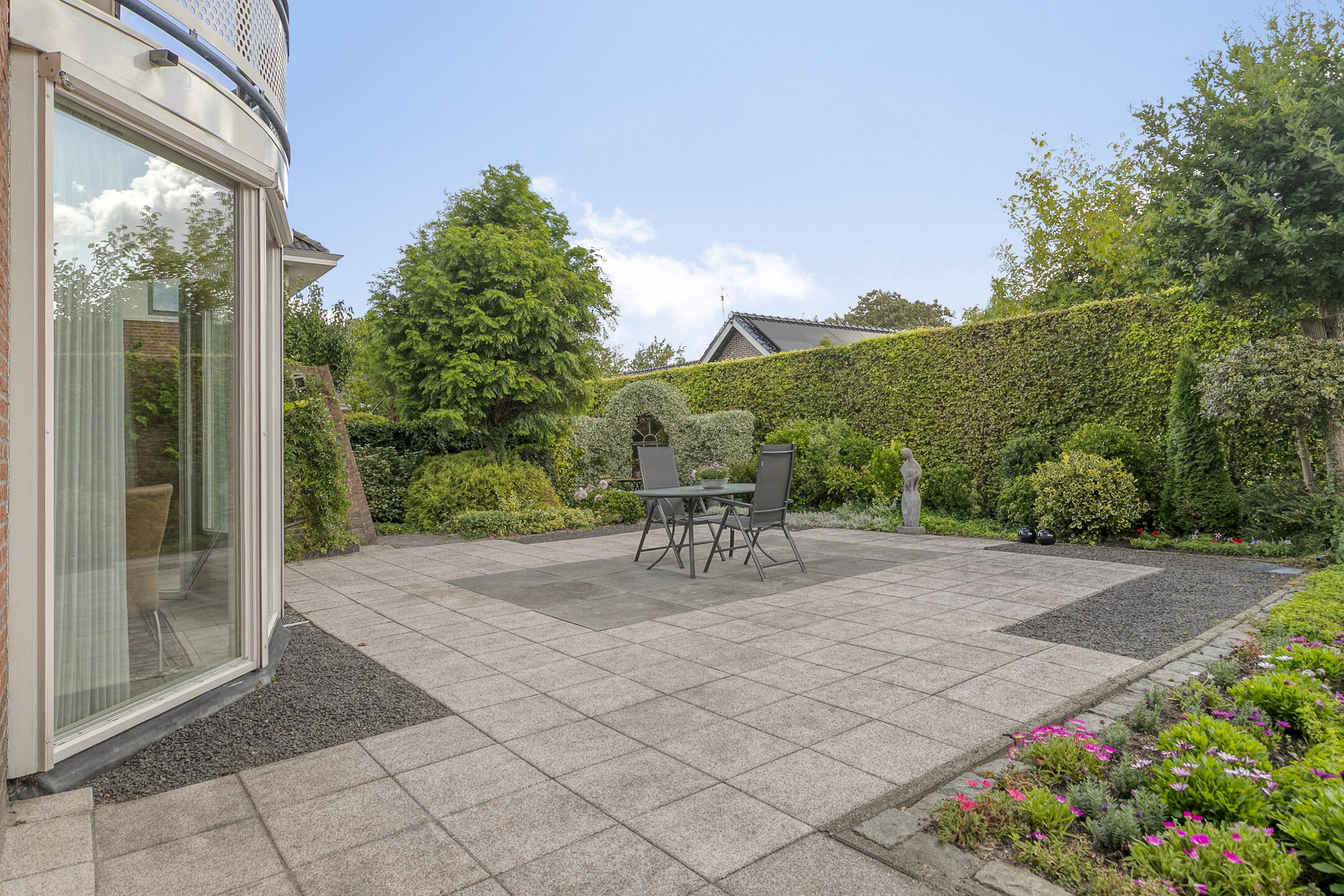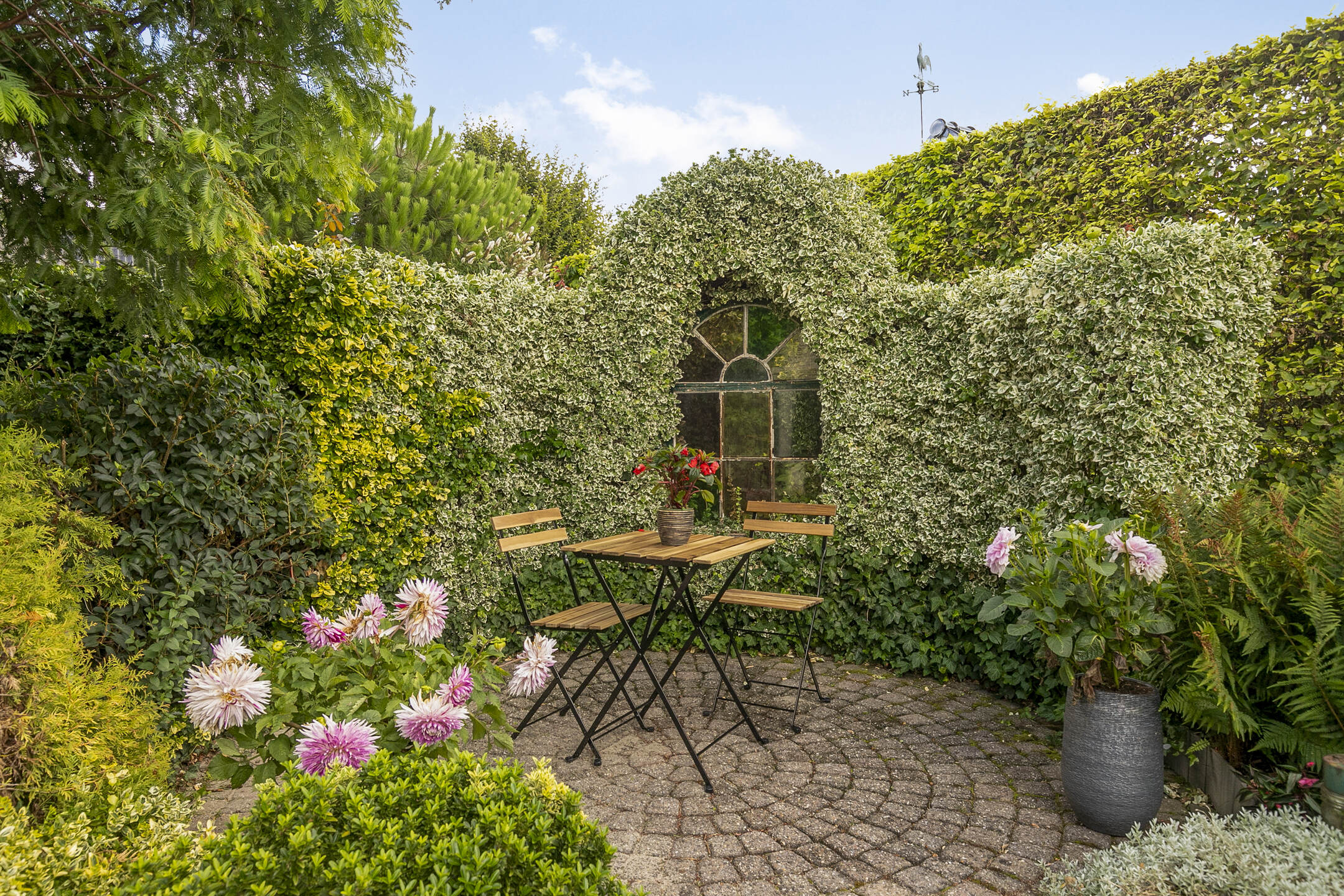 The beautifully landscaped rear garden faces southeast and offers a wonderful variety of flowers and plants. Several terraces allow you to find a sunny or shady spot at any time of the day. A special detail is the cozy corner for the evening sun, atmospherically decorated with a stained-glass feature. At the back of the garden, there is a wooden shed for storing garden tools and bicycles.