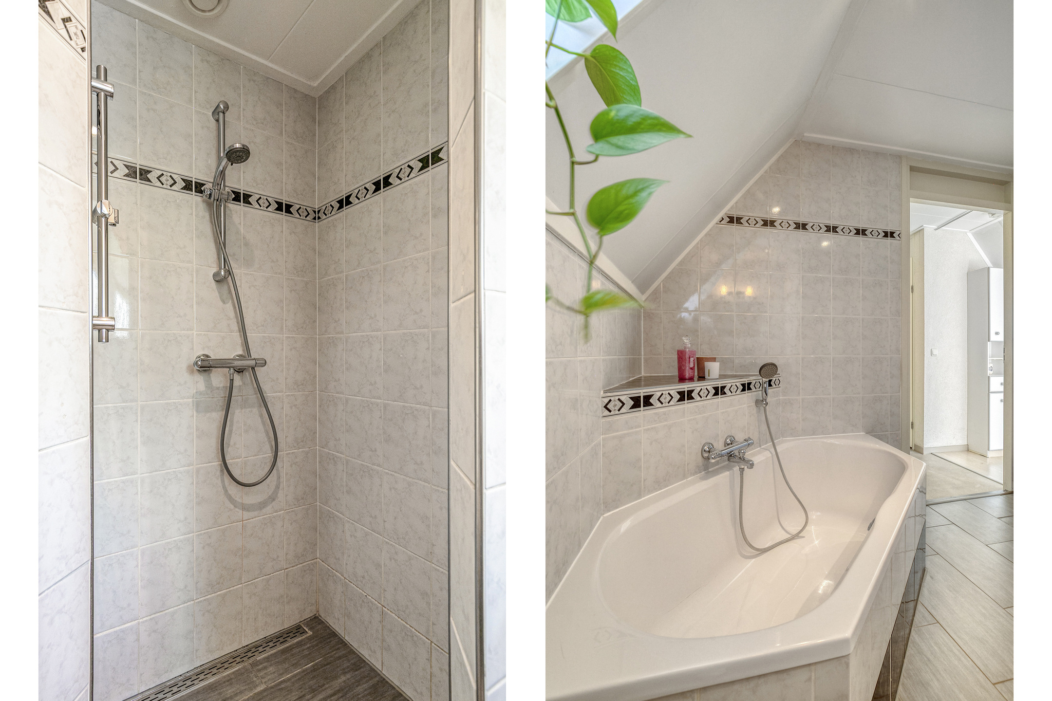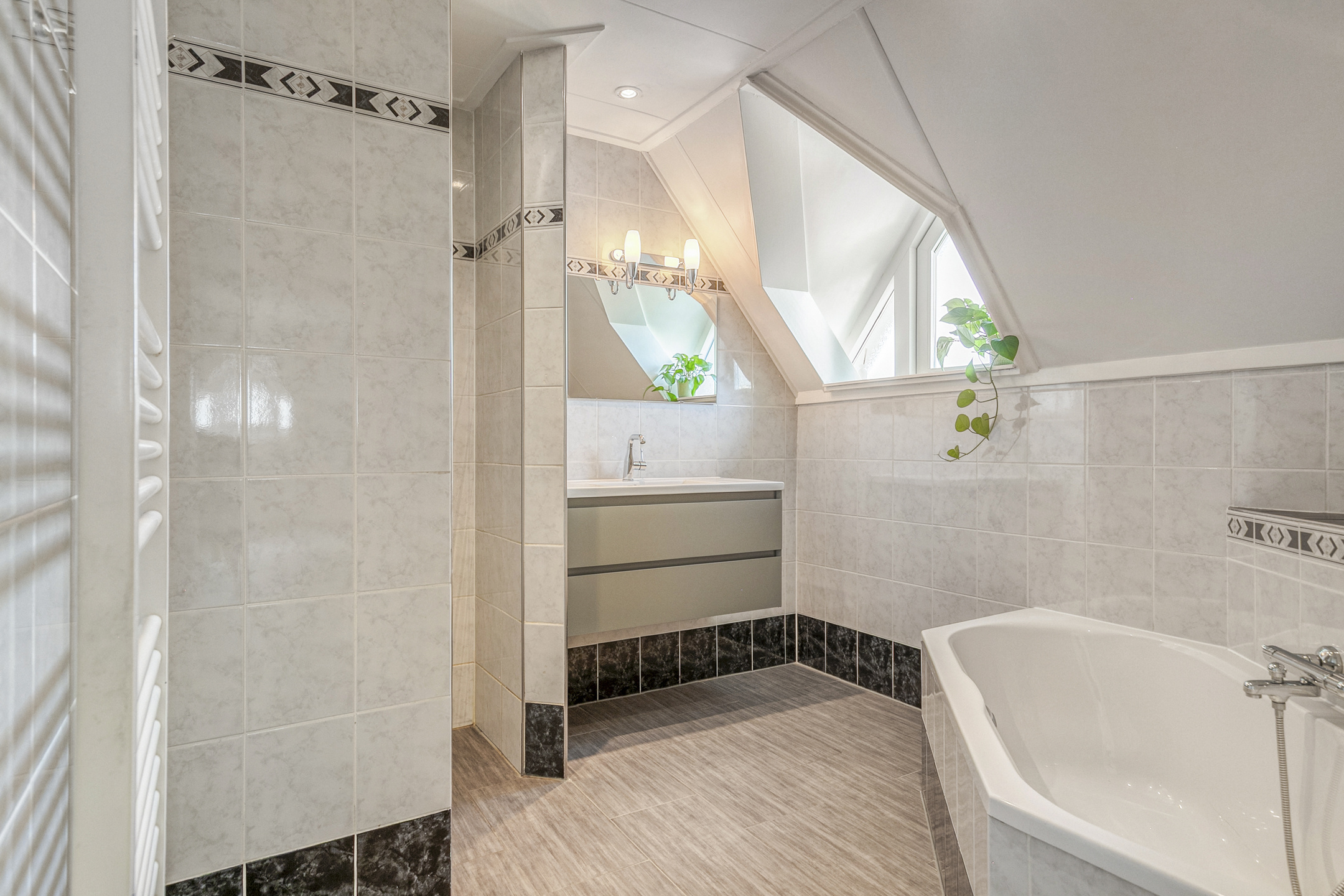 The large bathroom is fitted with a bathtub, shower, towel radiator, and washbasin with cabinet. On this floor, there is also a separate second toilet.