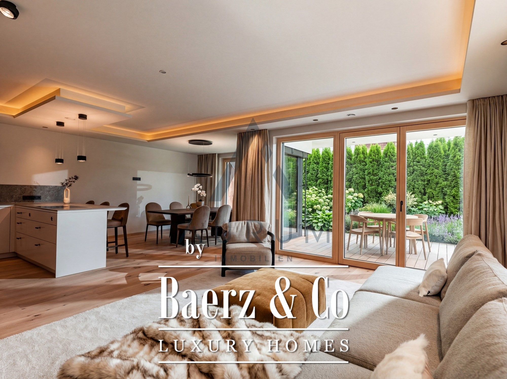 Within its 123 m² of living space, two bedrooms and two bathrooms integrate harmoniously with expansive living areas and a sauna, creating a sense of openness anchored by elemental materials and careful spatial planning. Floor heating ensures year-round comfort, while the Loxone BUS system and motorized blinds add contemporary efficiency. A guest WC, elegant lift access, and basement storage support daily living with seamless flow.