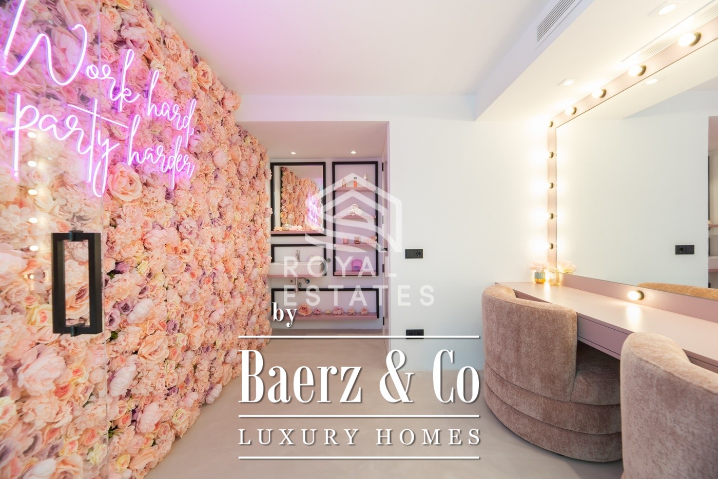 Expansive terraces open to landscaped gardens, mature palms, and lagoon-style pool, inviting both relaxed solitude and social gatherings. Outdoor games, a firepit, and sunbathing enclaves complement spaces for both celebration and calm. Wellness is a priority, with a dedicated gym, home cinema, and glam room on the ground floor. Fine natural materials—wood, stone, tactile fabrics—shape a minimalist, timeless aesthetic, unified by underfloor heating, integrated air conditioning, and dimmable lighting.