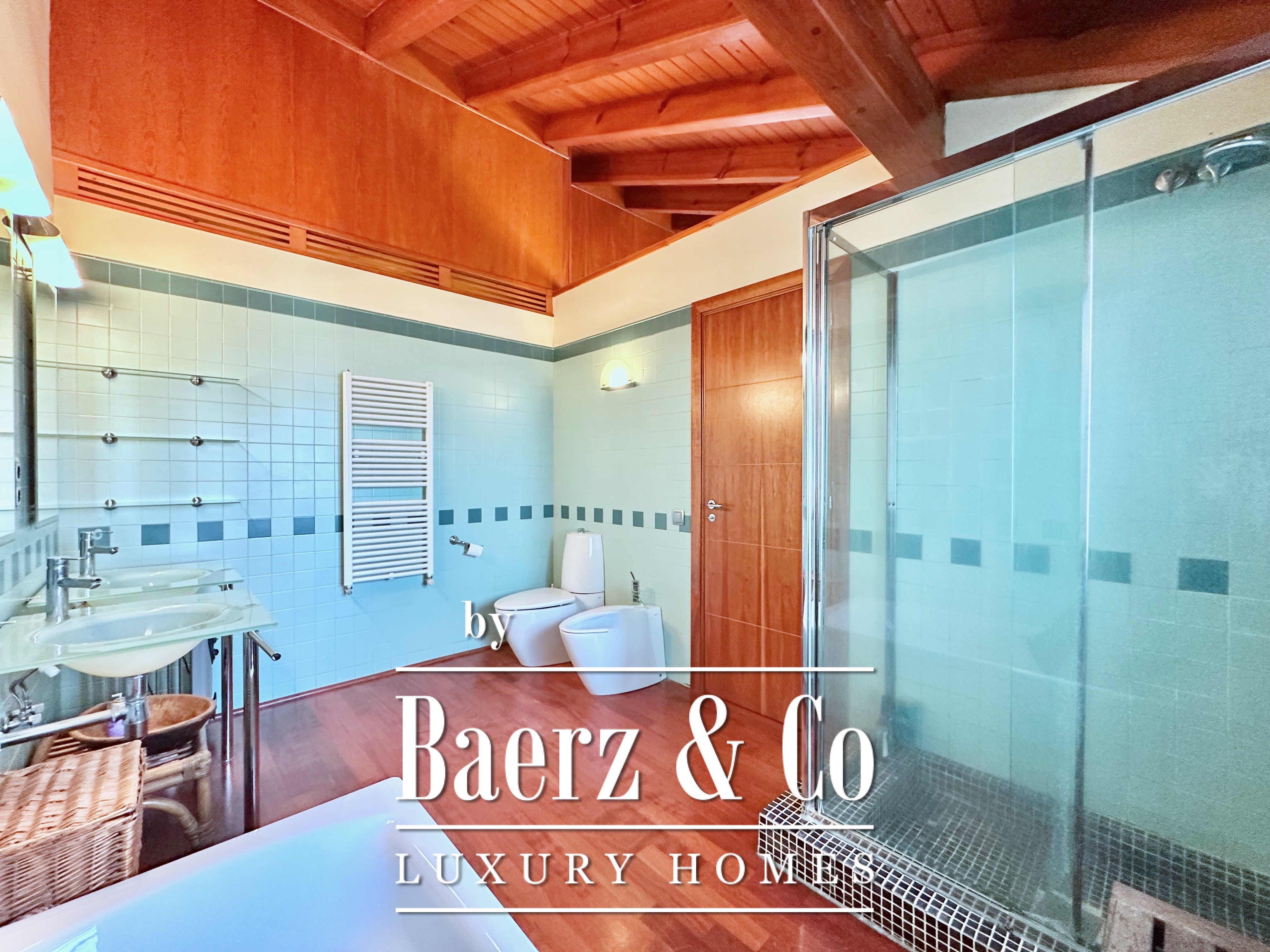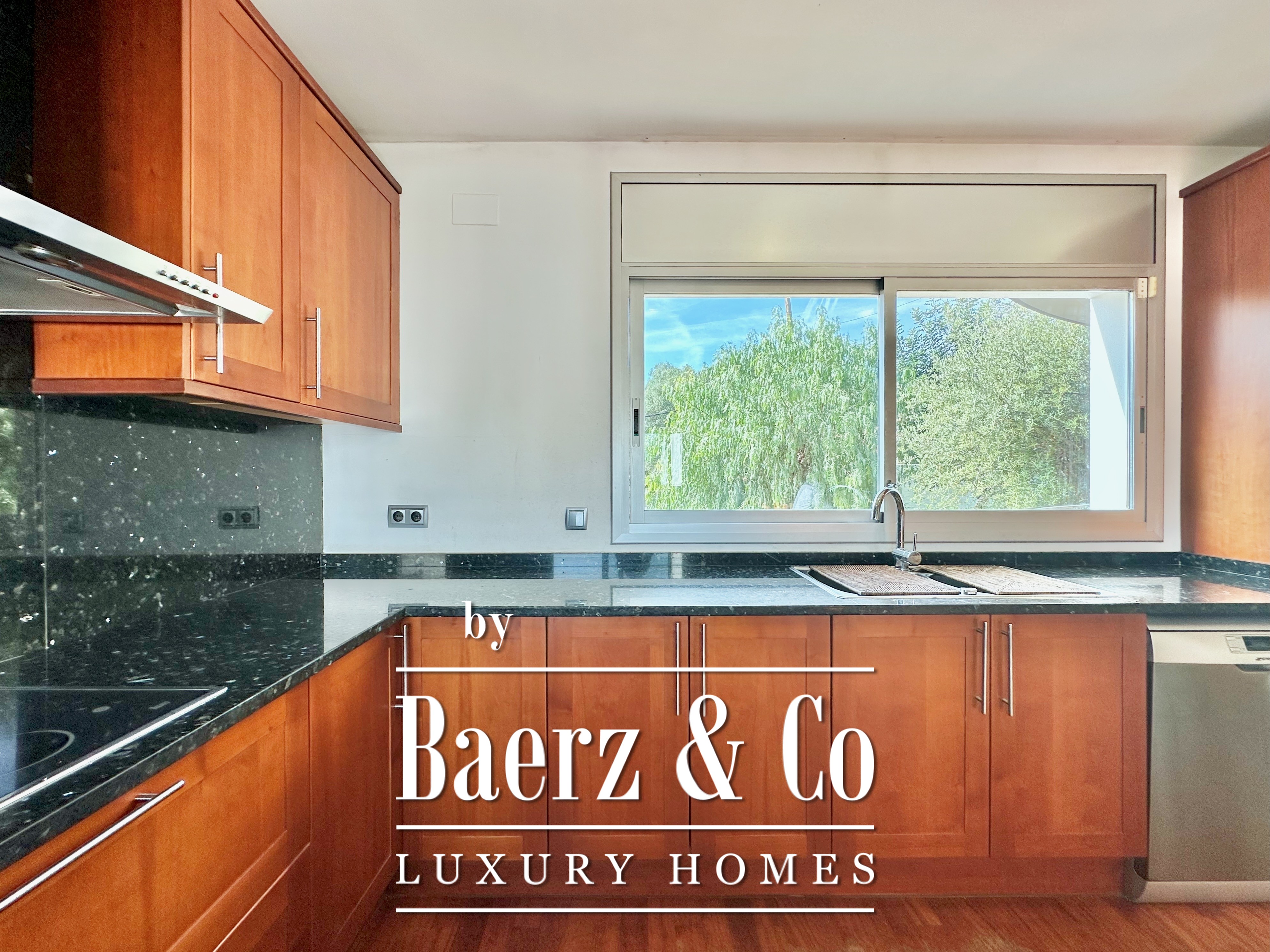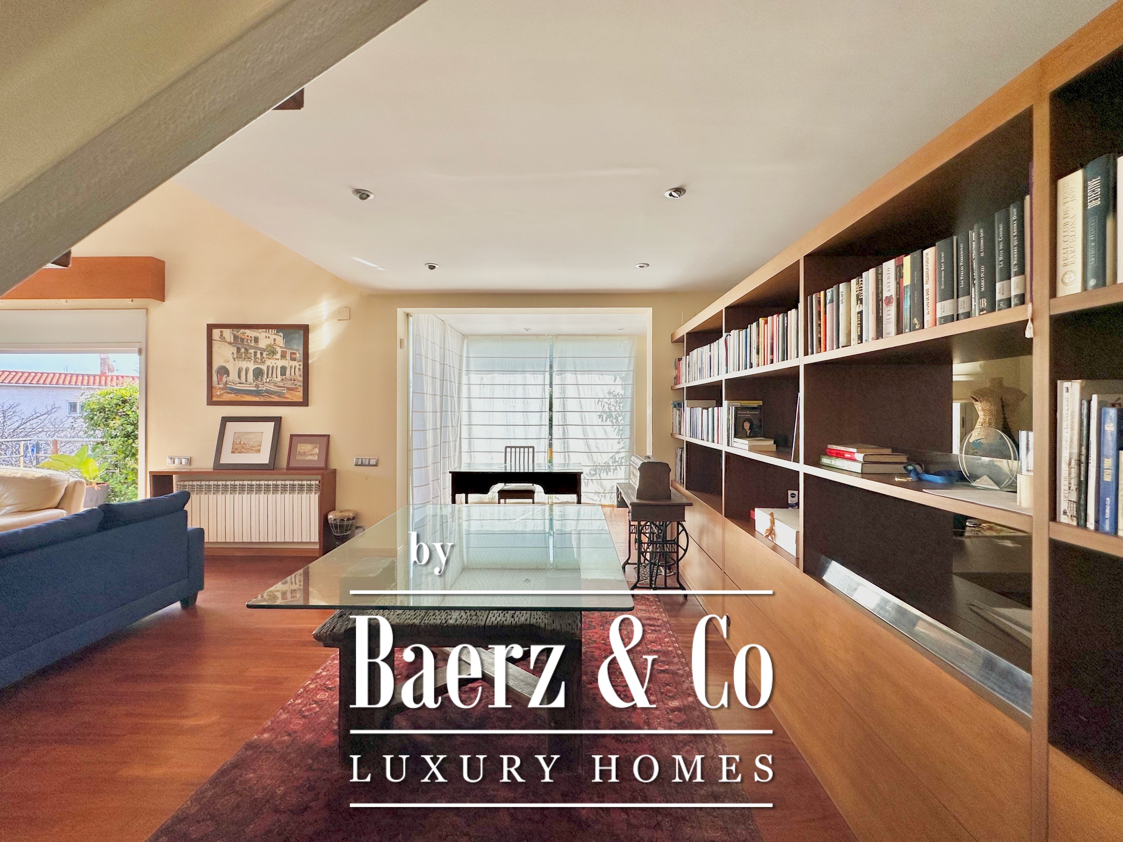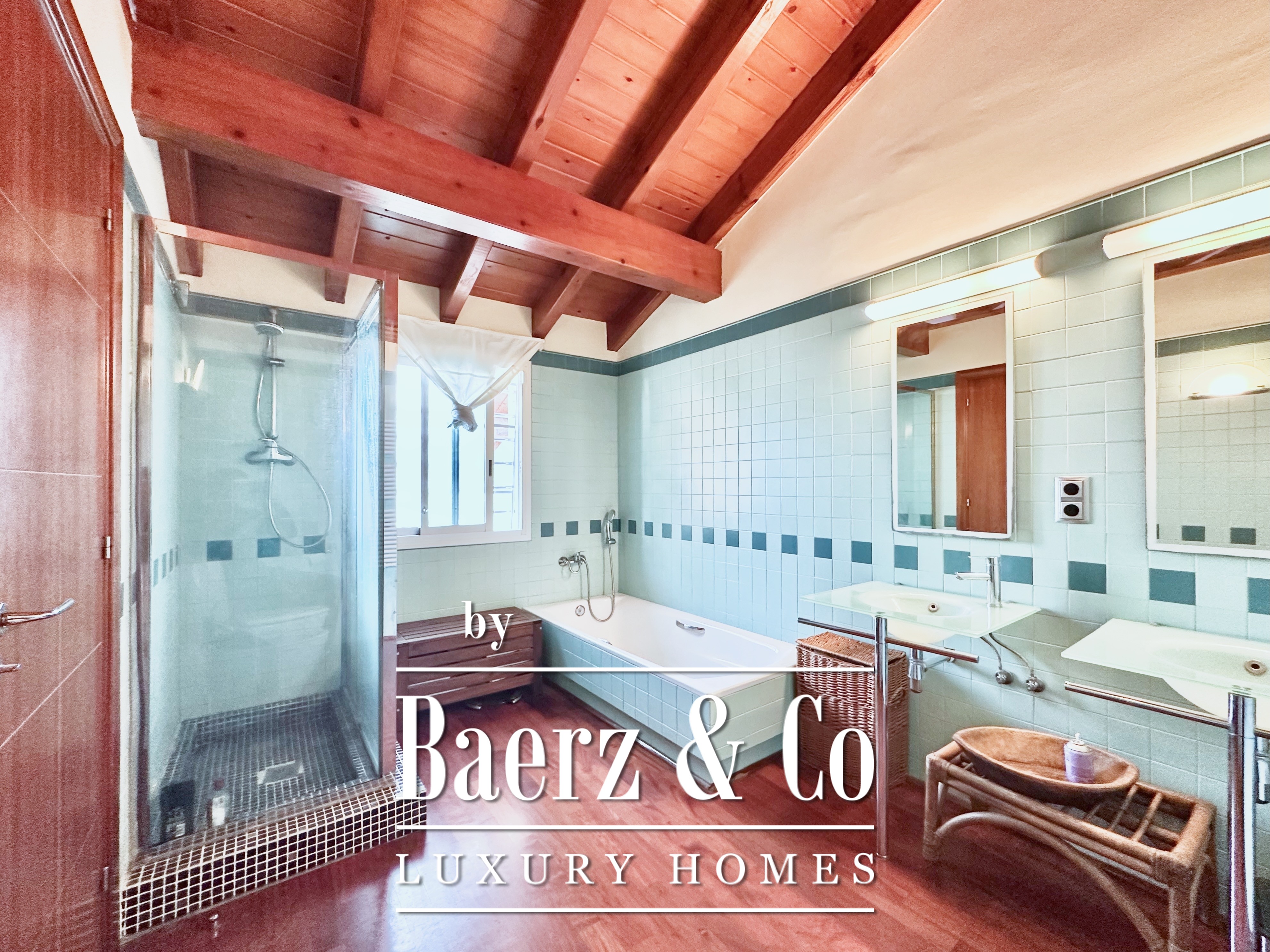 The private quarters include five bedrooms and two bathrooms. Two double rooms merge into a flexible, expansive suite above 20 m², easily returned to the original layout. An attic loft offers potential for work or leisure with direct access to a 20 m² terrace showcasing panoramic mountain views. The main suite features a dressing area and an elegant five-piece bathroom, balancing comfort with quiet sophistication. This detached house for sale in Castelldefels subtly integrates every element for a considered lifestyle in one of Spain’s respected coastal localities.