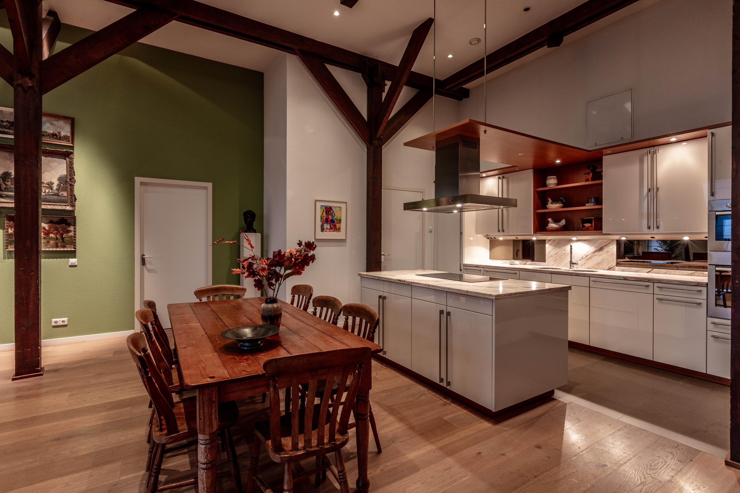 De bijzonder sfeervolle woonkamer is indrukwekkend door de unieke hoogte en fraaie zichtbare kapconstructie. De open keuken bevindt zich aan de achterzijde en beschikt over een kookeiland, volop kastruimte en diverse inbouwapparatuur. Vanuit de keuken is er prettig zicht op de woonkamer met een gezellig zitgedeelte en een apart eetgedeelte.