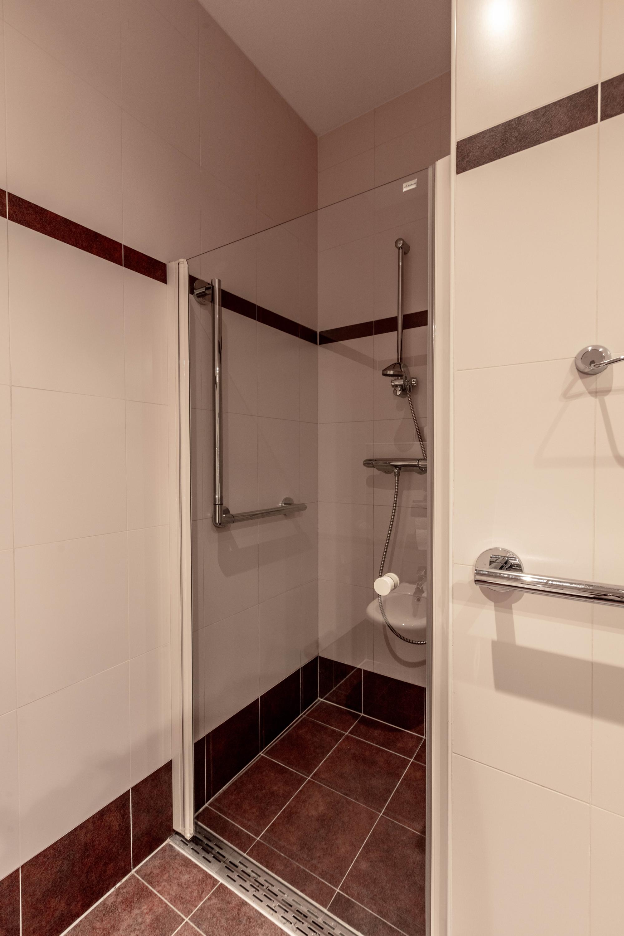 De tweede slaapkamer is ook voorzien van dakvensters en heeft eveneens een eigen badkamer met douche en wastafel.