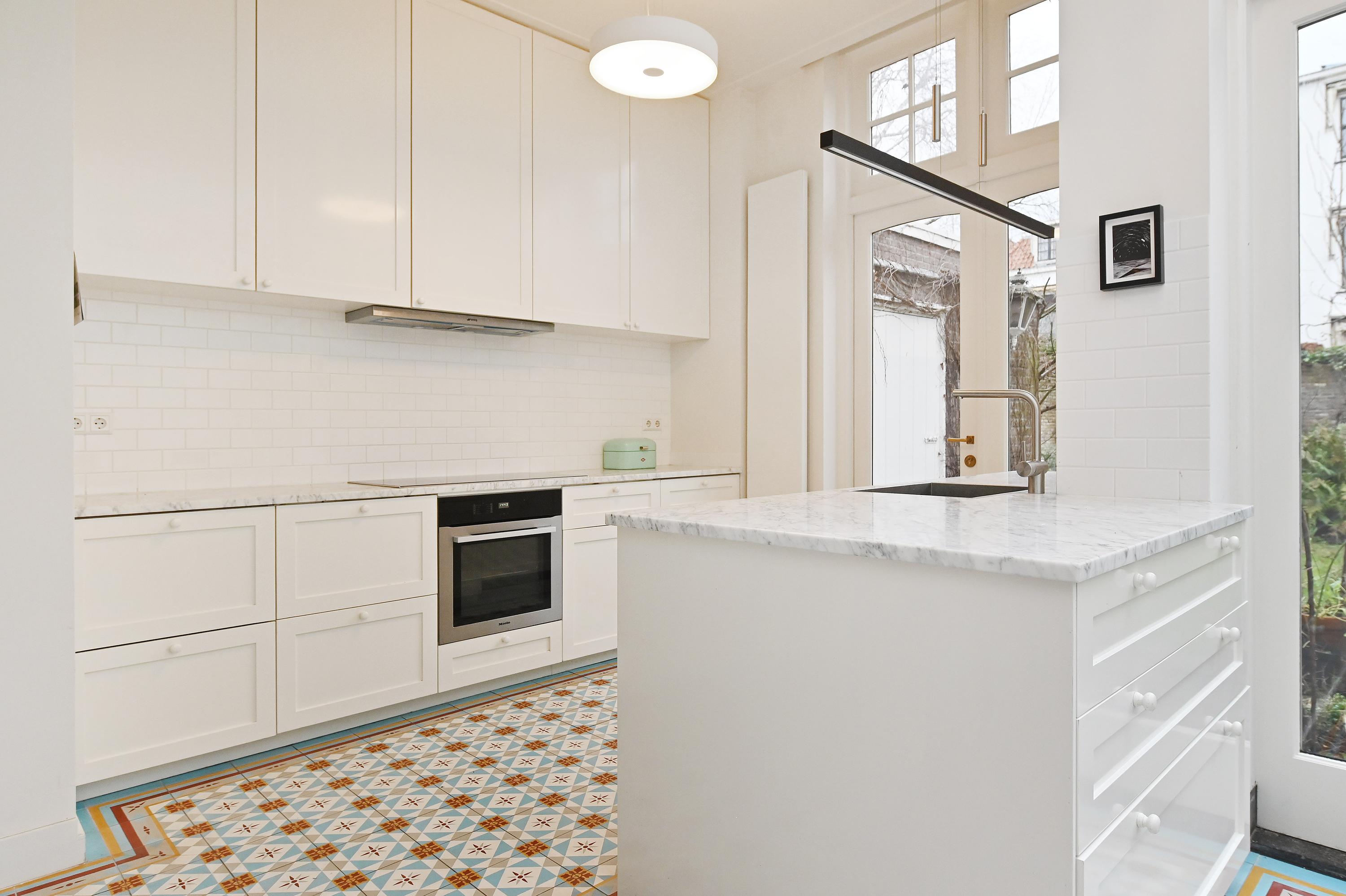 Vanuit de keuken en via openslaande deuren in de eetkamer is er toegang tot de extra brede en 12 meter diepe, ommuurde achtertuin. Tot in de avond is er altijd wel een plekje in de zon of de schaduw.