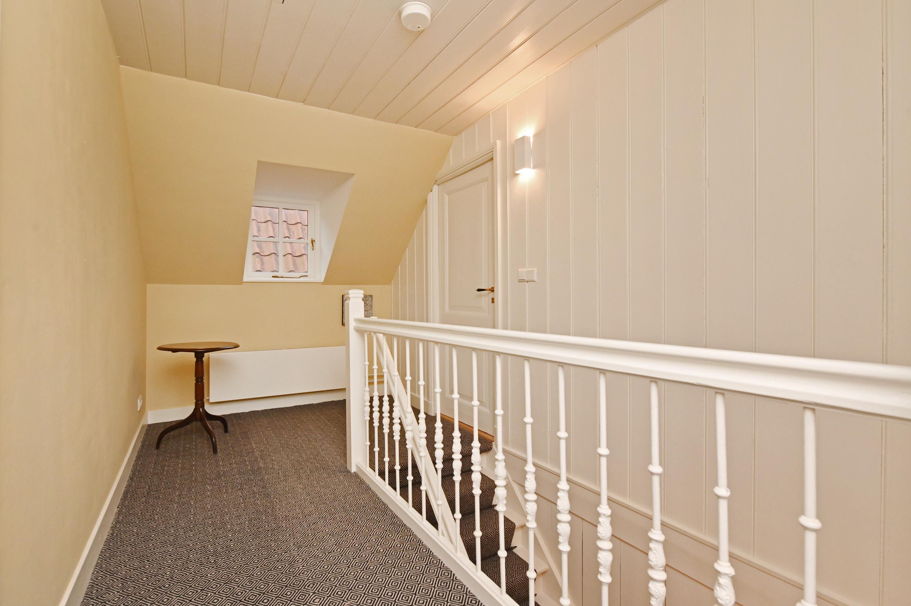 Trap naar de tweede volledige etage met twee slaapkamers aan de achterzijde, beide met een eigen wastafel en een grote open zolder met een hoogte van ruim 3 meter. Deze zolderkamer met zicht op de robuuste spanten is goed in te delen in bijvoorbeeld een slaapkamer en een waskamer. Hier zijn ook de aansluitingen voor de wasmachine en de droger en de opstelplaats van de CV-ketel plus boiler. Moderne toiletruimte. Moderne badkamer met royale inloopdouche, designradiator, design toiletkast en dakvenster.
