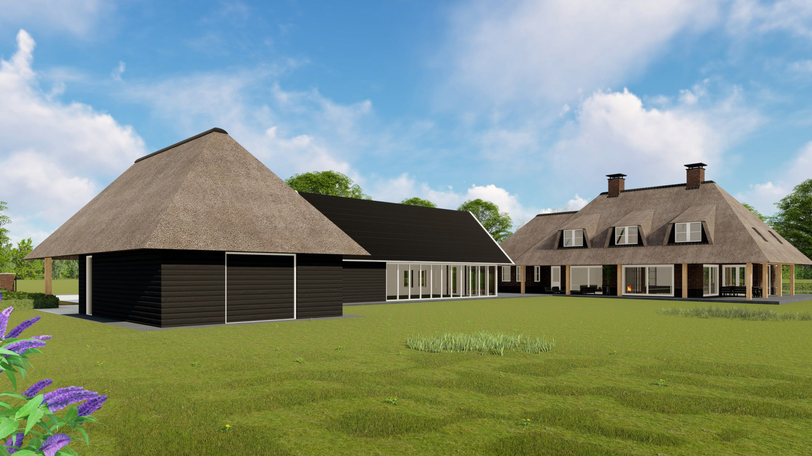 The architect involved in this design is Bekhuis & Kleinjan. The design is inspired by country living with reference to the traditional Drenthe farmhouse but with all the luxury and comfort of today. The house features thatched roofs with brick chimneys, sturdy oak beams and pillars, large windows oriented toward beautiful natural surroundings, wide roof overhangs with covered wine & dine areas, a pool house (or guesthouse) with wellness facilities, and a spacious double garage with attic and carport. All of this is arranged in a horseshoe layout to ensure maximum privacy. In addition to the construction drawings, a garden design is also available. The permit is valid indefinitely, allowing the house to be positioned freely on the plot, with the condition that the old house will be demolished. The existing house is perfectly habitable during the construction of the new residence. The existing home built in 1945, has three bedrooms, a bathroom, a semi-open kitchen, and a living room with a south-facing terrace.