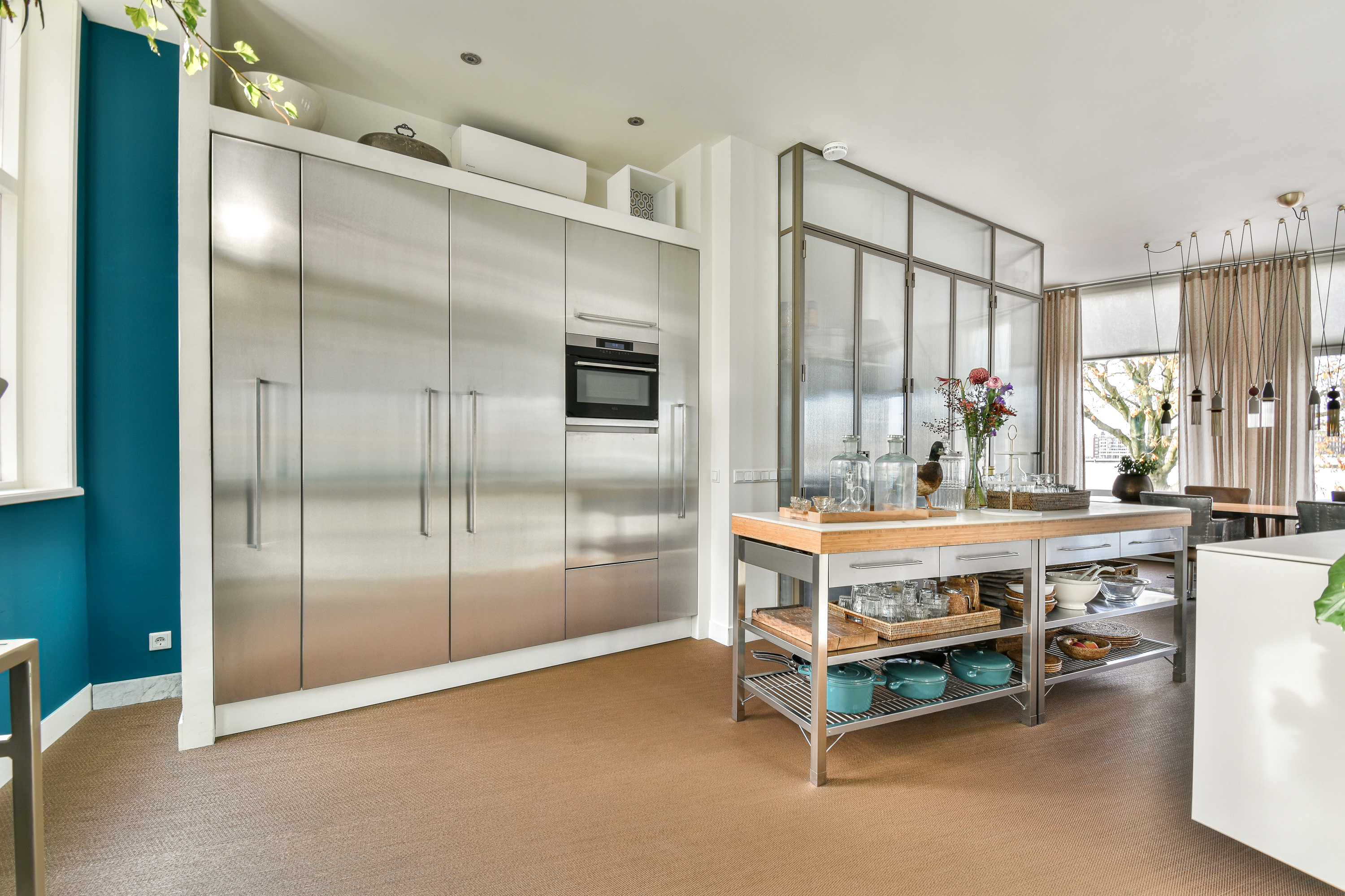 The kitchen, positioned on the terrace side, is appointed to a luxury standard and equipped with high-end built-in appliances, including a separate refrigerator and freezer, dishwasher, Quooker hot-water tap, induction cooktop with integrated extractor, and combination microwave oven. An air-conditioning unit ensures optimal climate comfort.