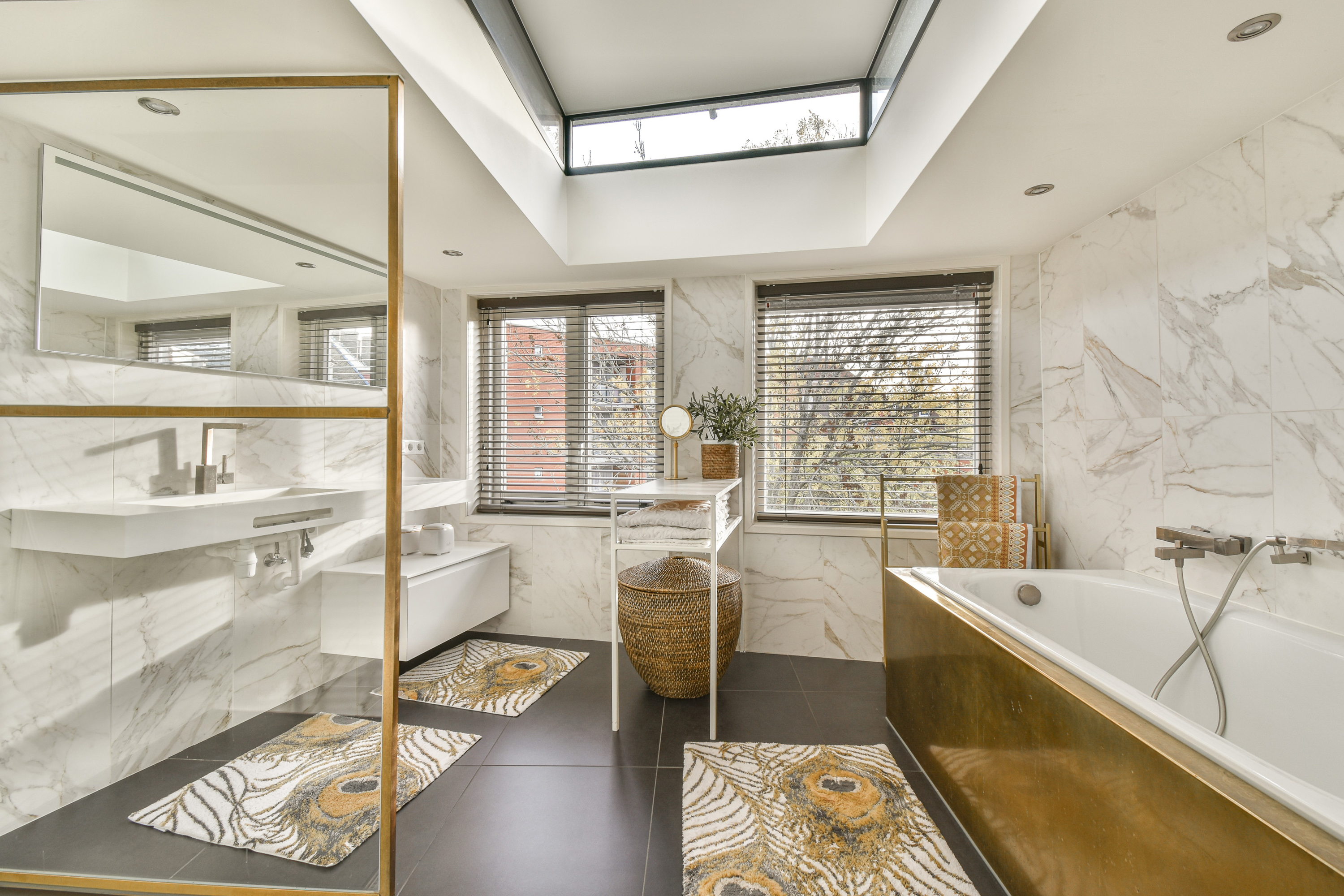A luxurious bathroom benefiting from beautiful natural light, equipped with a bathtub, walk-in shower, and elegant vanity unit. A built-in cupboard houses the central heating combi-boiler.