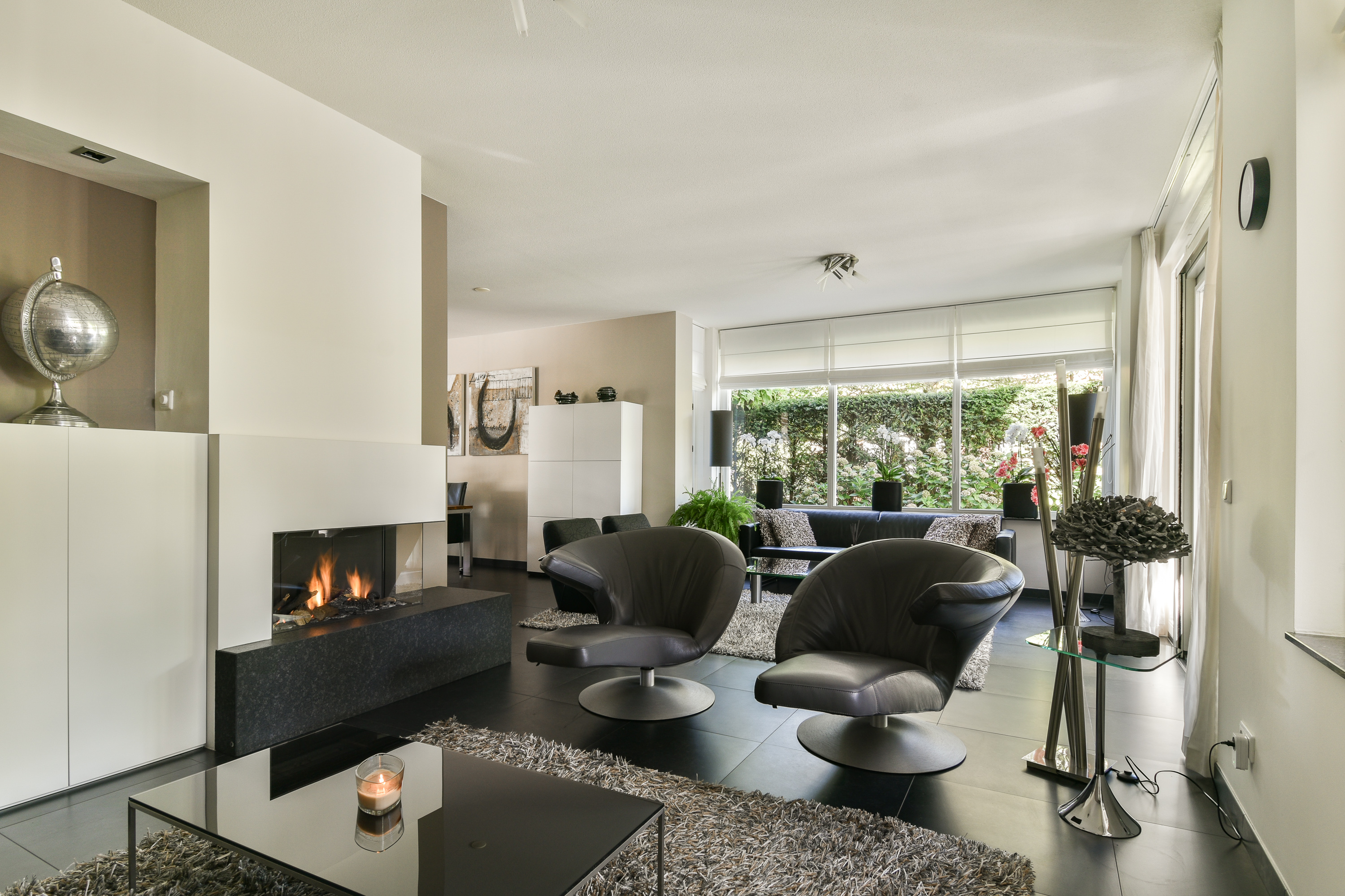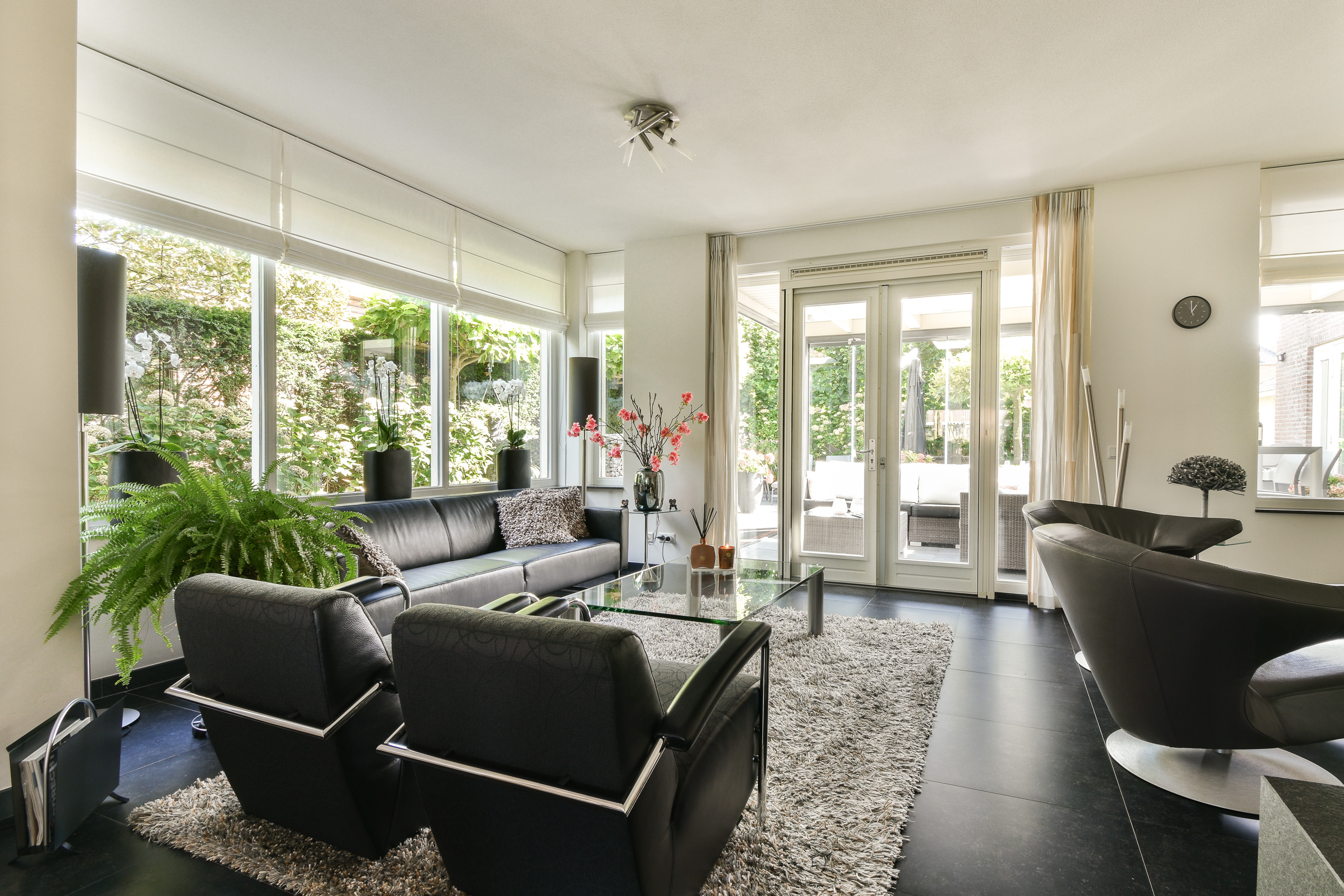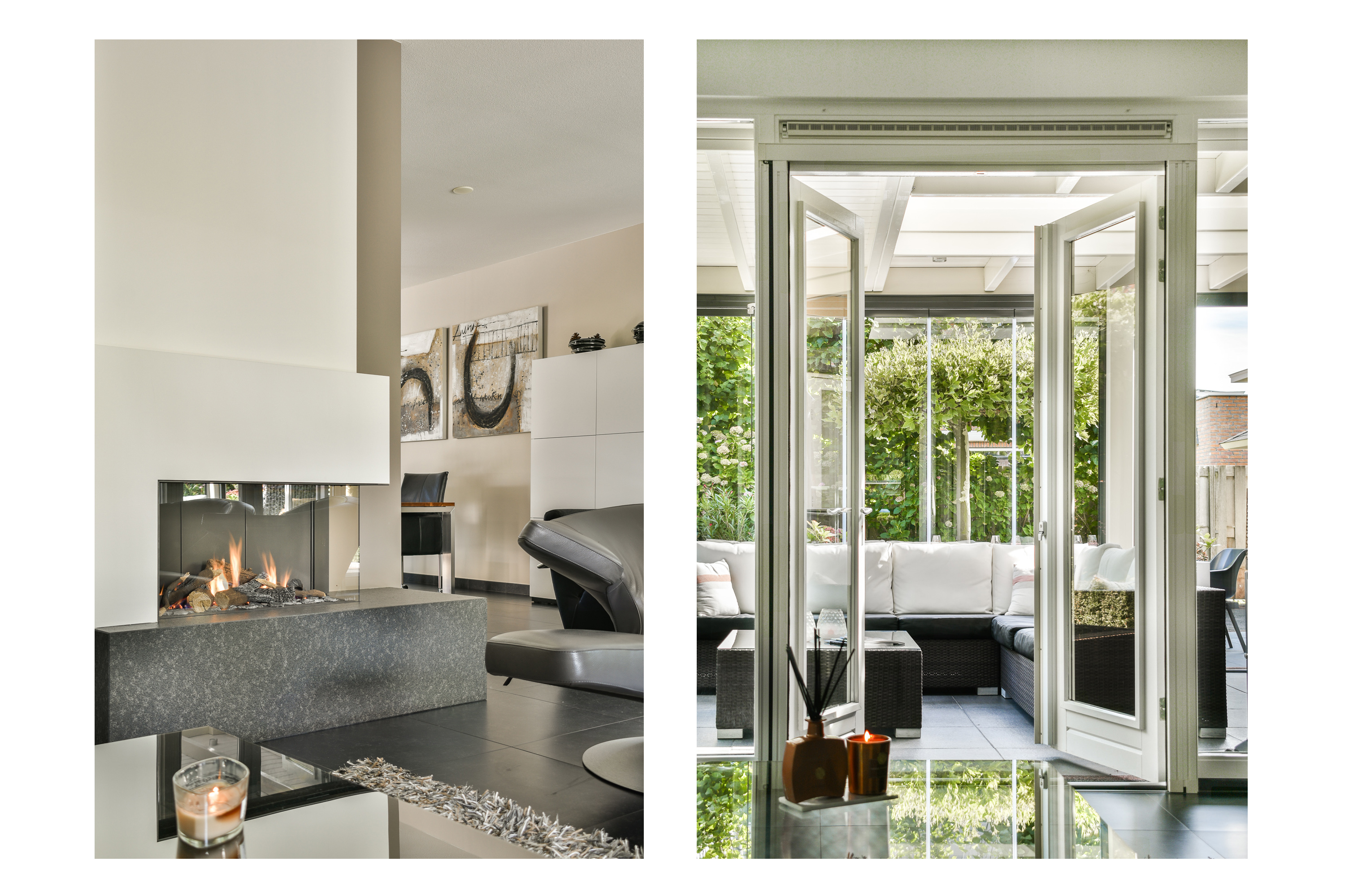 Via dubbele zwart stalen deuren komt u in de living, waar ruimte en sfeer naadloos samenkomen. De woonkamer is verdeeld in een eetgedeelte dat keuken met woonkamer verbindt en een zitgedeelte aan de achterzijde met sfeervolle haard, toegang tot de aanbouw en via dubbele deuren toegang tot de serre (ca. 3,41 x 6,25 m.) en tuin.