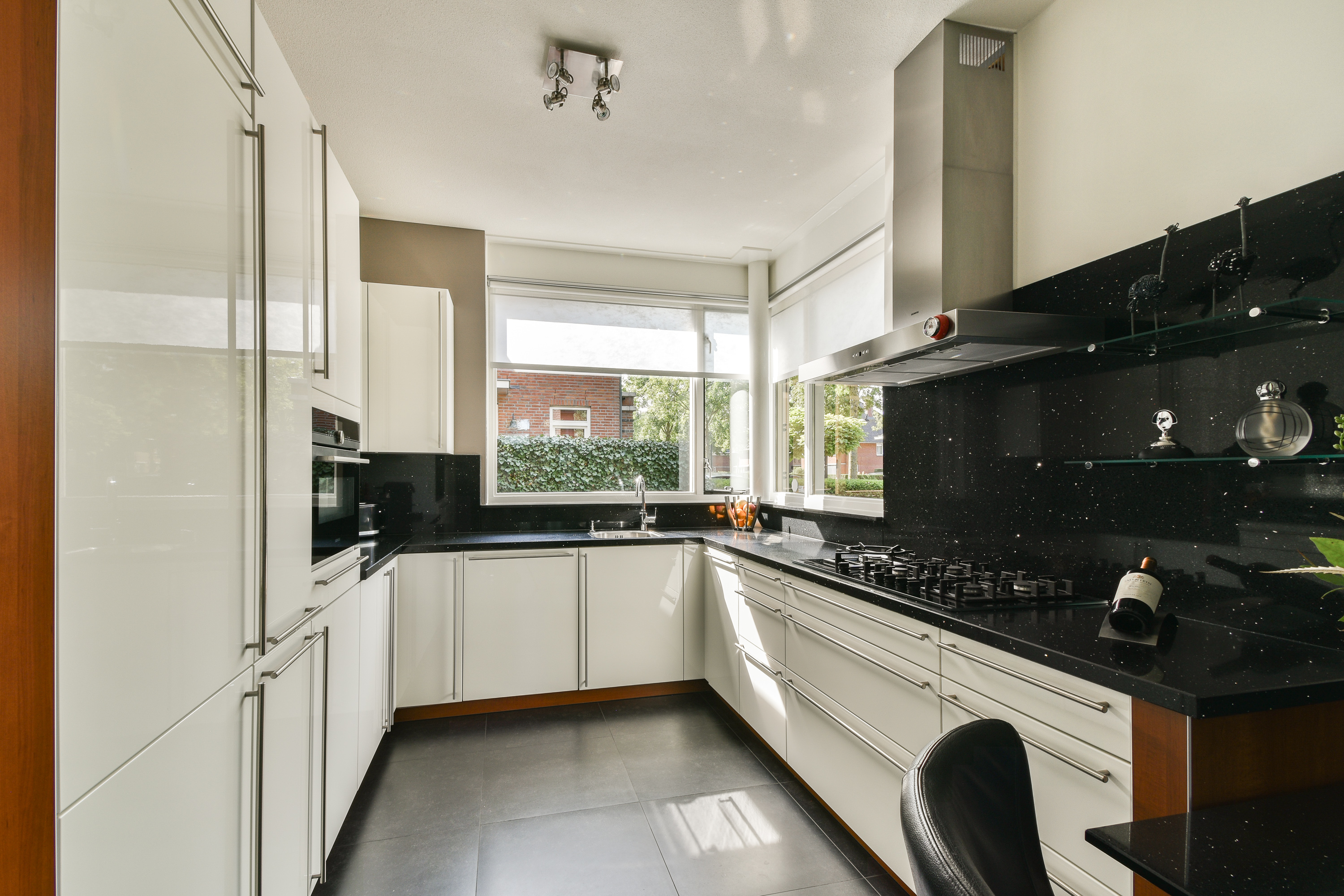 De open keuken aan de voorzijde is in U-vorm opgesteld met een composiet blad en luxe inbouwapparatuur, te weten: een 5-pits gaskookplaat met rvs afzuigschouw (Siemens), een combi-oven (Siemens), een koel-/vriescombinatie (Bosch) en een vaatwasmachine (Bosch). Aan de zijkant betreedt u via dubbele deuren de zijtuin.