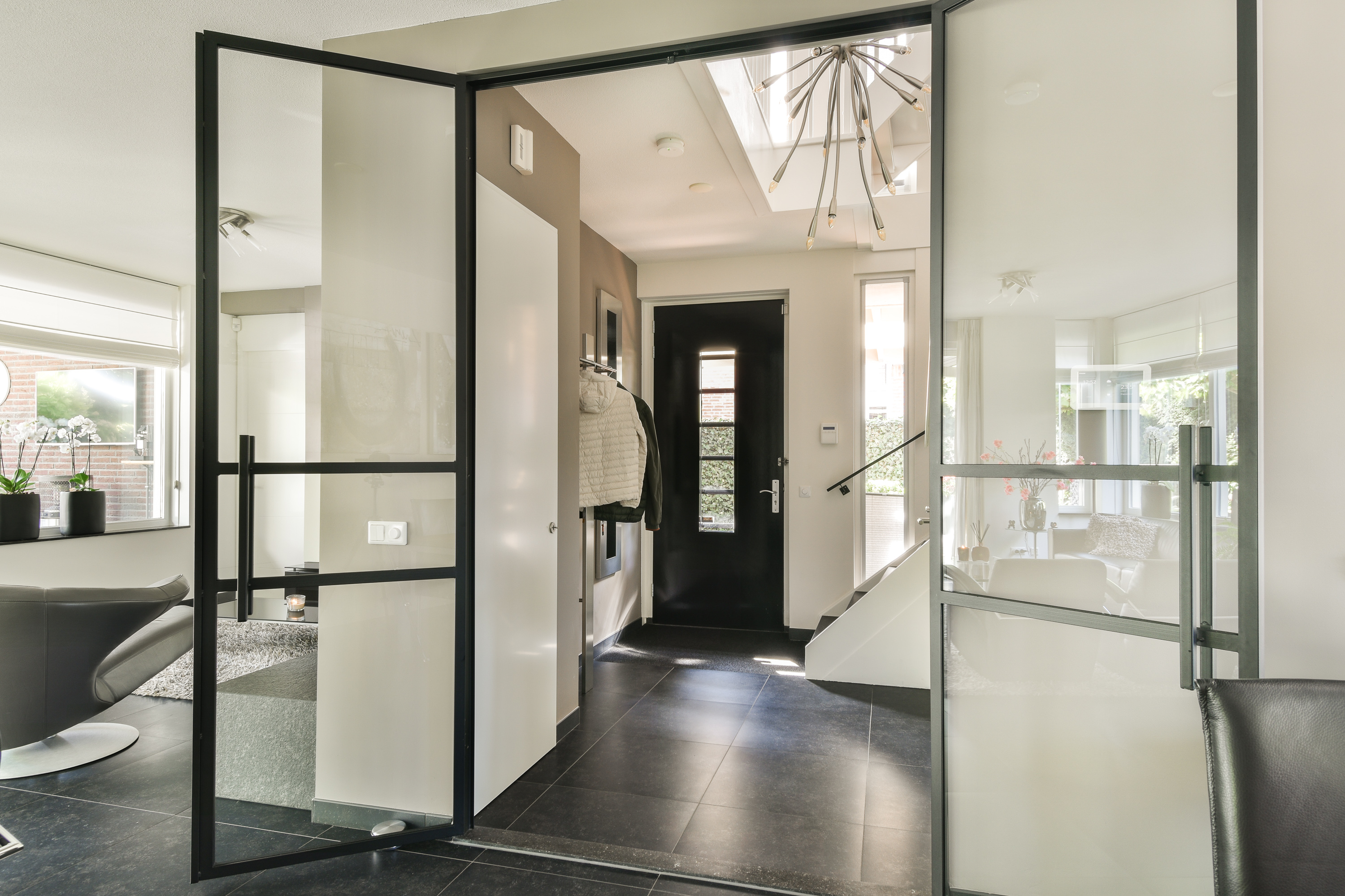 Via de stijlvolle entree met hoge raampartijen betreedt u de opvallend goed onderhouden woning. De ontvangsthal is ruim en licht en biedt toegang tot een luxe toiletruimte, een praktische garderobekast, de meterkast (met 14 groepen en 4 aardlekschakelaars) en een moderne trapopgang naar de verdiepingen.