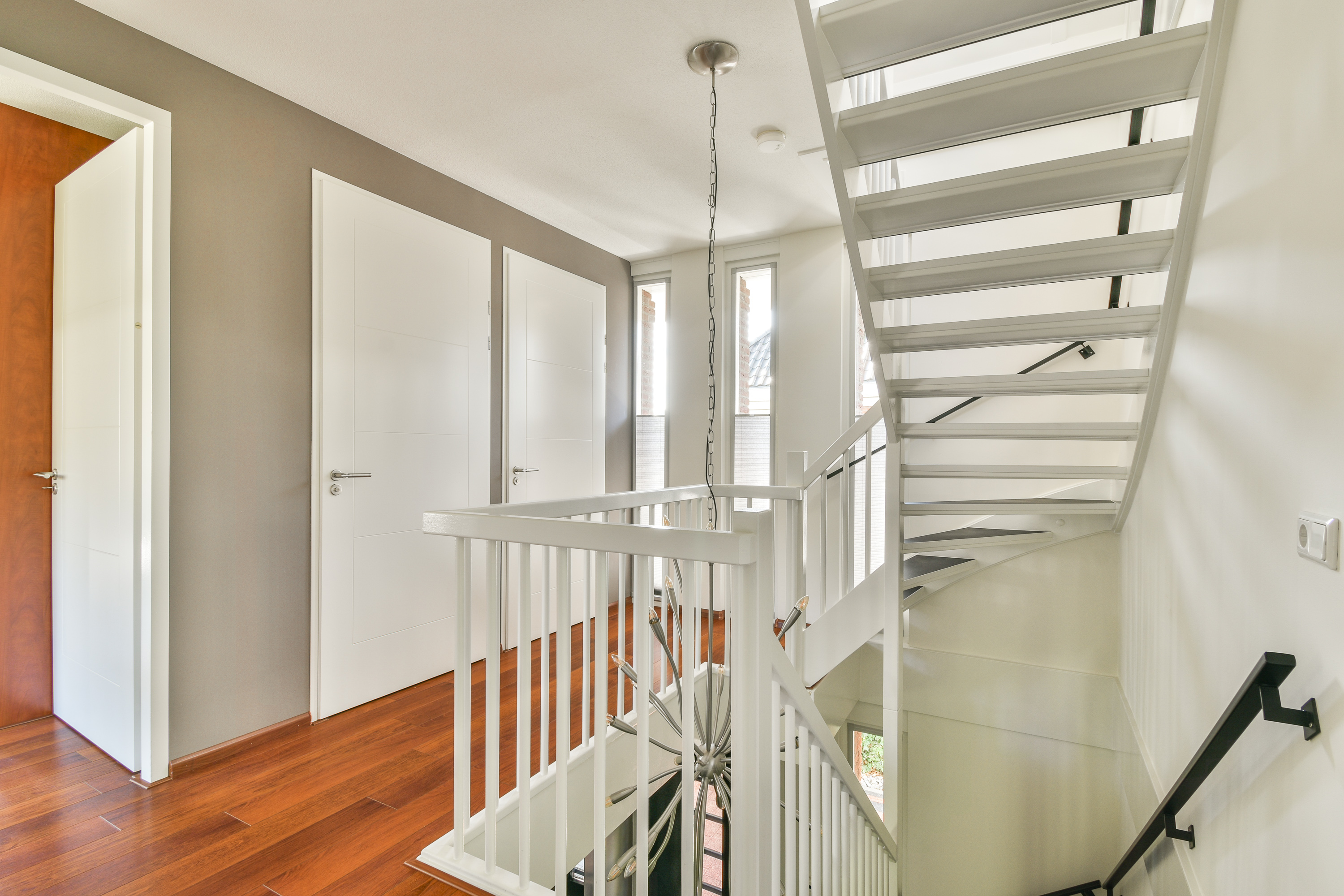 Rondom de lichte en centrale overloop met vide en fraaie verticale raampartijen in de zijgevel, bevinden zich de diverse vertrekken op deze verdieping.