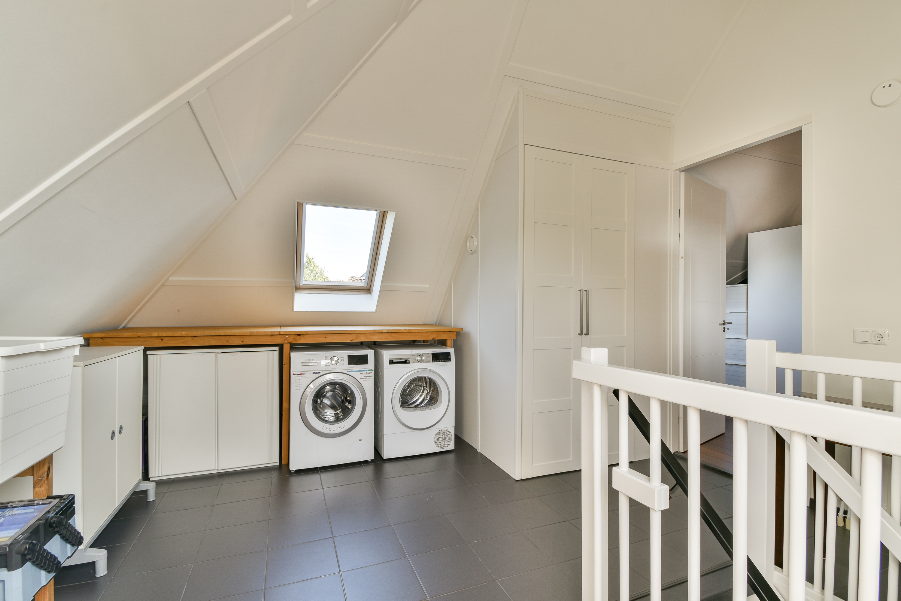 U komt boven in een zeer royale open ruimte die is afgewerkt met een plavuizen vloerafwerking en twee dakvensters. In deze ruimte bevinden zich, naast veel bergruimte, de wasmachine en droger en de CV combiketel (Intergas HR uit 2024).