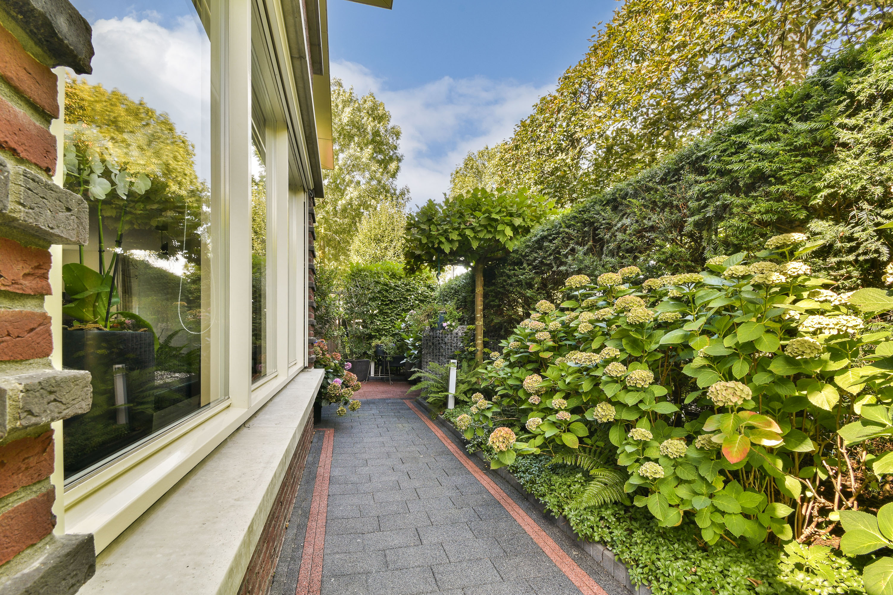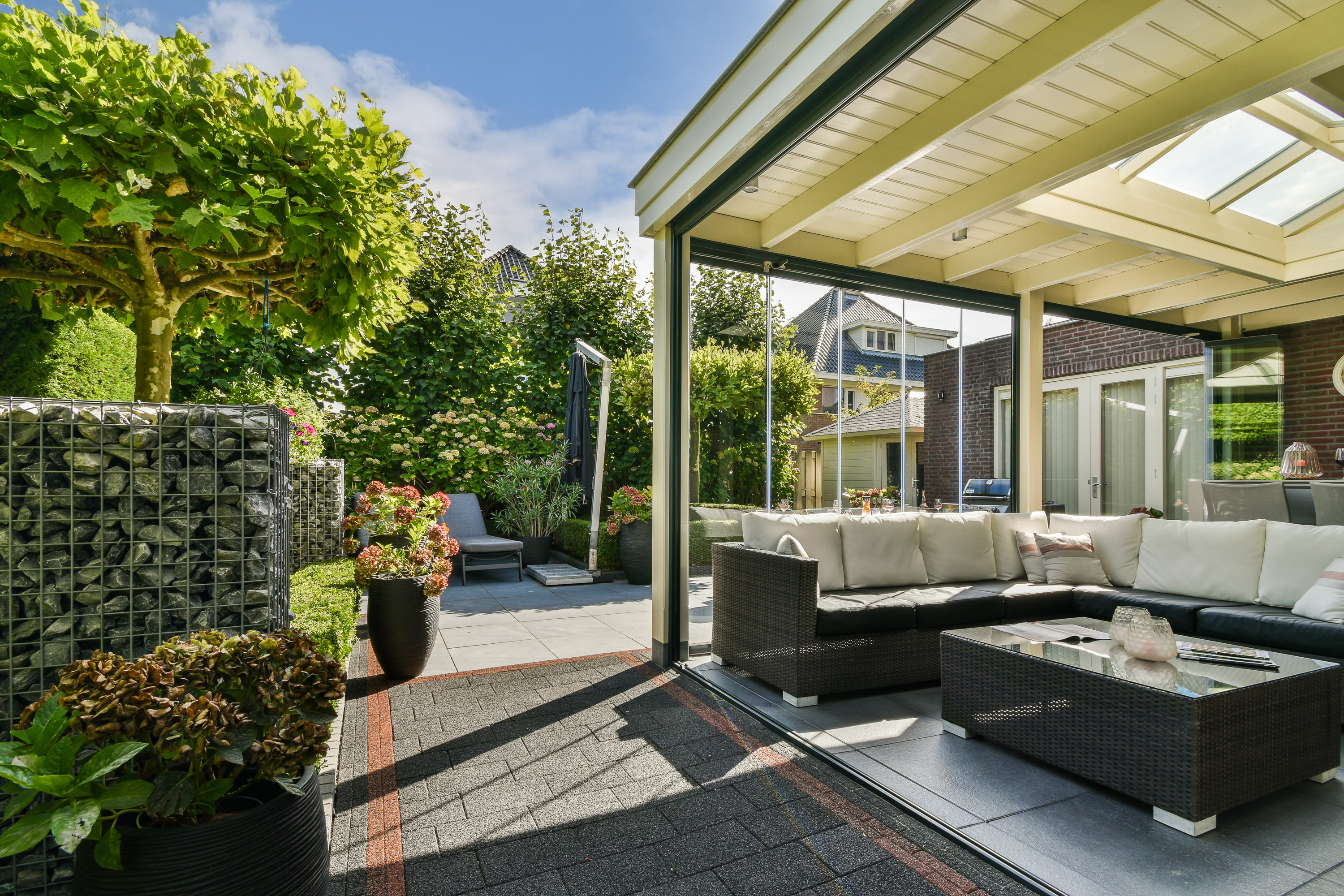 De tuin is rondom en opvallend fraai en verzorgd. Het begint al met de bestrate oprit met carport en de voortuin met planten. De zij- en achtertuin zijn eveneens zeer verzorgd aangelegd met hortensia's, planten, struiken en hagen, maar ook terrassen, electra en verlichting. Als kers op de taart is er een heerlijke en royale serre aangebouwd aan de woonkamer met een glazen (te openen) wand, electra en een dak met lichtstraat.