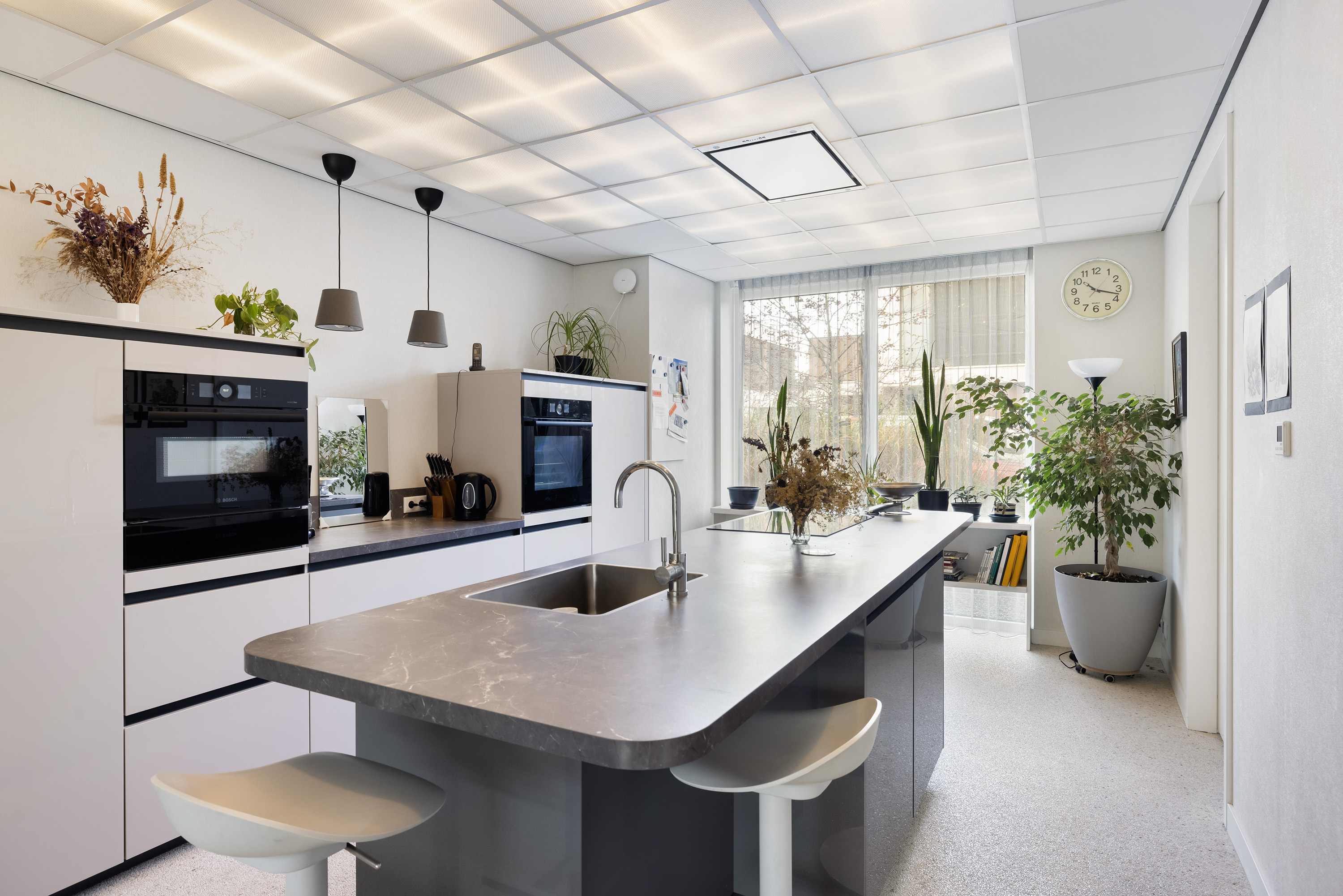 The open kitchen includes a straight-line setup and a central island with breakfast bar. High-end finishes include an induction hob, extraction system, sink with mixer tap, dishwasher, fridge, steam oven, combi microwave, warming drawer, and plenty of storage and drawers. The dropped ceiling features dimmable recessed lighting.