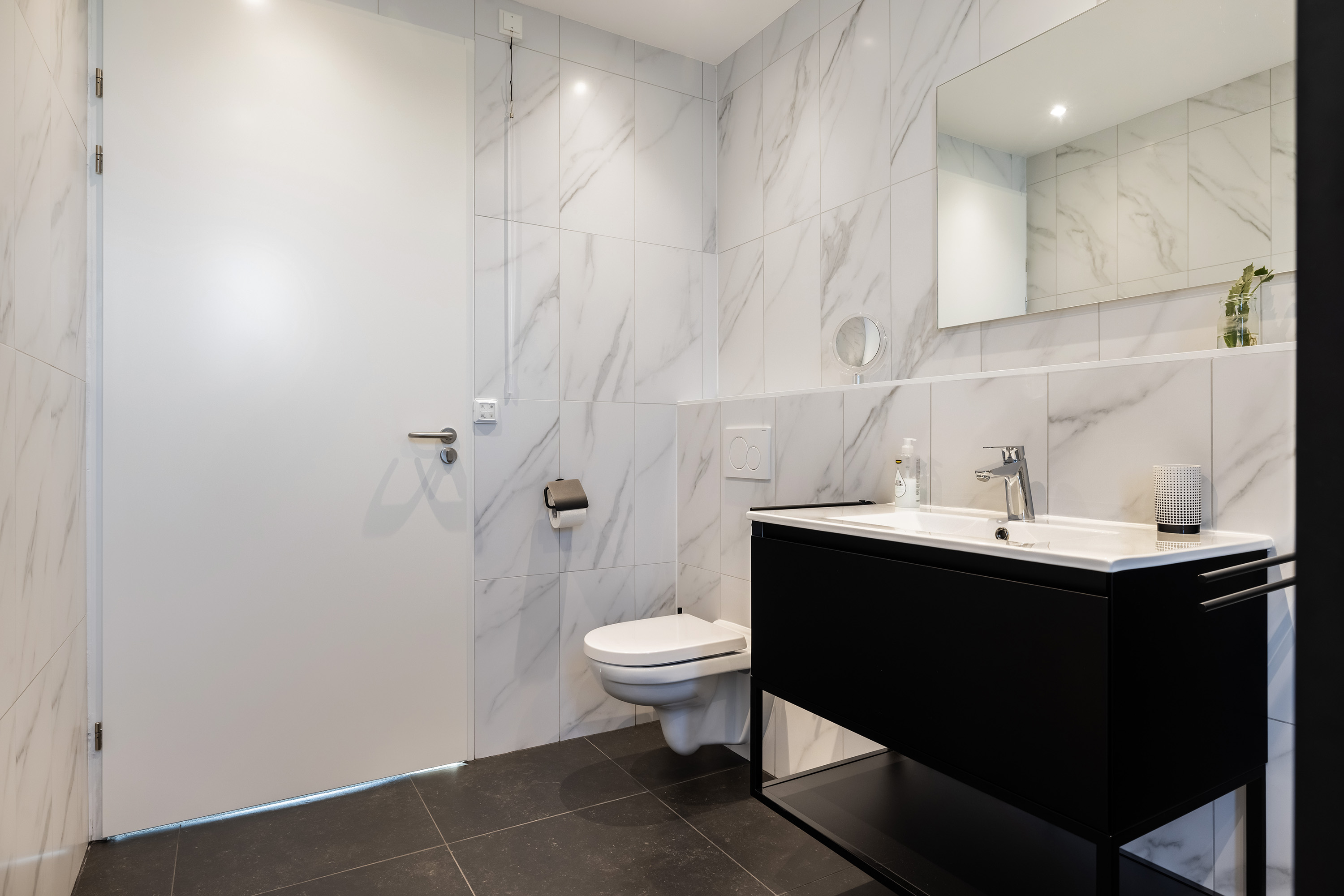 Also accessed from the kitchen, this luxurious fully tiled bathroom features a walk-in shower with thermostat tap, wall-hung toilet, and washbasin unit. It connects to the adjacent bedroom via a sliding door.