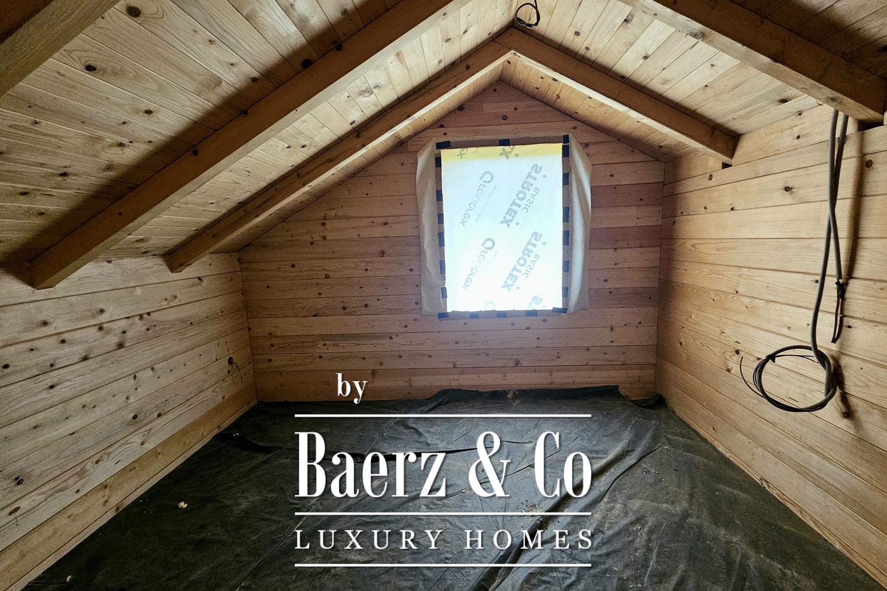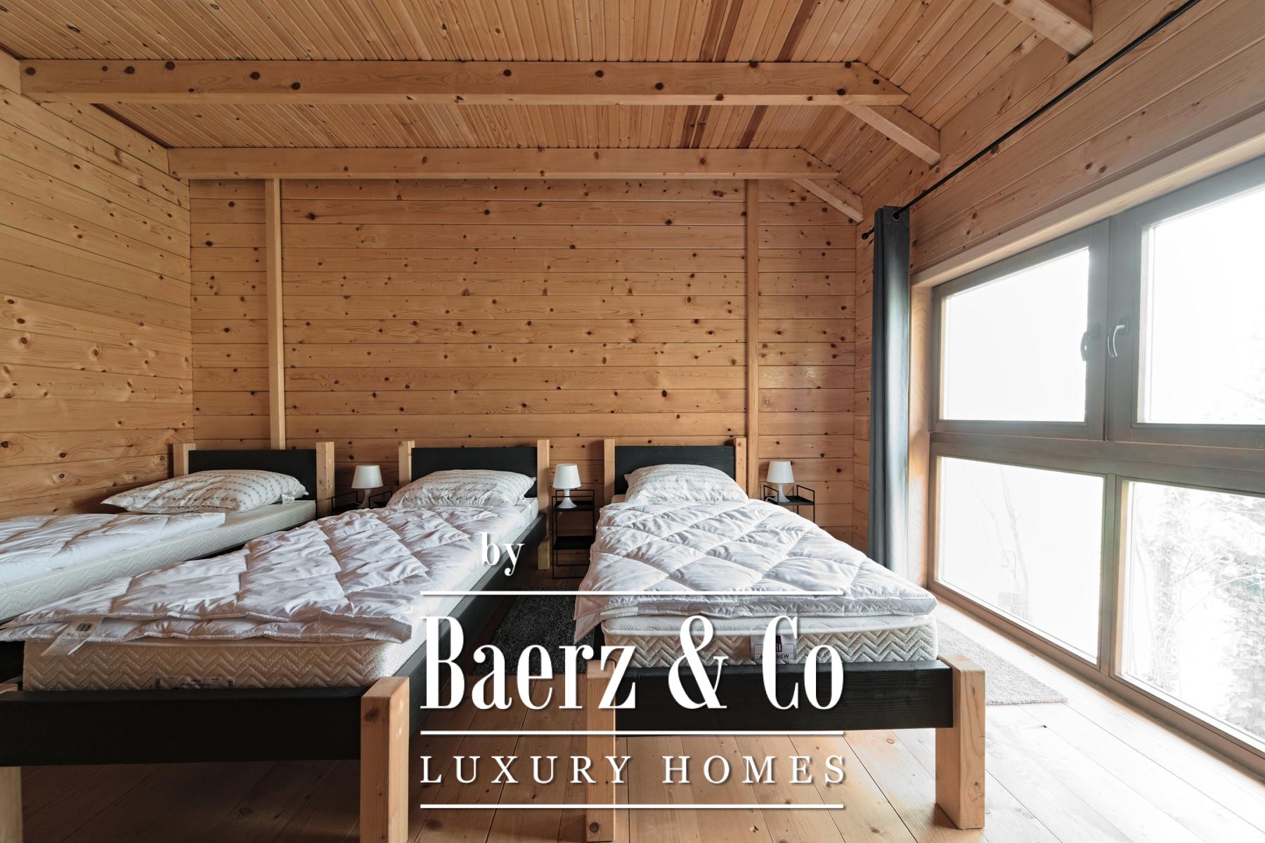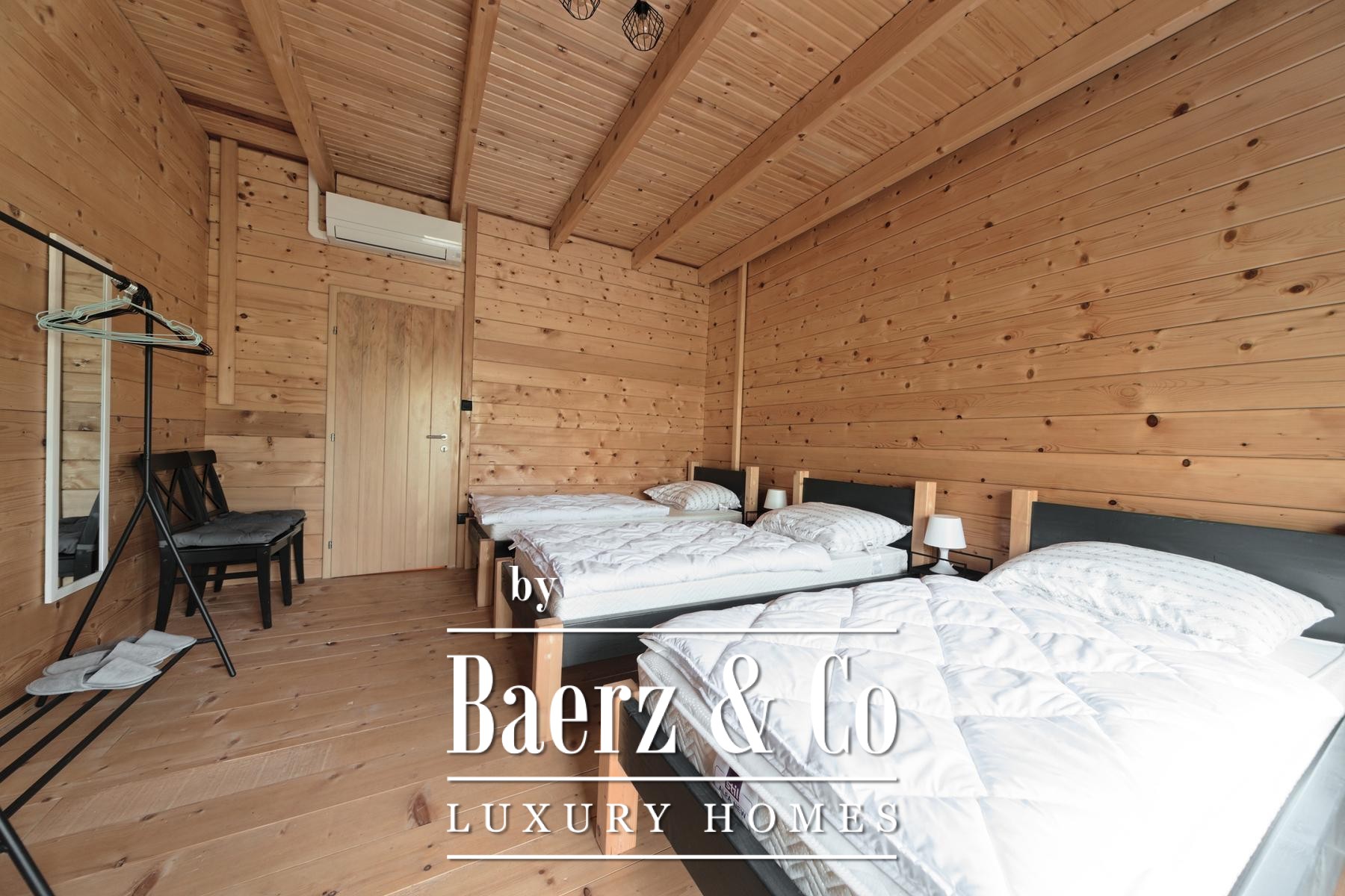Adjacent to the main house, five newly completed wooden residences each offer 80 m² of living space. The layout includes a bright ground-floor living area and bathroom, while two bedrooms occupy the upper level. Private terraces at the back look onto the generous grounds, with heating designed for efficiency and autonomy.
