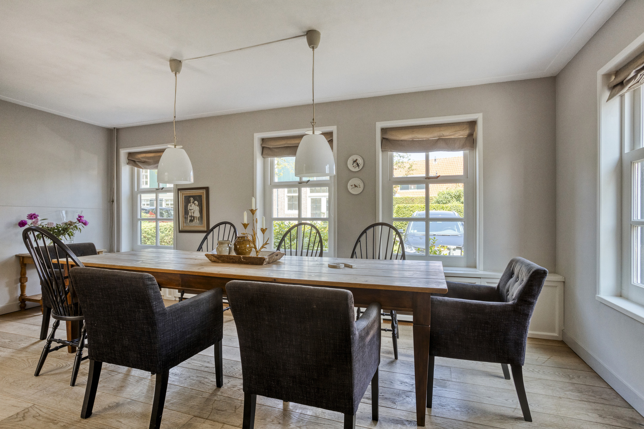 Through the front door, you enter a hallway that leads to the front house. At the front is the semi-open kitchen, equipped with a 5-burner gas hob, oven, dishwasher, and a freestanding fridge-freezer. Adjacent to the kitchen is the cozy dining room with beautiful light from the large windows, forming the warm heart of the home. Next to the dining room is a comfortable living room, which can easily switch functions with the dining room if desired. From the dining room, a staircase also leads to the first floor of the front part of the house.