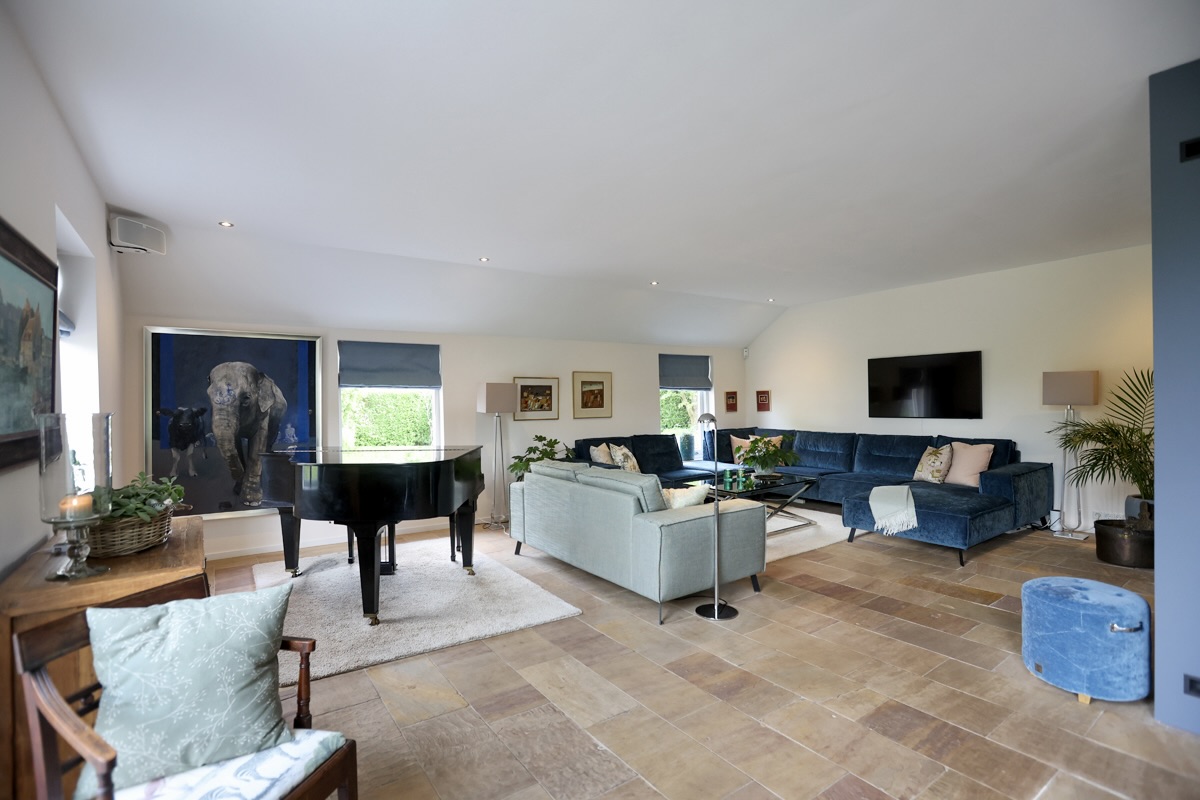 As you move further into the home, the back opens up to a surprisingly large and bright living room, where a fireplace sets the tone for cozy winter evenings. This space flows seamlessly into the dining area and modern open-plan kitchen, fitted with high-quality Miele built-in appliances – together forming the heart of the home with a view of the deep garden and vast landscape beyond. No painting can match the beauty of this view. A nearby utility room offers extra storage and convenience.