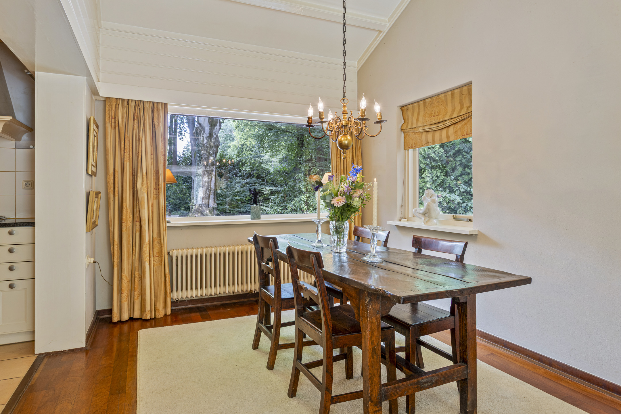 Het huis ligt iets verhoogd ten opzichte van haar omgeving en wordt omgeven door een diepe, landschappelijk aangelegde parktuin, met rododendrons en oude beuken, eiken en Douglas-sparren, die als wachters rondom staan. Op de veranda groeit een grote blauwe druif die zich met haar bladerdak en dikke druiventrossen als een natuurlijke parasol uitstrekt boven het terras. Deze perfect onderhouden tuin, gaat moeiteloos op in de bosrand, die de percelen als een groene ketting met elkaar verbindt.