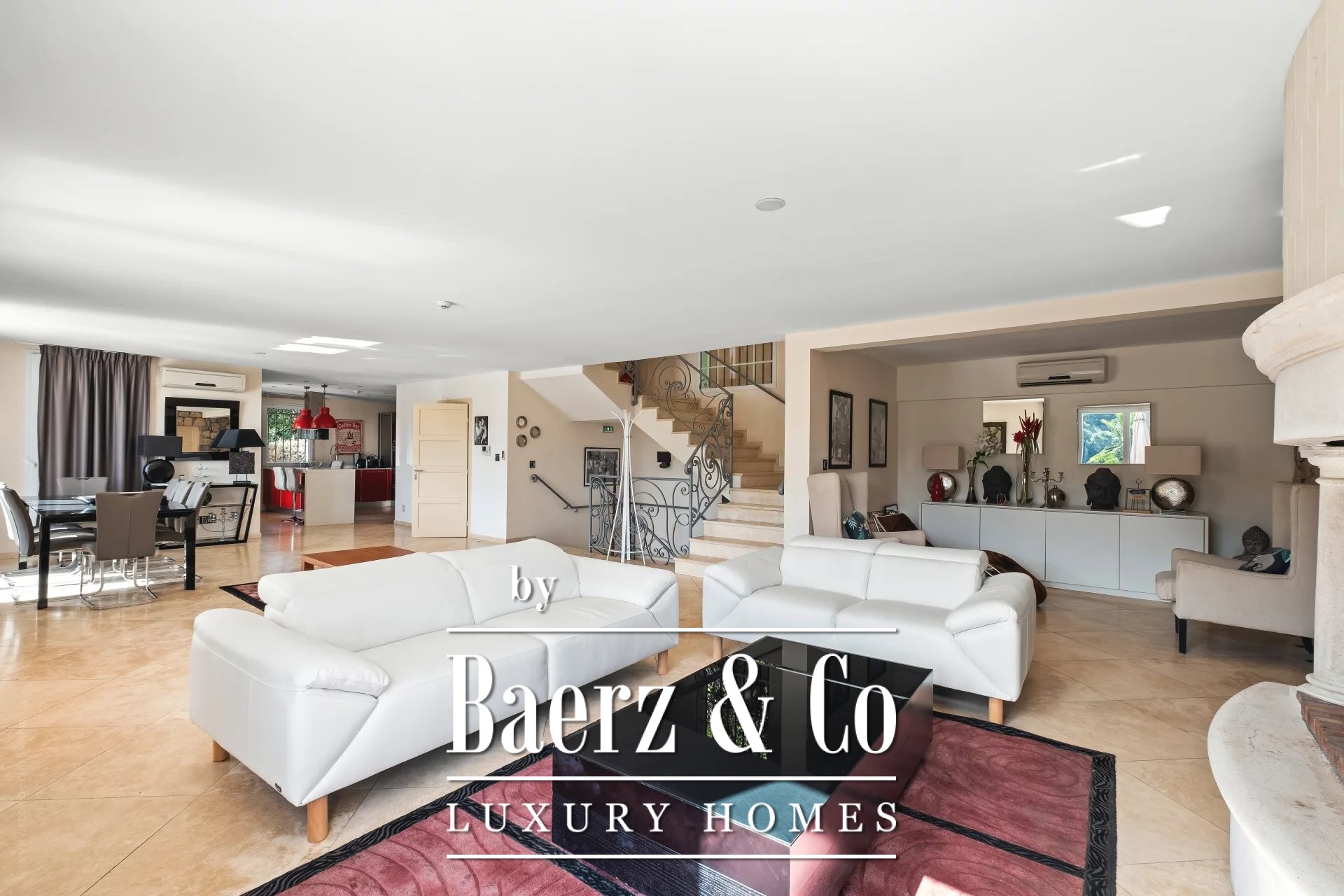An independent apartment with two large bedrooms, bathrooms, a kitchen and living room extends possibilities for privacy or guests. The landscaped 3000 m² grounds include a spacious pool, a dedicated pool house and broad terraces that open toward the horizon. Amenities such as air-conditioning, fireplace, lift, video security, electric gate, and covered garage imbue the property with discretion and comfort. This villa offers a refined pace of life, set against panoramic Mediterranean vistas.