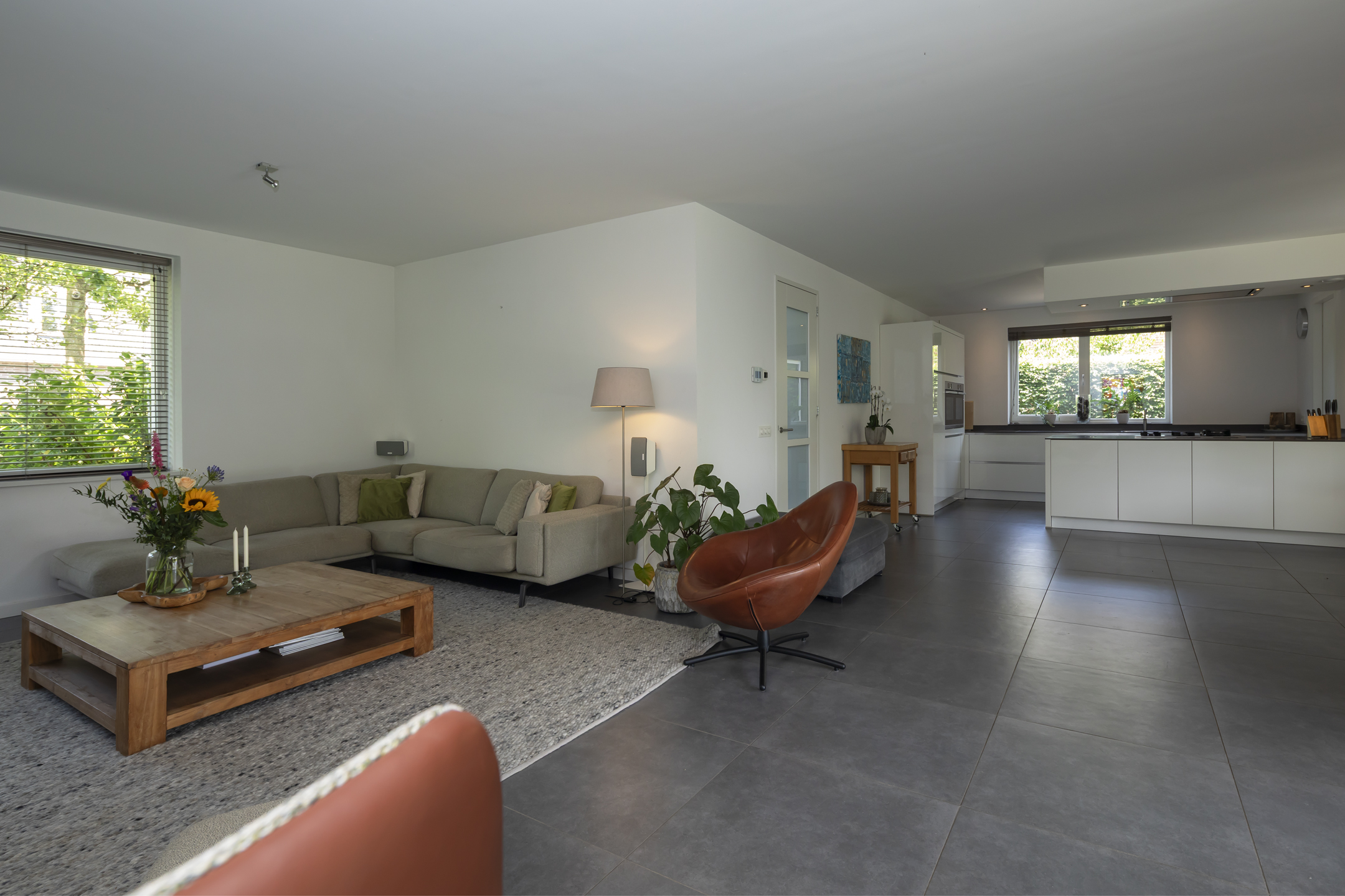 Cooking enthusiasts will be in their element here! This luxurious kitchen is equipped with a convenient Quooker, a steam oven and a convection oven, a refrigerator, and a dishwasher. The island has a 4-burner gas cooktop and a wok burner, and the extractor hood is integrated into the ceiling. The kitchen features a beautiful composite countertop and offers ample work and storage space thanks to the wide drawers and cabinets. It is handleless and finished in high-gloss white, which contrasts beautifully with the floor. While you're cooking, you can still enjoy the company of others at the table and not miss a thing.
