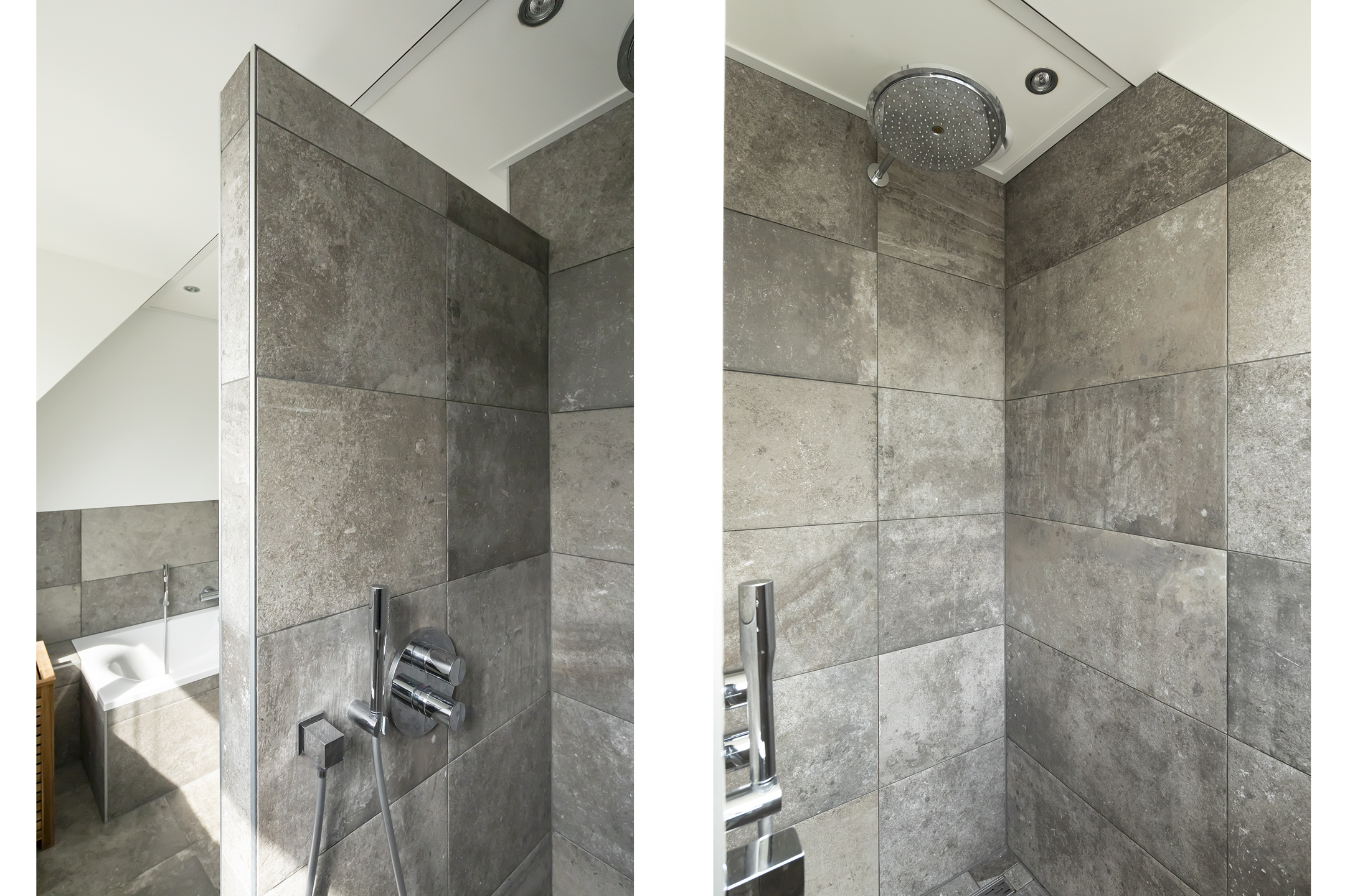 The bathroom is fully equipped with a large bathtub, a spacious walk-in shower, and a double sink integrated into a vanity unit. The bathroom enjoys pleasant natural daylight thanks to the large windows. It is neatly tiled and features comfortable underfloor heating and a designer radiator.