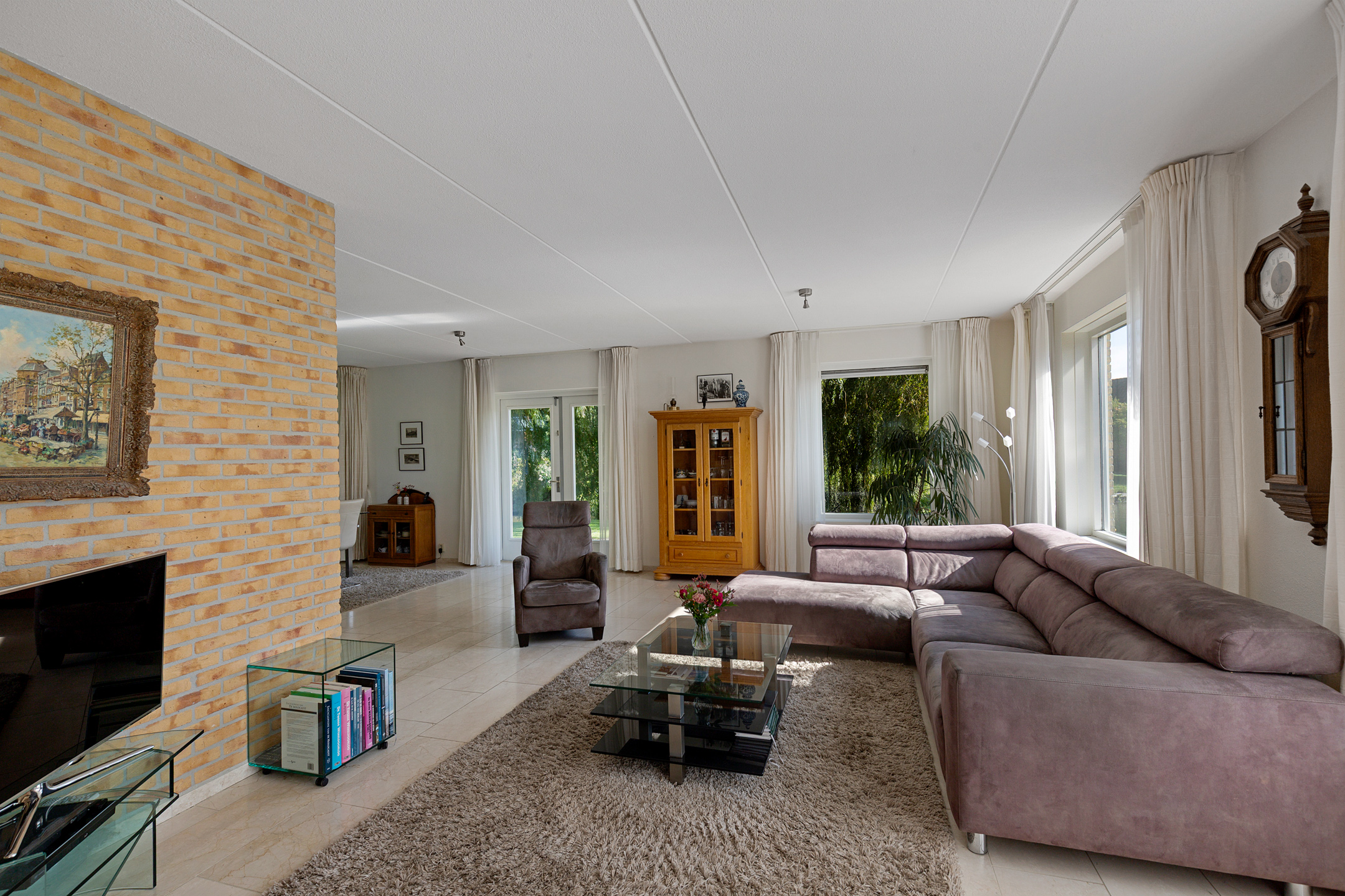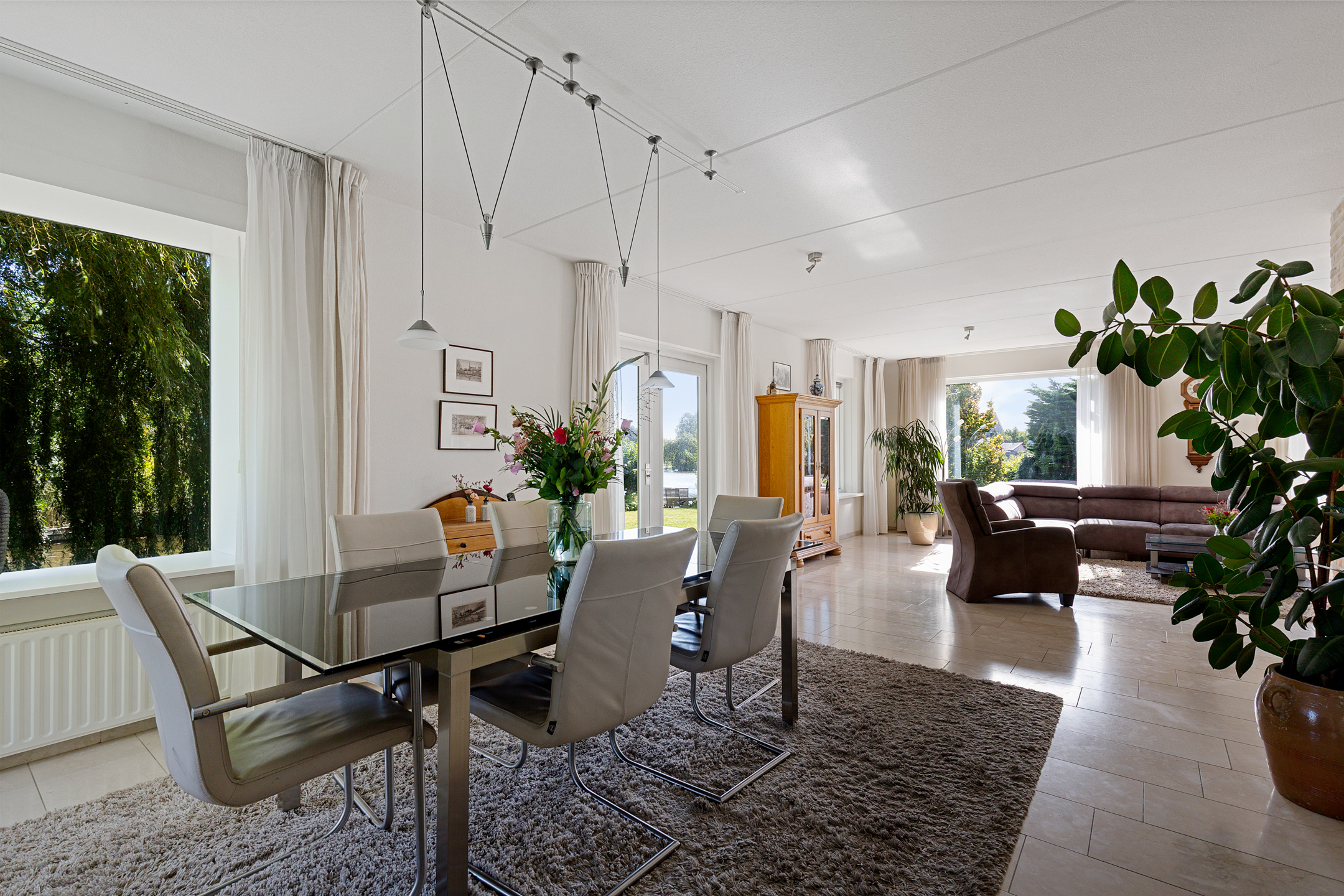 From the living room, the eye is immediately drawn to the sweeping water views and the landscaped garden. The abundance of windows floods the room with natural light, while the stately weeping willows along the water’s edge ensure privacy. The house sits on a corner plot at the end of a cul-de-sac, enhancing the sense of space and tranquillity.