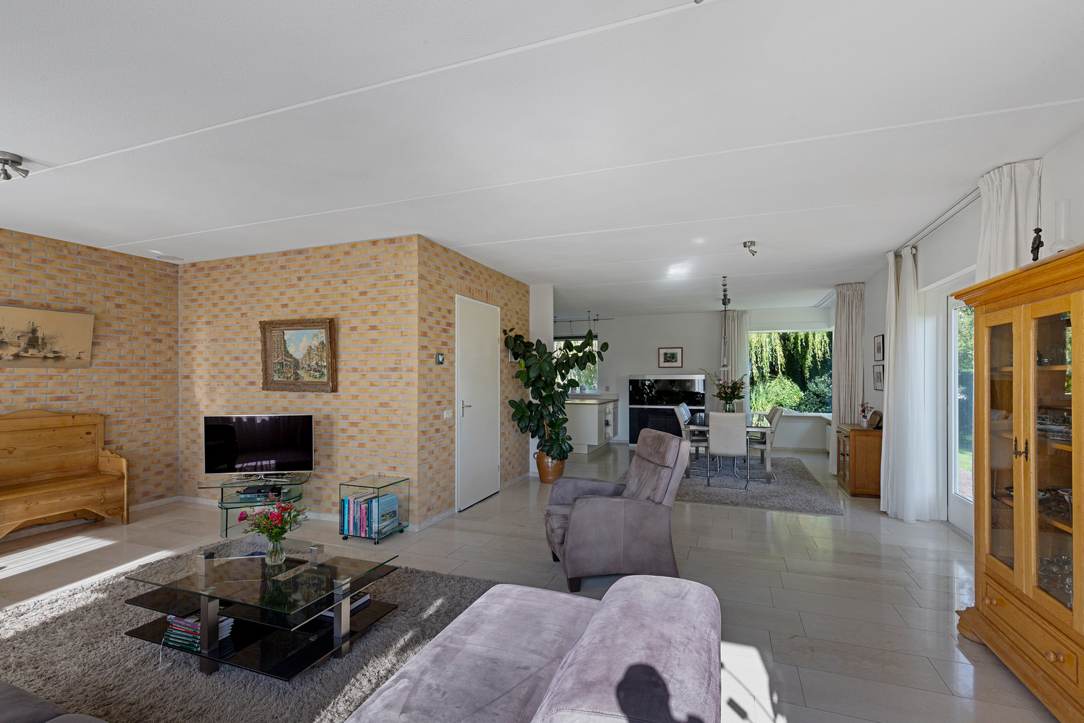 The L-shaped living room extends across the full width of the property and offers many possibilities for arranging seating, dining, and lounge areas to personal taste. French doors open onto the garden. The kitchen is fitted with built-in appliances, and although no fireplace is currently in place, the home does feature a flue connection.