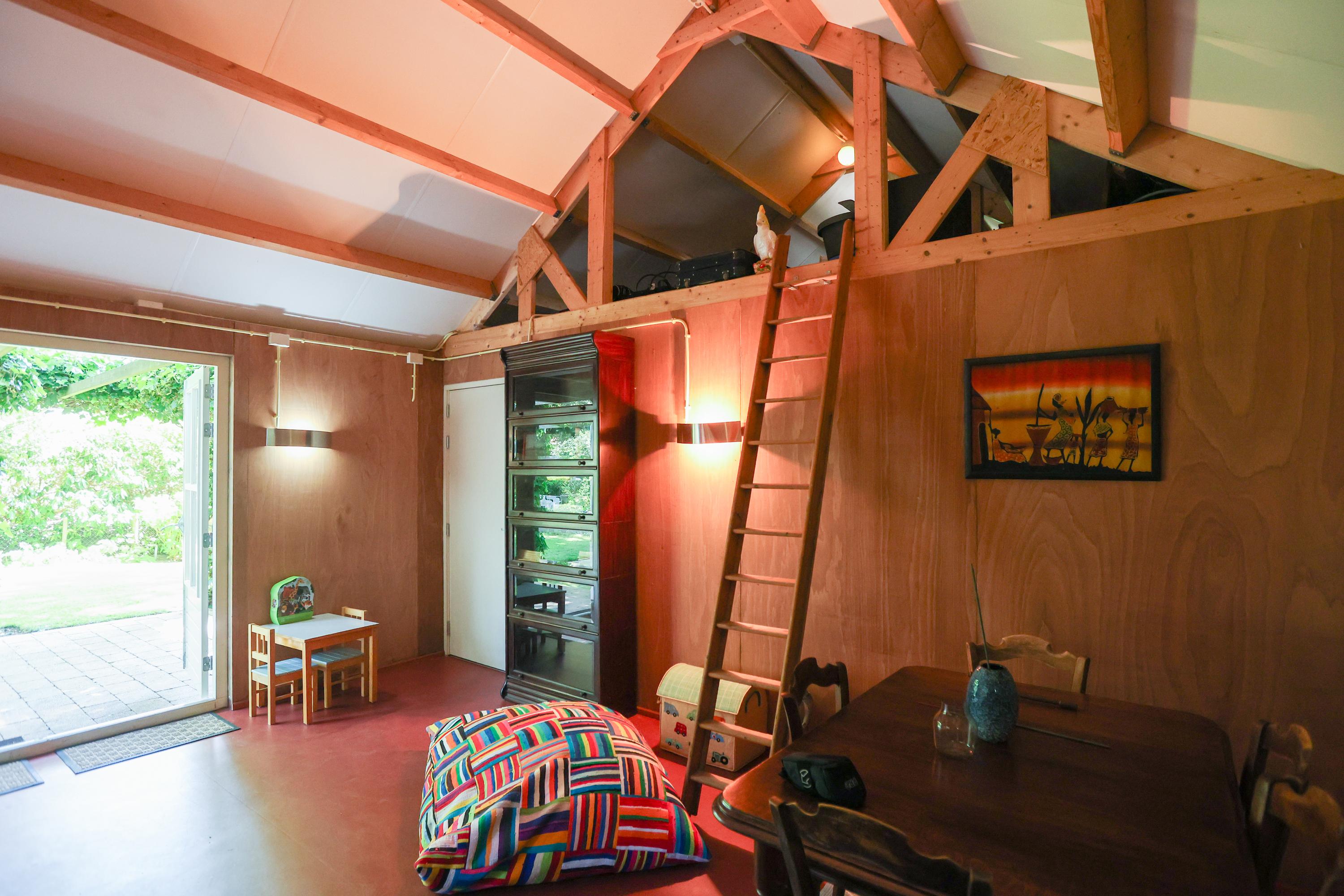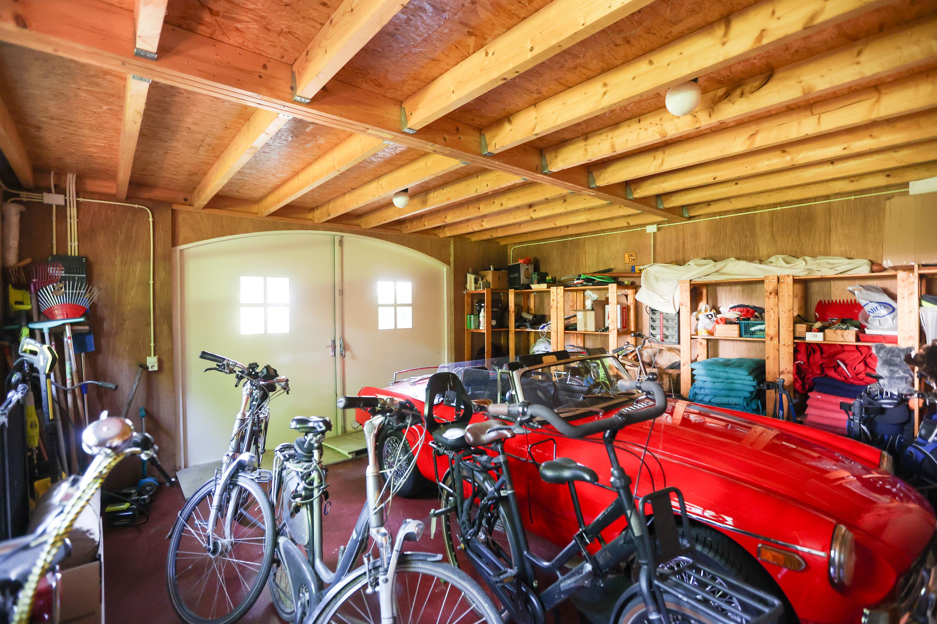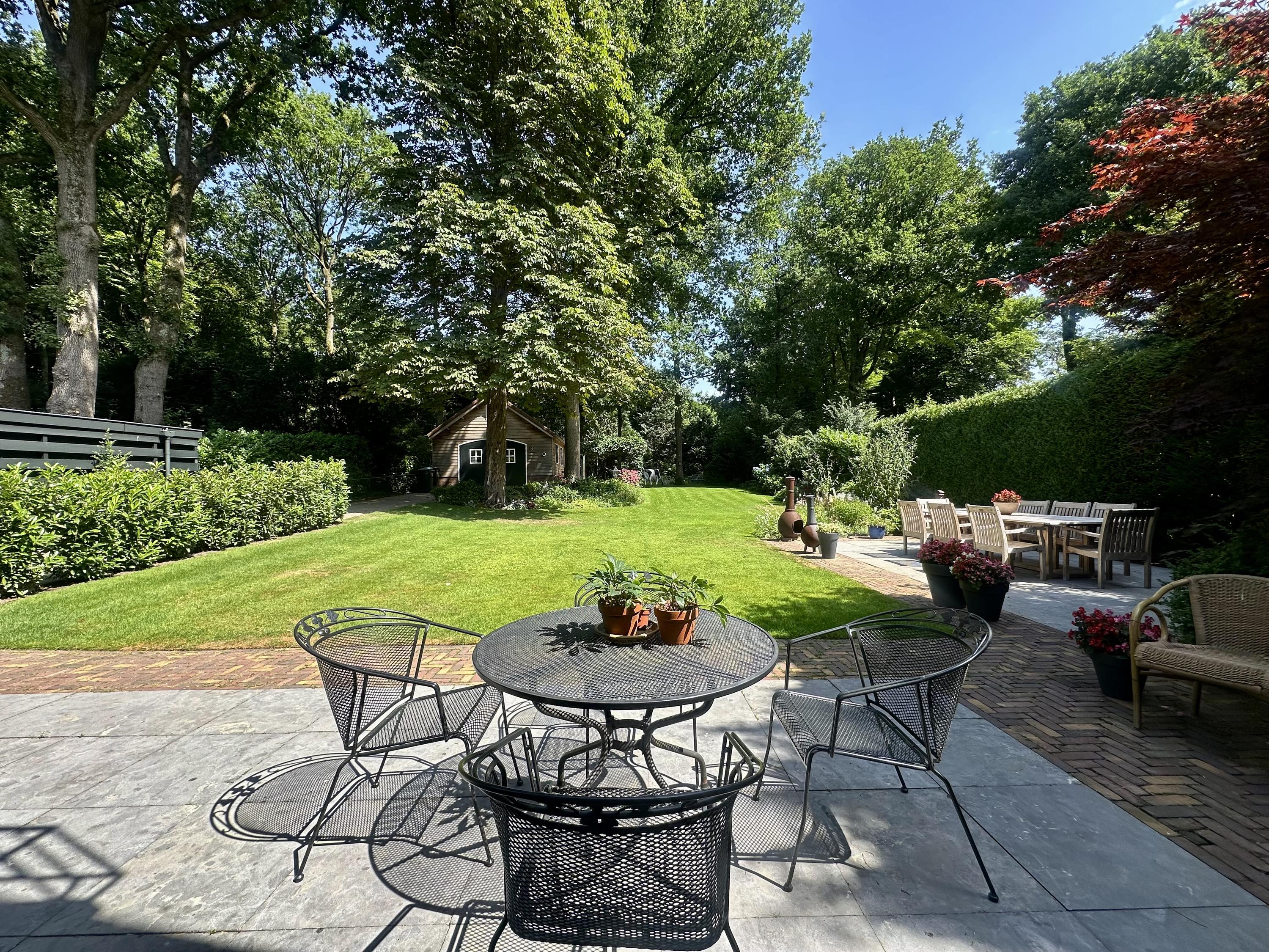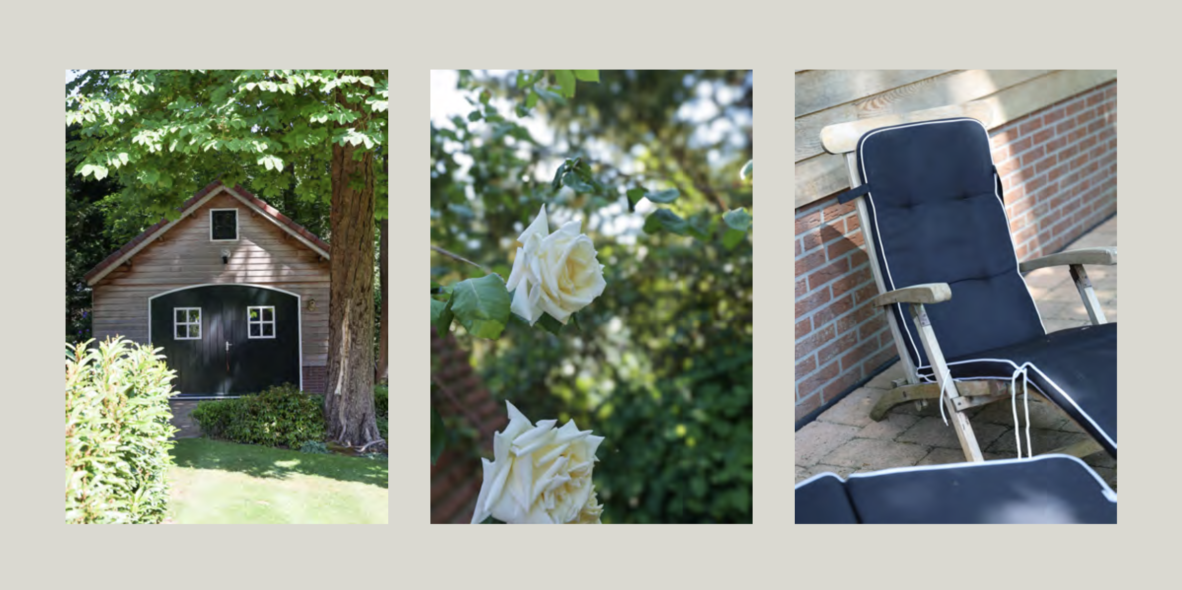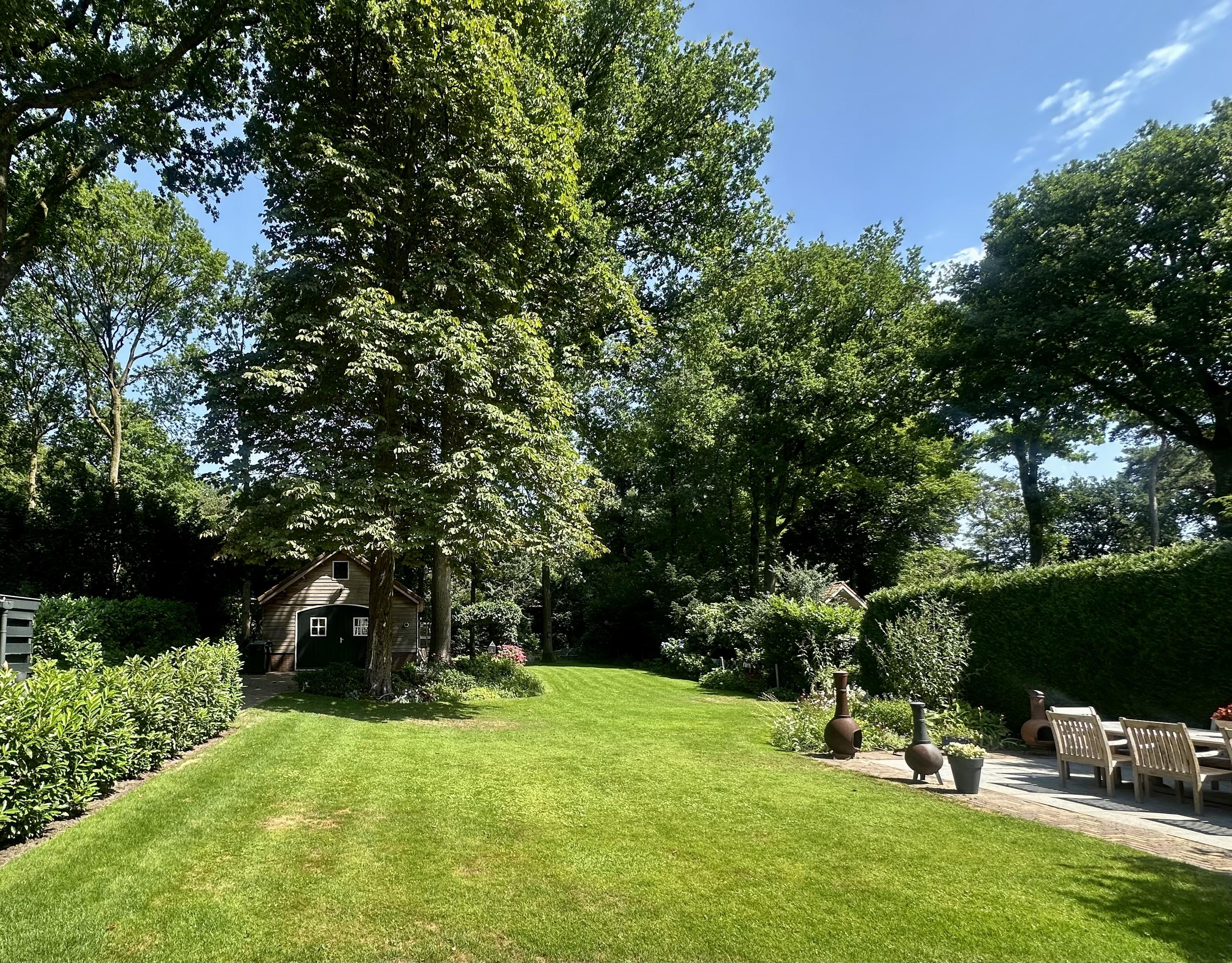 A tree-lined paradise of 1,590 m². Offering complete privacy, sun, shade, room to play or relax – and a detached wooden outbuilding with garage, studio, and storage space. Whether you use it as an office, hobby space, or a quiet retreat, the possibilities are as generous as the garden itself.