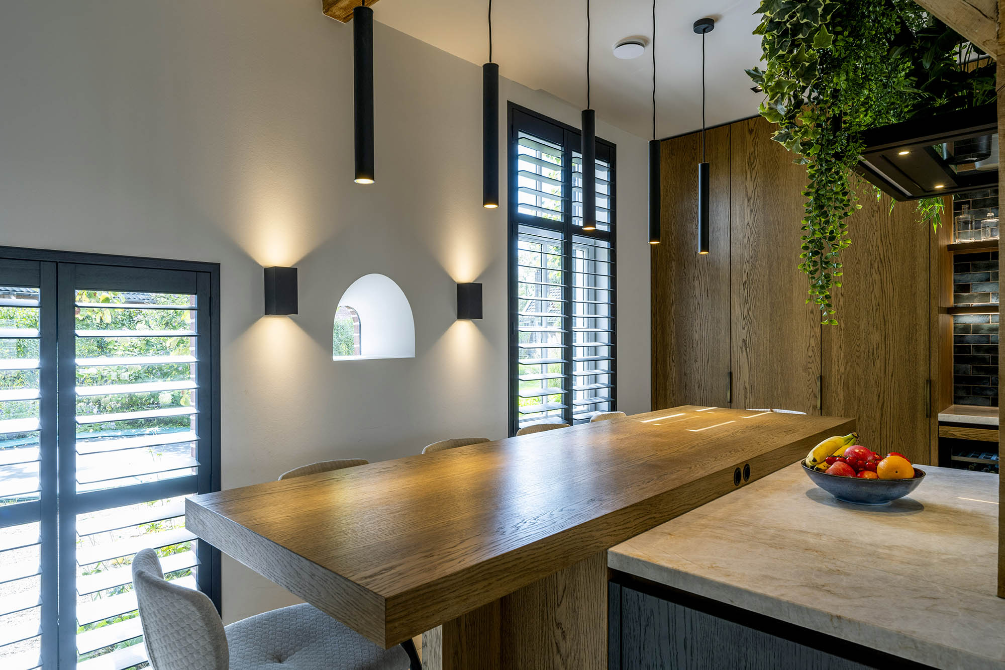 De royale hal met deels een glazen dak en vide geeft meteen een gevoel van ruimte en licht. De moderne leefkeuken vormt het hart van het huis: een plek om samen te komen, met een riant kookeiland met bar en grenzend aan het eetgedeelte de gashaard. Grote raampartijen en hoge plafonds zorgen voor een spectaculaire sfeer en lichtinval. Vanuit de keuken loopt u door naar de woonkamer, met open haard, schuifpuien naar de tuin. Daarnaast zijn er op de begane grond een praktische bij/waskeuken met stortkoker voor de was, een werkkamer en een extra kamer die ideaal is als speel-en/of logeerkamer.