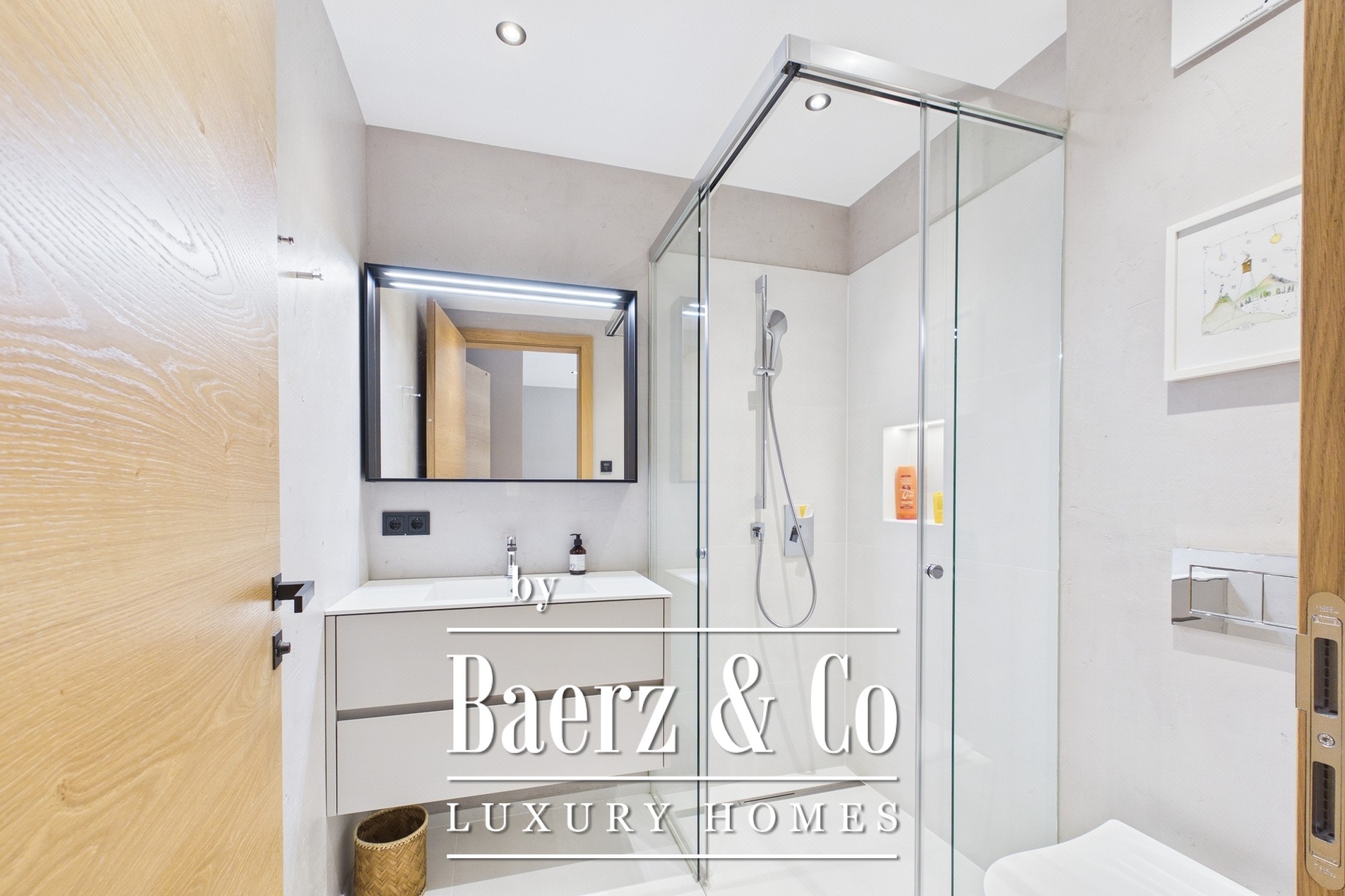 Expansive outdoor spaces are woven into the apartment’s design, including approximately 95 m² of terraces, balcony, and landscaped zones that invite quiet reflection. The living environment is enhanced by thoughtful amenities such as a fireplace, floor heating, smart home system, electric blinds, and an integrated alarm system. Additional offerings include a covered parking space with electric vehicle charging, an outdoor parking bay, and an 8.5 m² storage cellar equipped for winter sports and laundry needs.