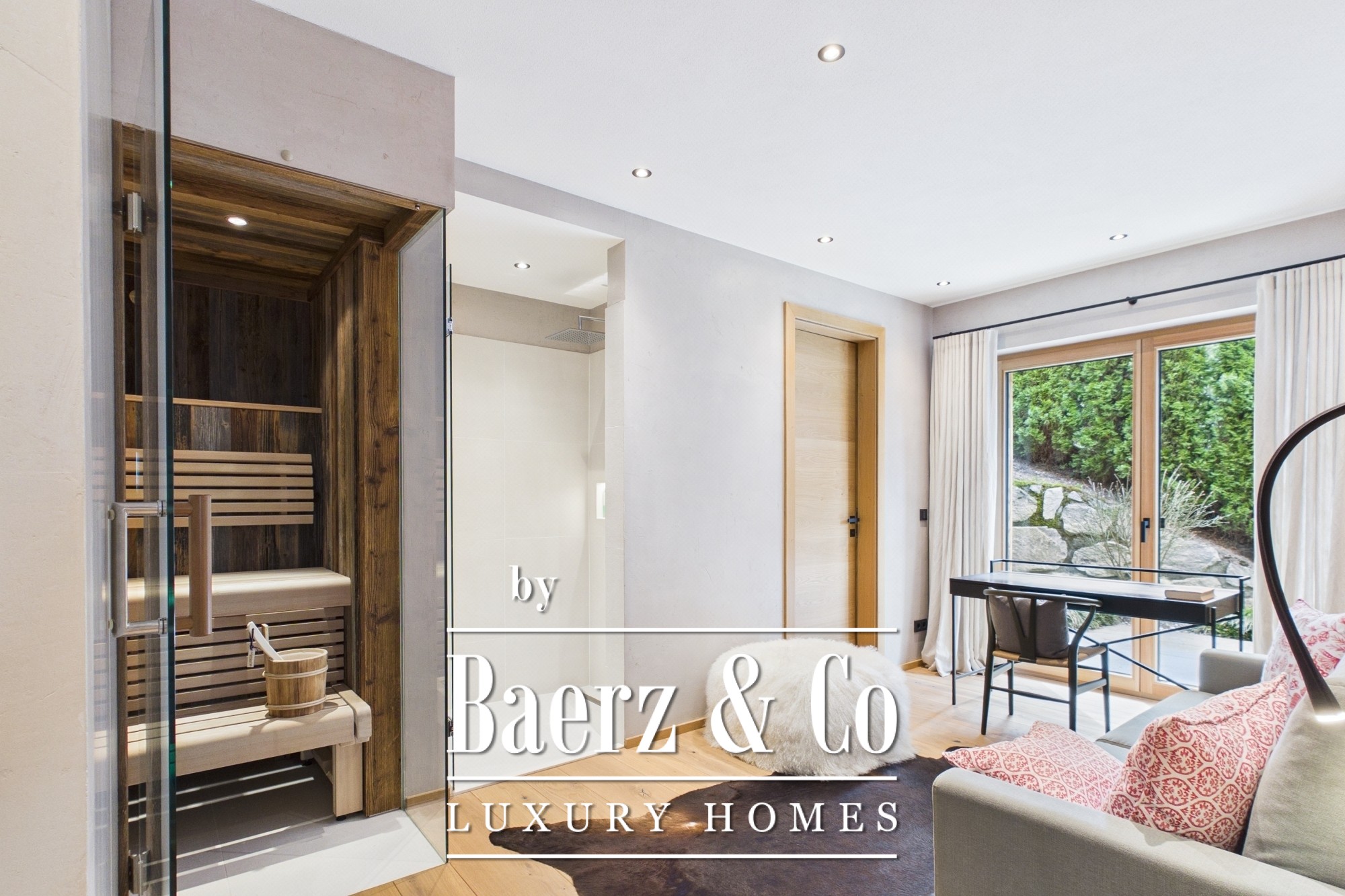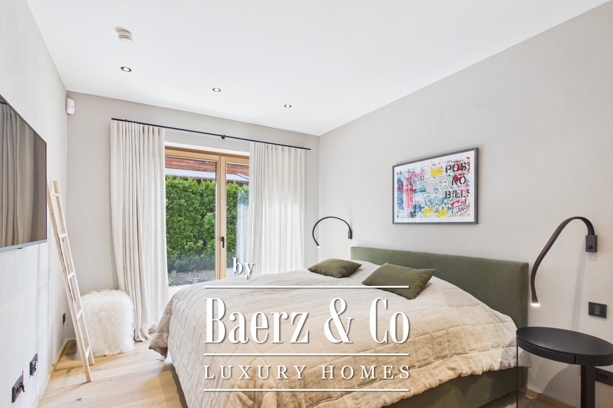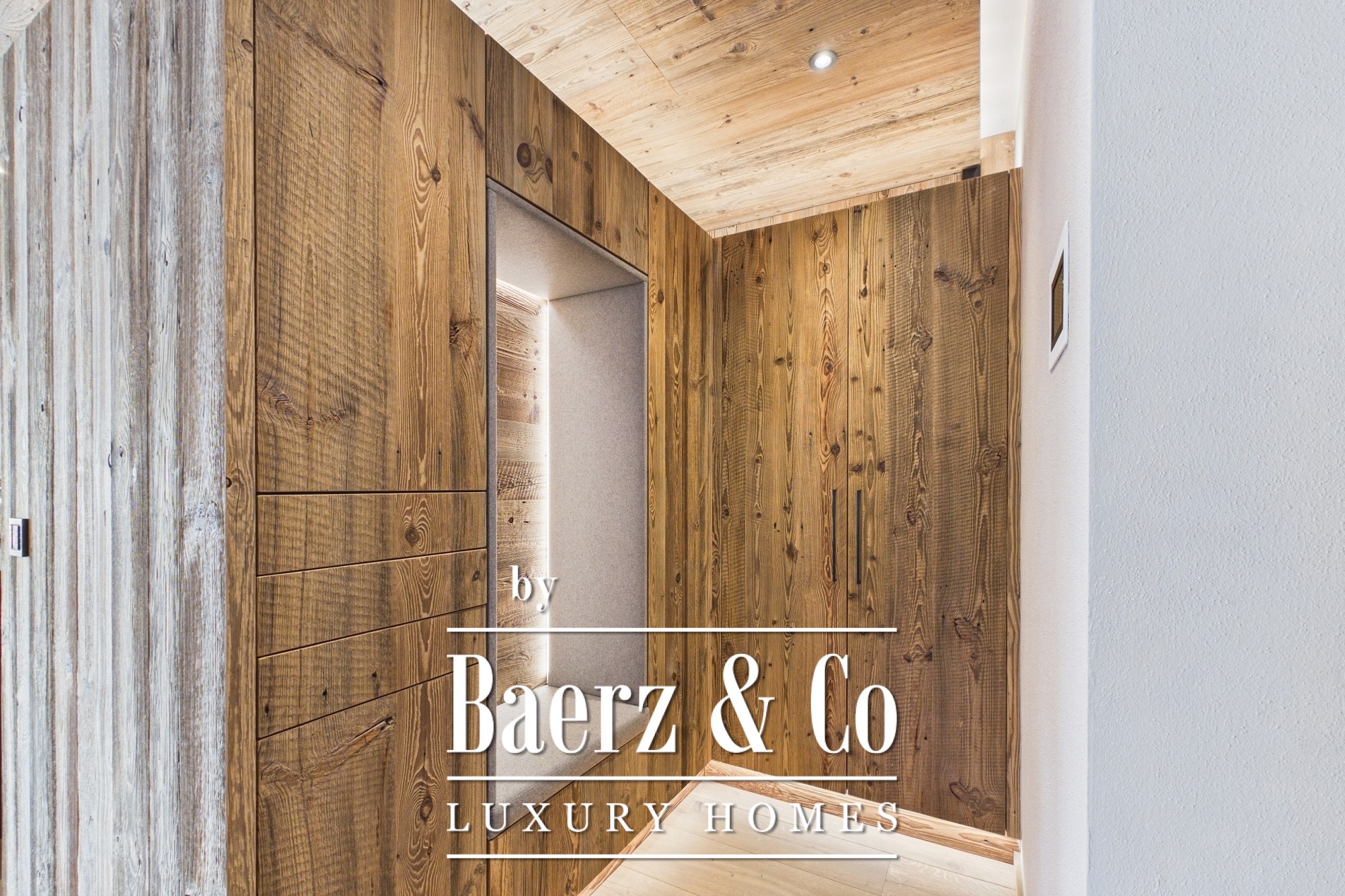 Apartment Kirchberg in Tirol offers a refined living experience at the end of a quiet cul-de-sac, set slightly elevated with close proximity to ski slopes and the town center. Encompassing a generous 135 m² of living area, this residence is distinguished by three rooms each with en-suite bathrooms, two configured as bedrooms, and a large wellness room complete with sauna. An open-plan living, dining, and kitchen area becomes the social heart of the home, featuring reclaimed wood ceilings and a custom-built kitchen fitted with Miele appliances.