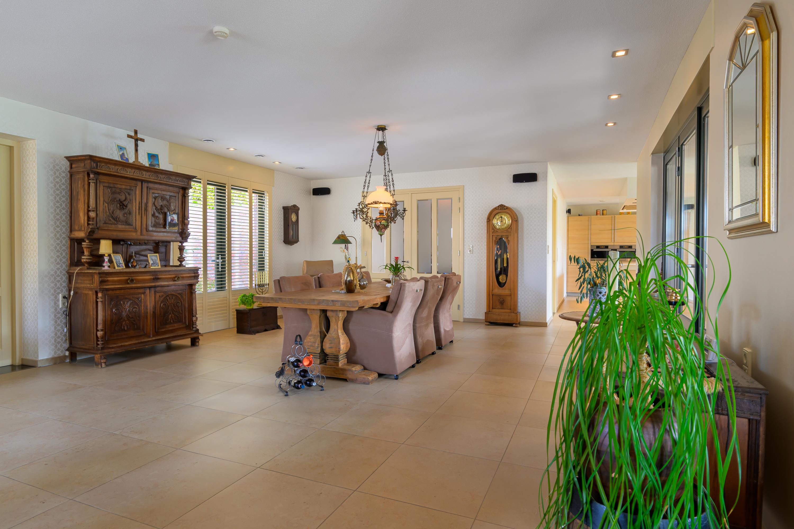 Deze luxe afgewerkte woning is gebouwd in een U-vorm met een sfeervolle binnenplaats. Aan de linkerzijde ligt het woongedeelte. Bij binnenkomst in de royale hal valt direct de prachtige plavuizenvloer op, samen met de meterkast, trapopgang naar de eerste verdieping en een stijlvol toilet met fonteintje. Vanuit de hal komen we in de ruime woonkamer, gekenmerkt door strak gestucte wanden, inbouwspots en openslaande tuindeuren naar de binnenplaats. Warme kleuren, zachte stoffen en naturel materialen; allemaal ingrediënten die bijdragen aan een huiselijk 'ik kom thuis'-gevoel. Dit alles vind je zeker terug in deze prachtige woonkamer. Alles is netjes, maar vooral sfeervol en luxe afgewerkt.