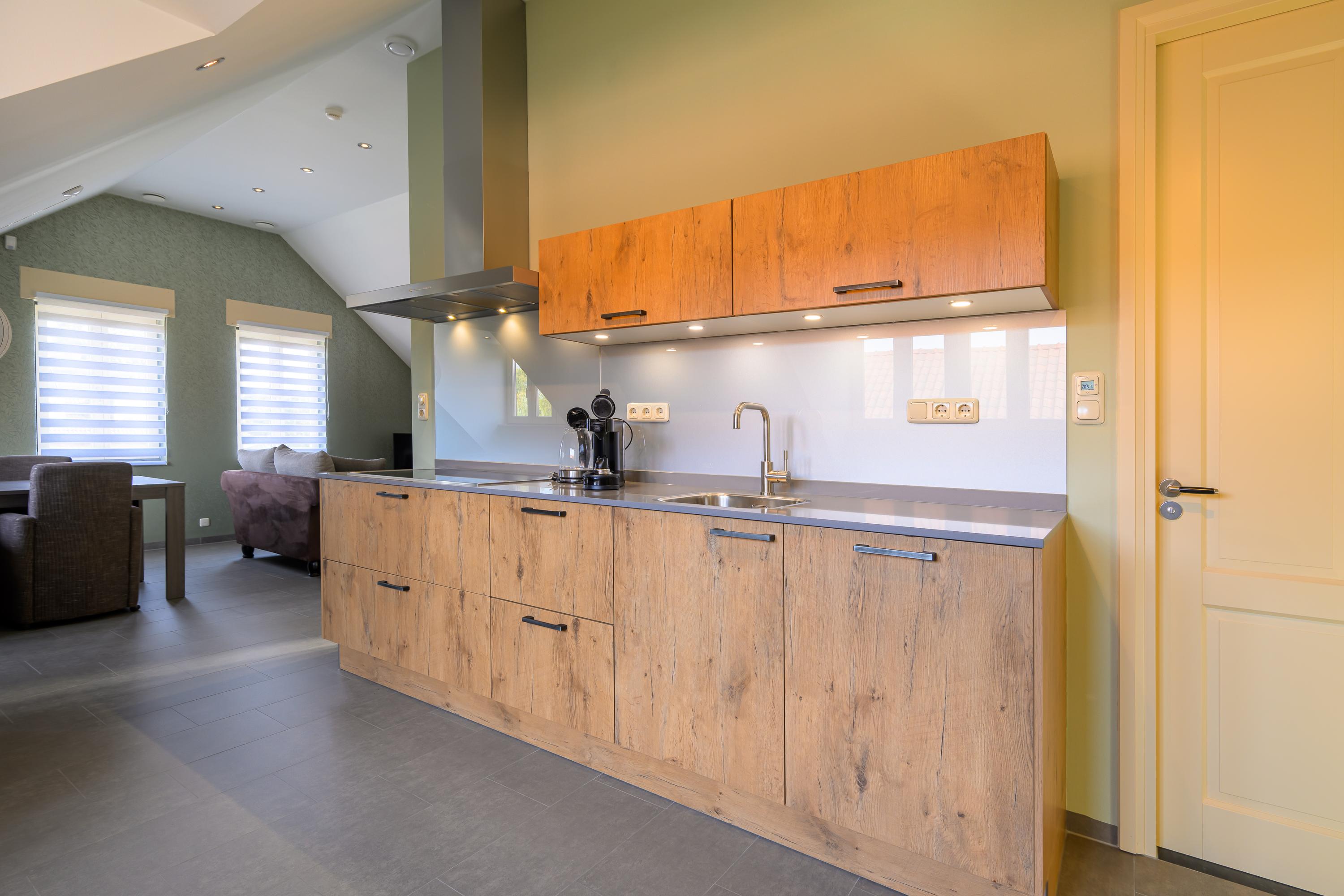 Dankzij de open verbinding tussen de keuken en zowel het eet- als het leefgedeelte is er genoeg ruimte om gezellig met het hele gezin samen te zijn. De moderne halfopen keuken is geplaatst in een praktische wandopstelling, aangevuld met een kookeiland, waardoor je over meer dan voldoende werk- en opbergruimte beschikt. Daarnaast is het geheel voorzien van alle wenselijke inbouwapparatuur, zoals: een inductiekookplaat, spoelbak, vaatwasser, stoomoven, combimagnetron en koelkast. De keuken heeft veel daglicht en biedt een mooi uitzicht op de tuin. Aangrenzend bevindt zich de bijkeuken, voorzien van een hoekopstelling met koelkast, combi-oven, ingebouwde grill en frituurpan, en een afzuigkap. Er is tevens een handige provisieruimte.