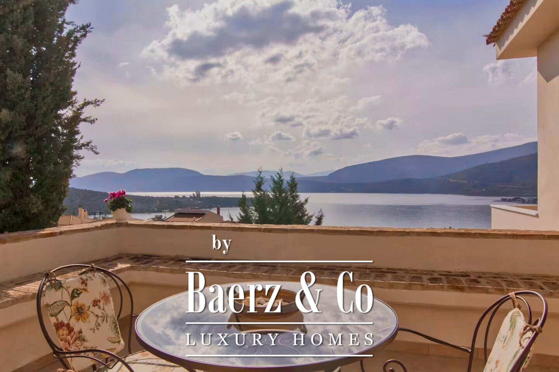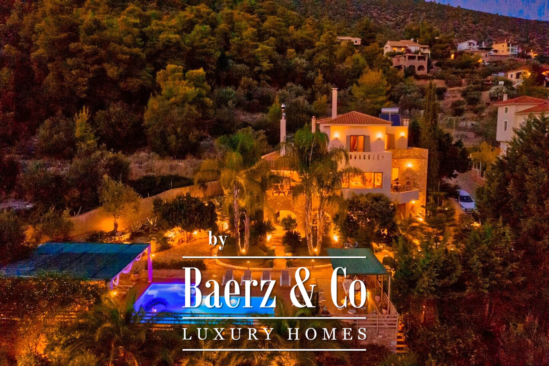 In the beautiful seaside village of Korfo, Corinthia, just 250 meters from the sea, an impressive three-level villa of high aesthetics with a total area of 335 sq.m. is available for sale, set within a private plot of 1,700 sq.m.