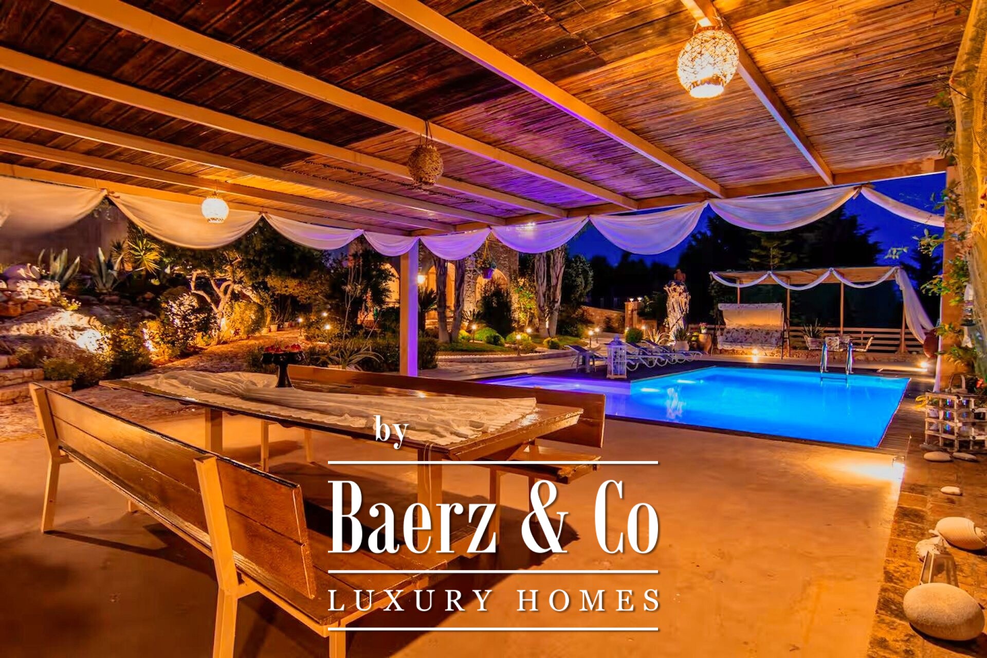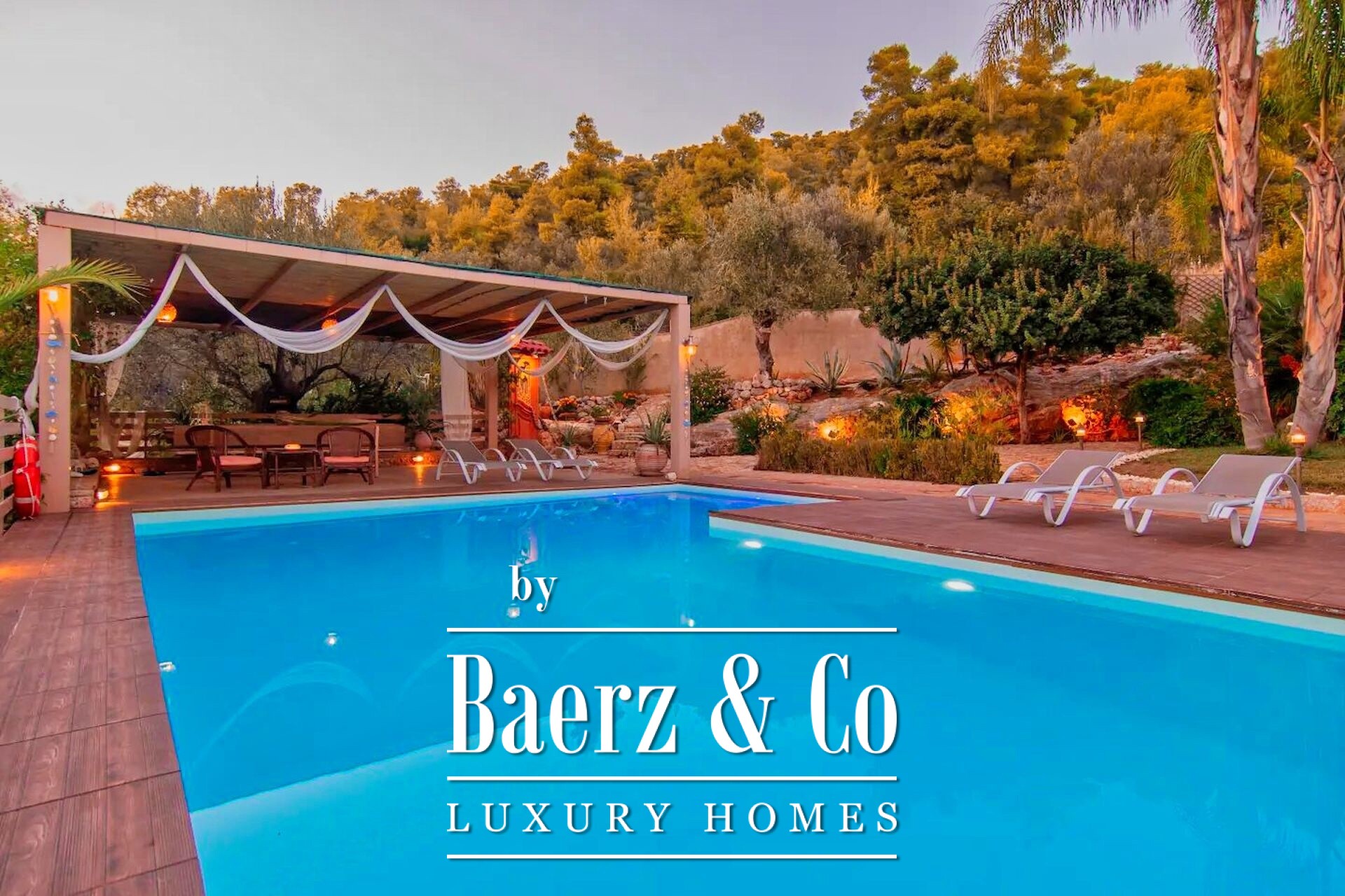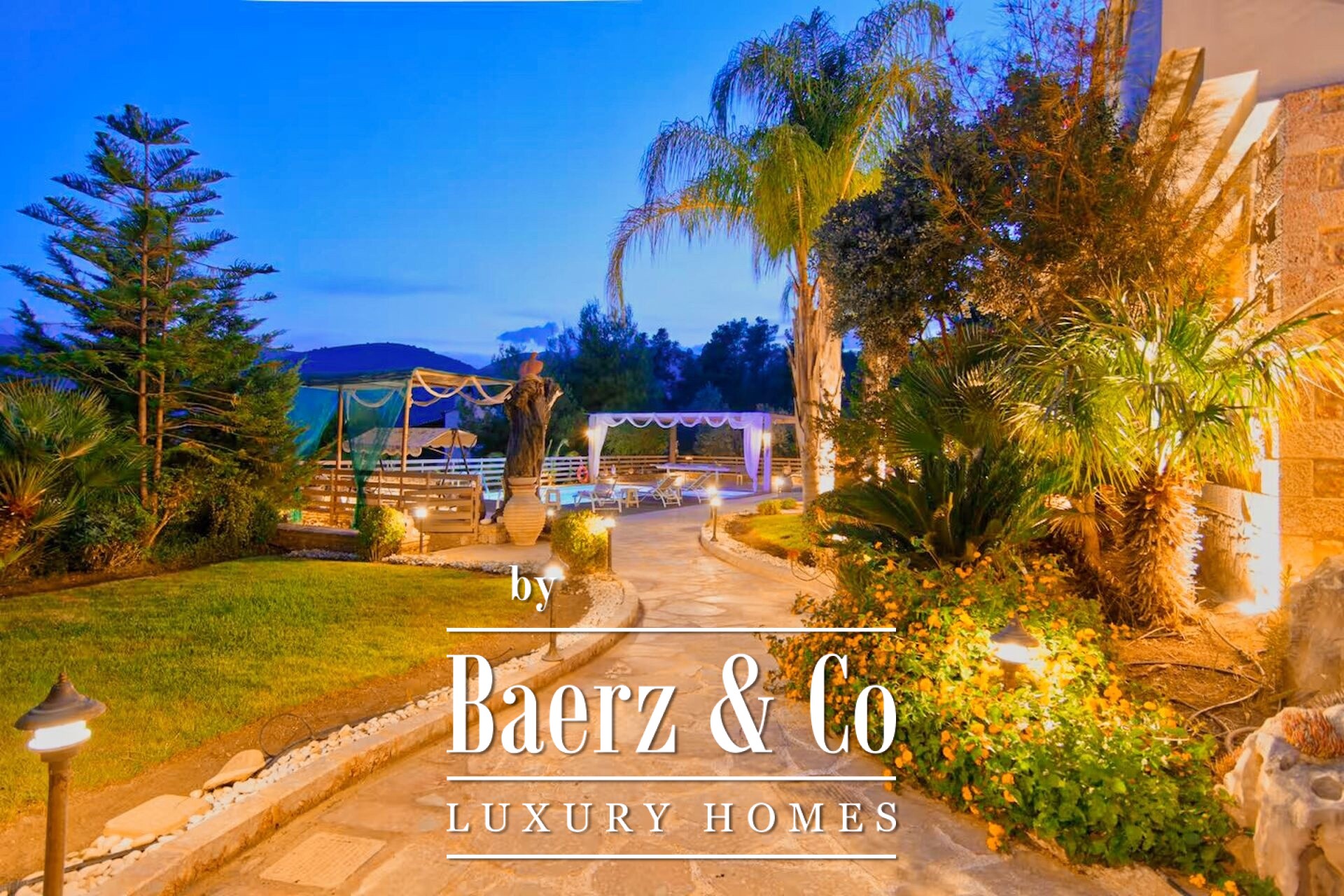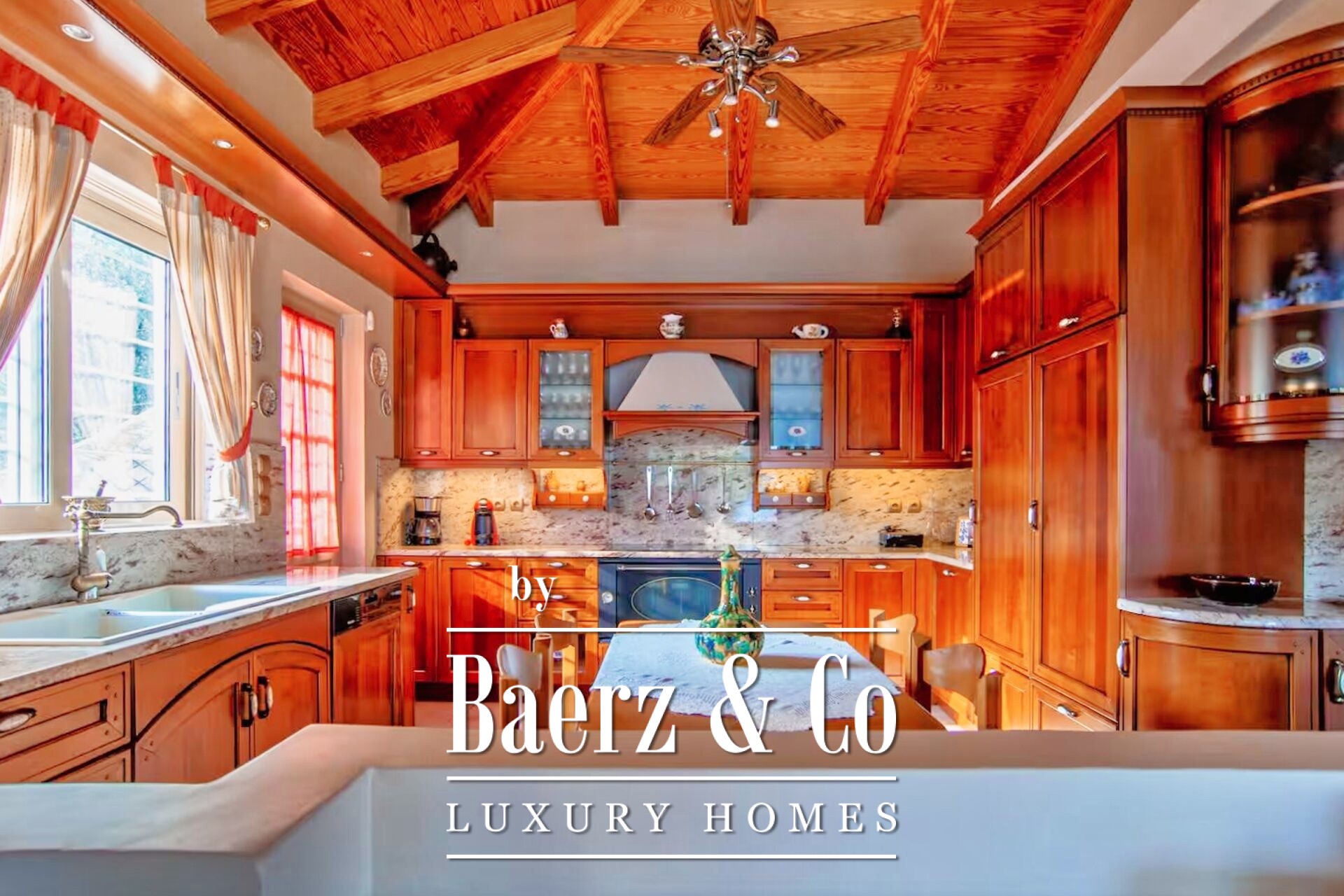 The outdoor area is fully landscaped with a garden, stone paving, an outdoor swimming pool of 52 sq.m., a covered BBQ area, a 50 sq.m. pergola, parking space for a boat, a 23 sq.m. utility room for the boiler and pool machinery, and storage rooms with a total area of 63.7 sq.m.